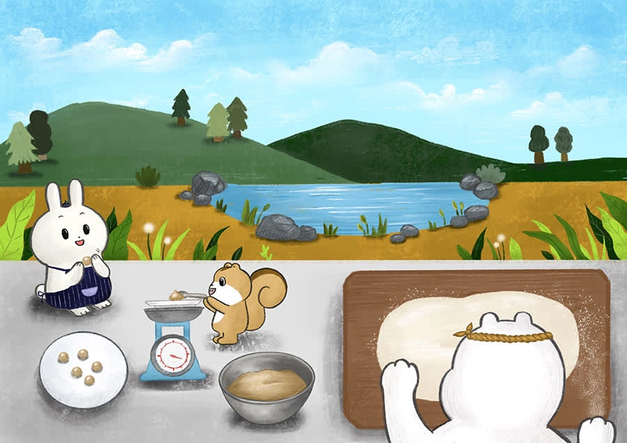 Picture book illustration depicting animal characters cooking in the background of the forest.