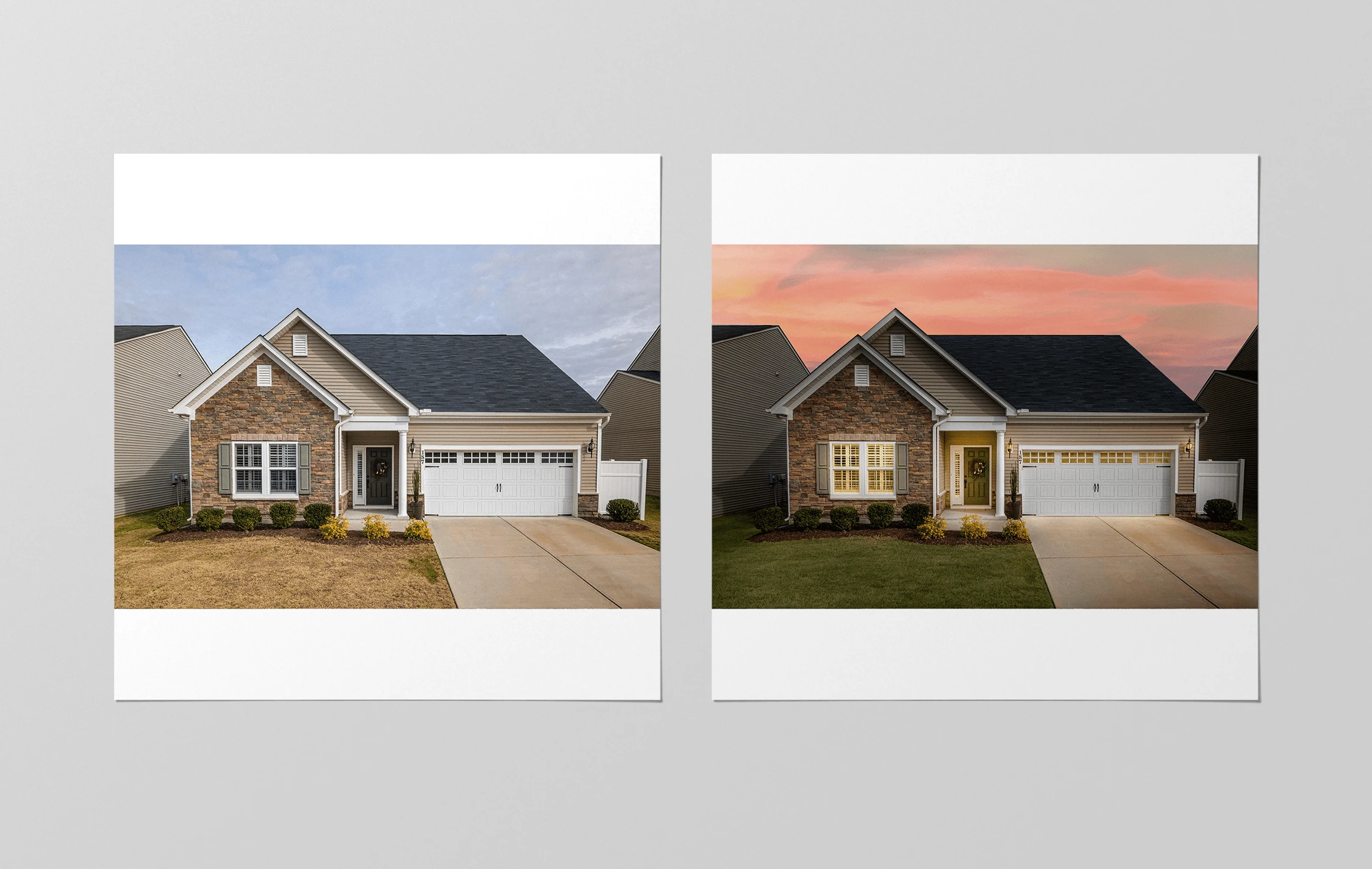 Real Estate Photo Edting, Day to Dusk Conversion, transforming a daytime photograph of a property into a stunning dusk or twilight scene.