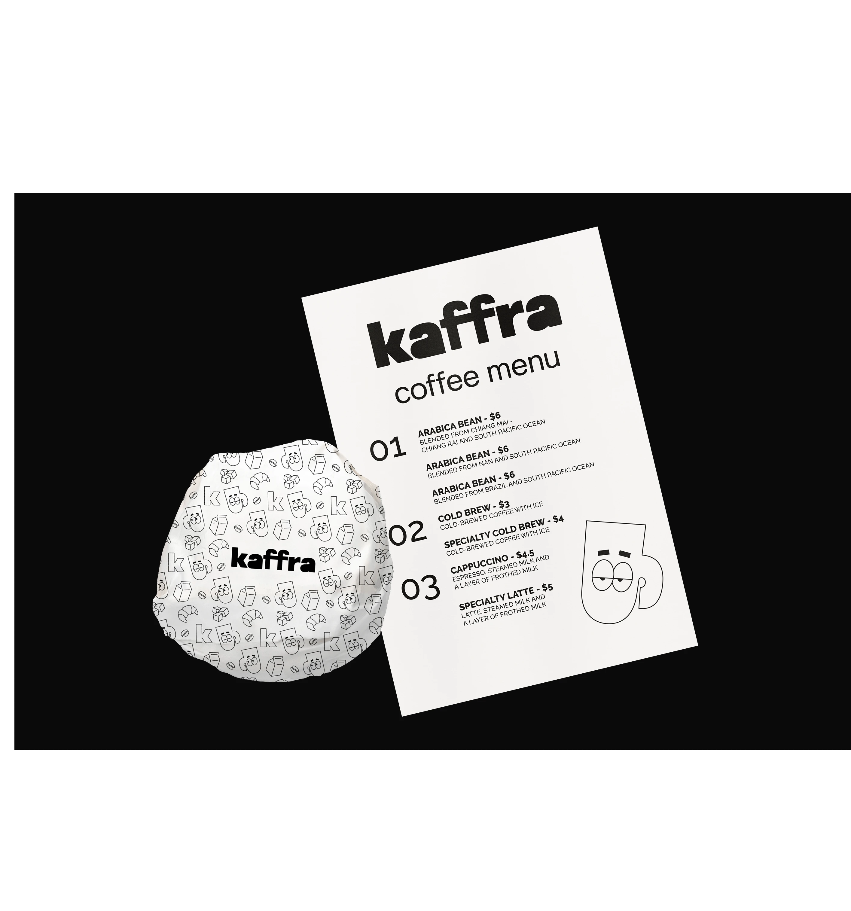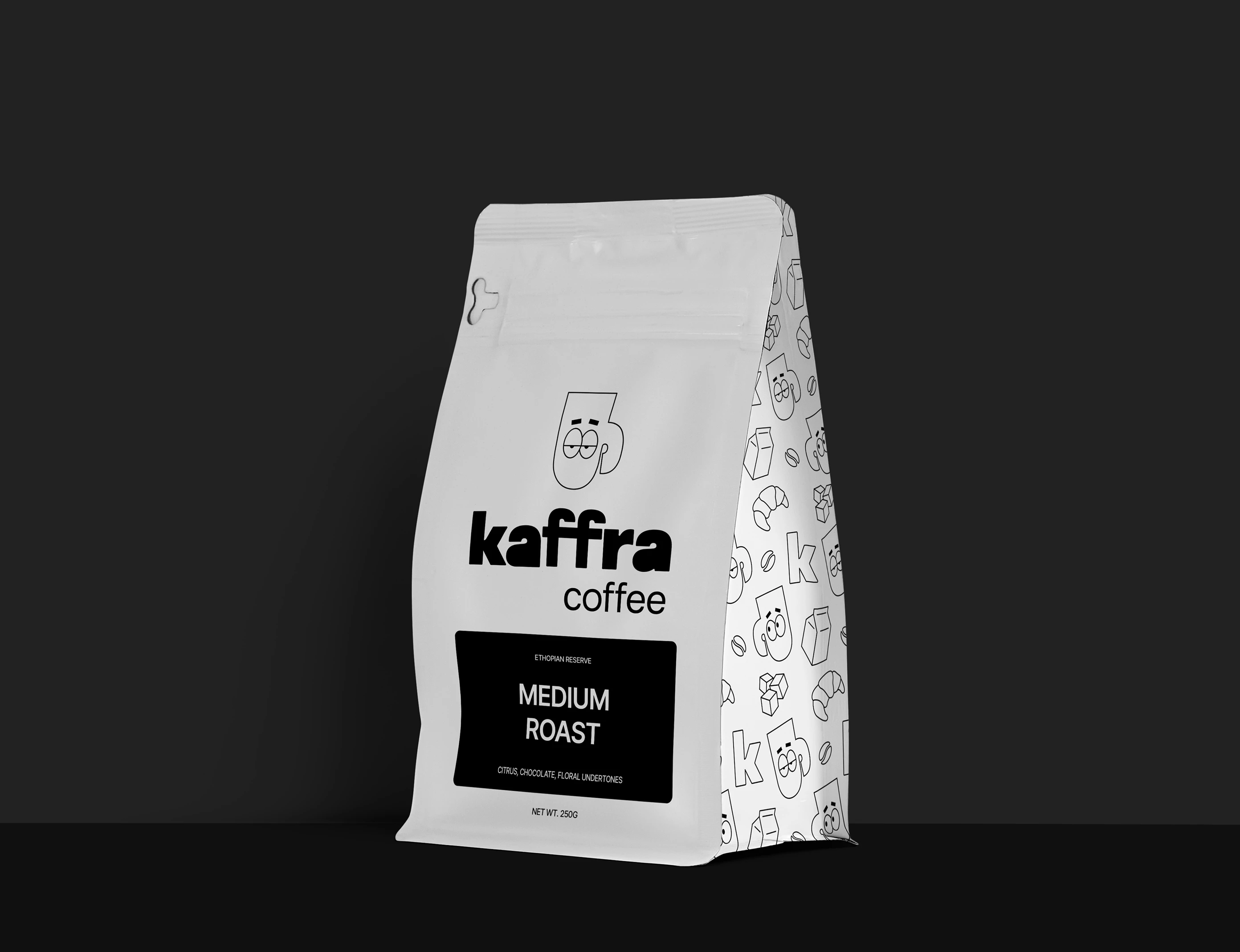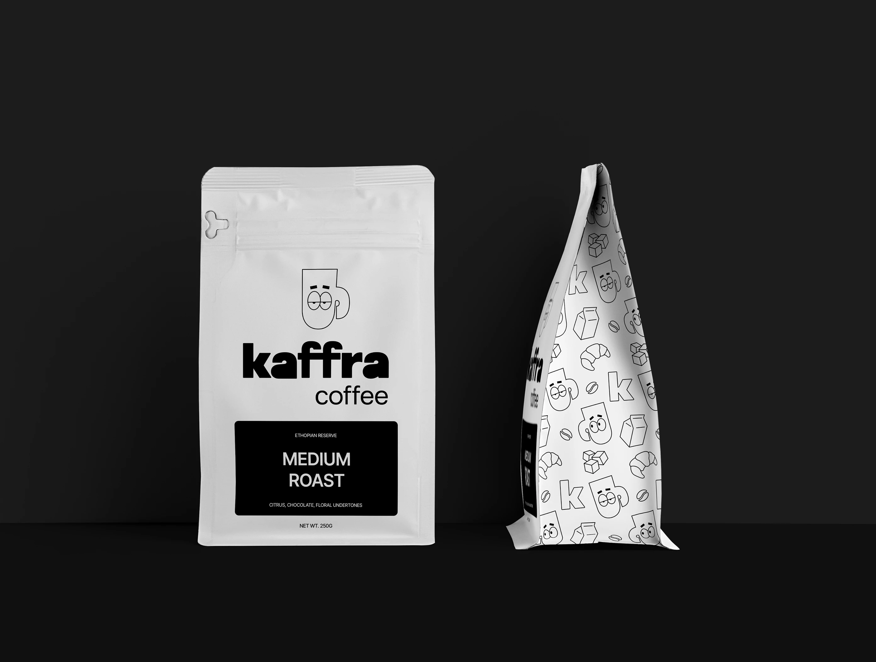 Kaffra is a modern coffee brand rooted in Ethiopian heritage, envisioned for bold, adventurous coffee lovers. With sleek monochromatic branding paired with playful illustrations, the identity brings flavor, culture and style to every cup. My role was to develop the full visual identity and packaging system creating a brand that feels grounded in origin yet fresh, elevated, and resonant with younger audiences.