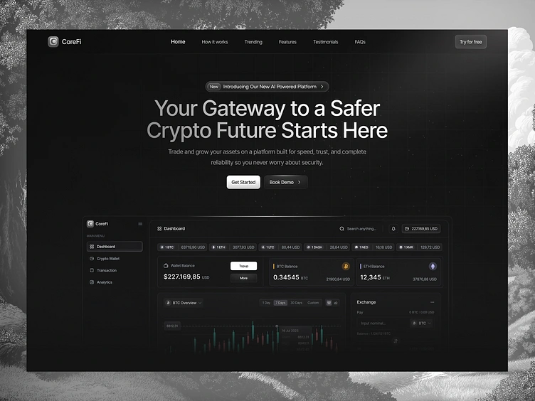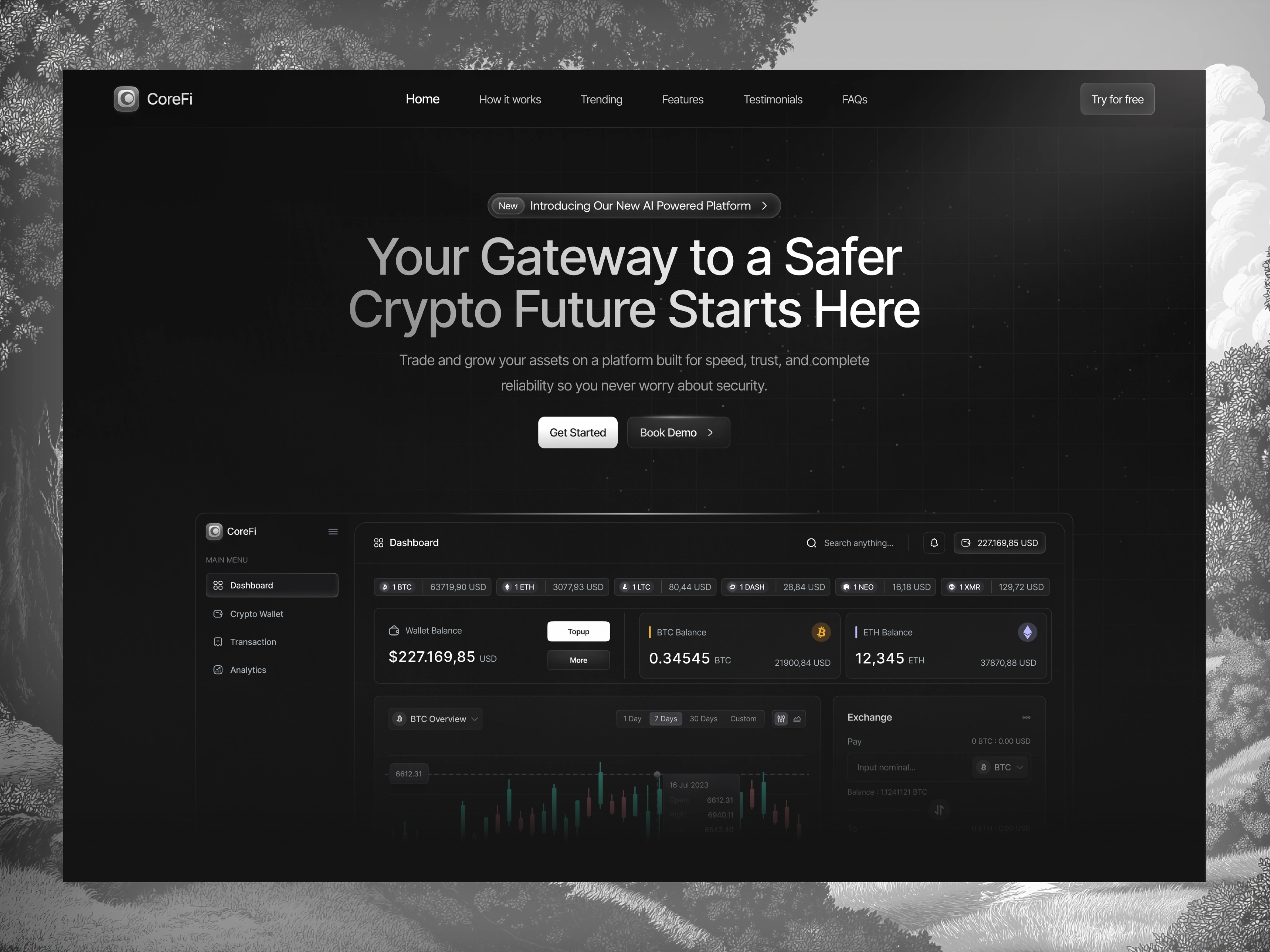 This is the hero design I created for Corefi (a fictional brand). I chose a dark theme with light accents and incorporated a trendy grid pattern in the bg.