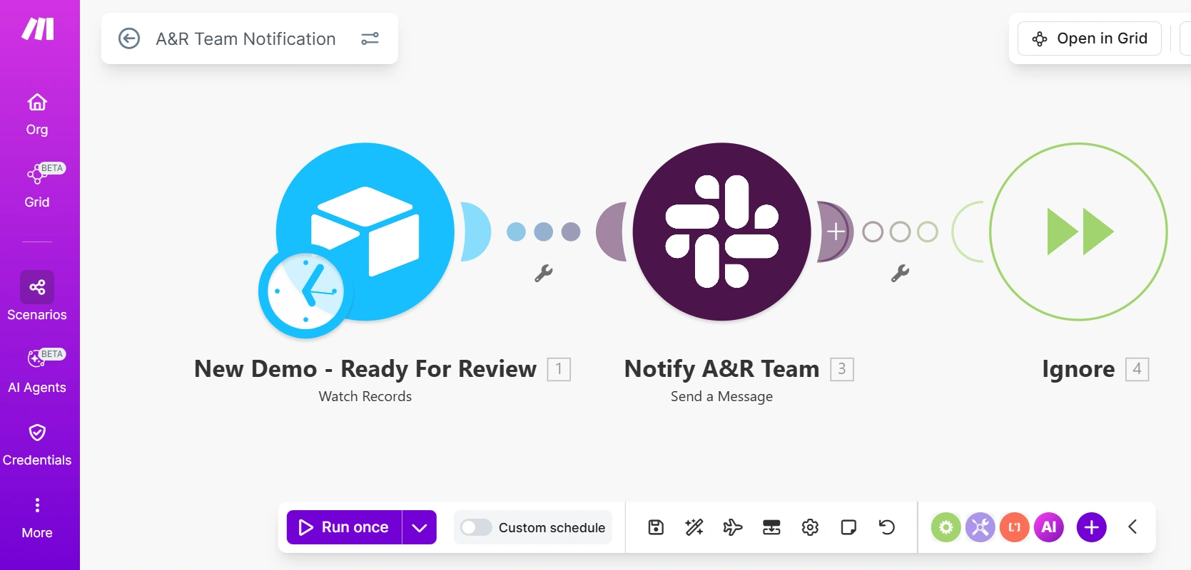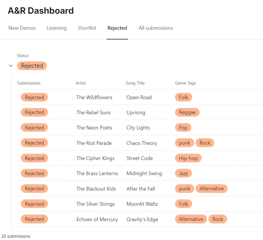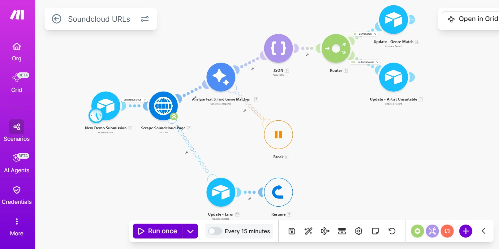 The automation handles intake, metadata scraping, AI analysis, database updates, and Slack notifications in a single pipeline. The system originally supported SoundCloud, Bandcamp, and raw file uploads - after Bandcamp locked down their API, the client opted to streamline to SoundCloud-only submissions.