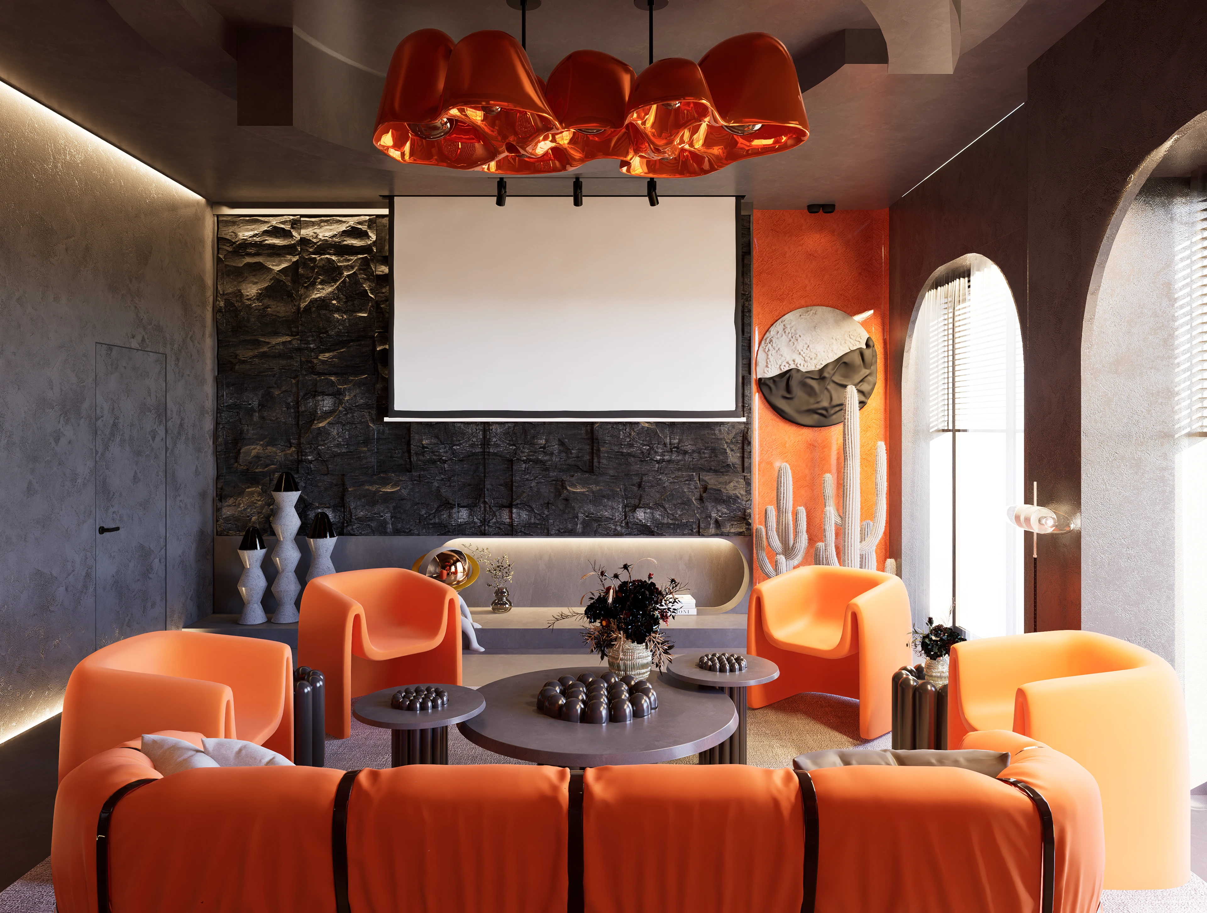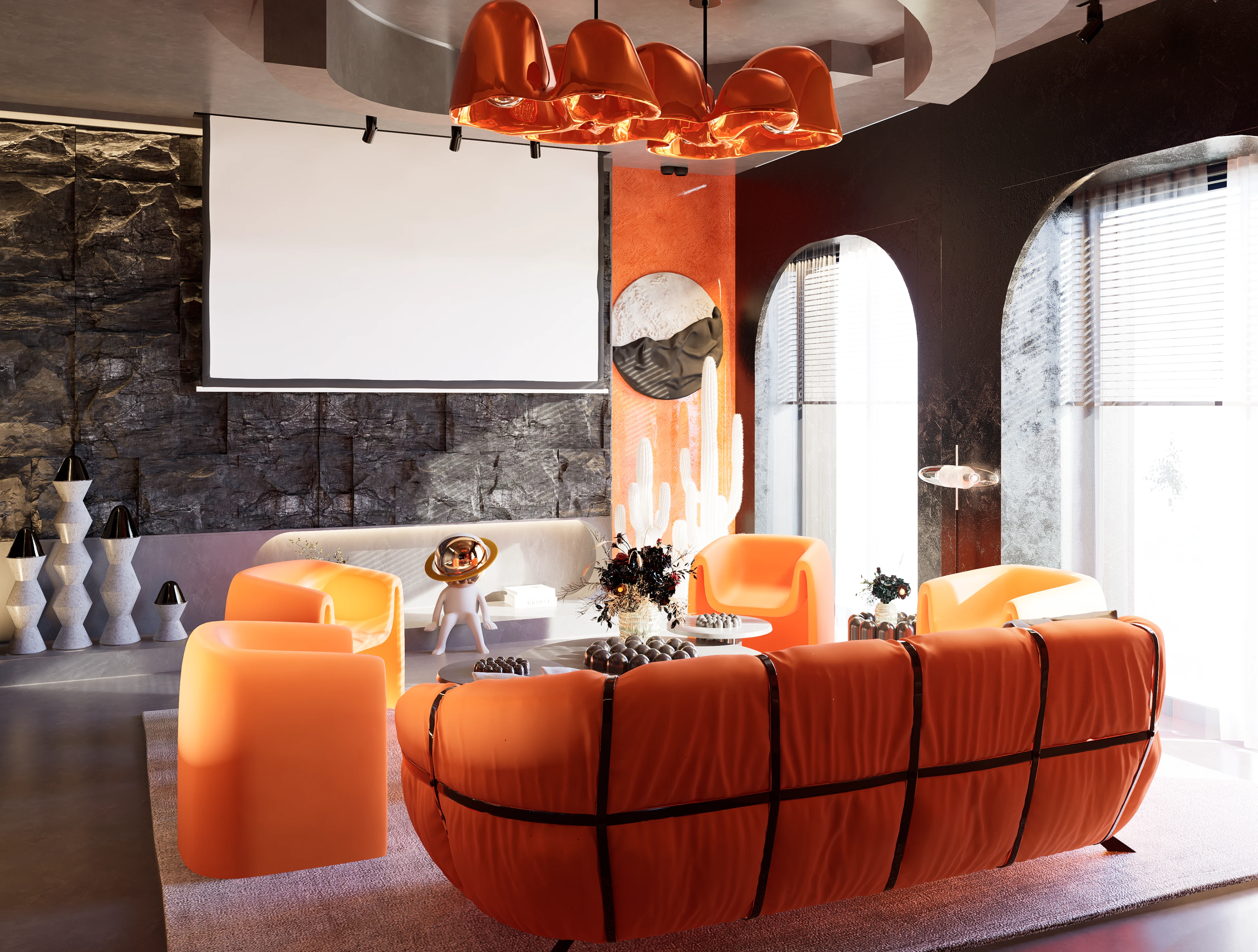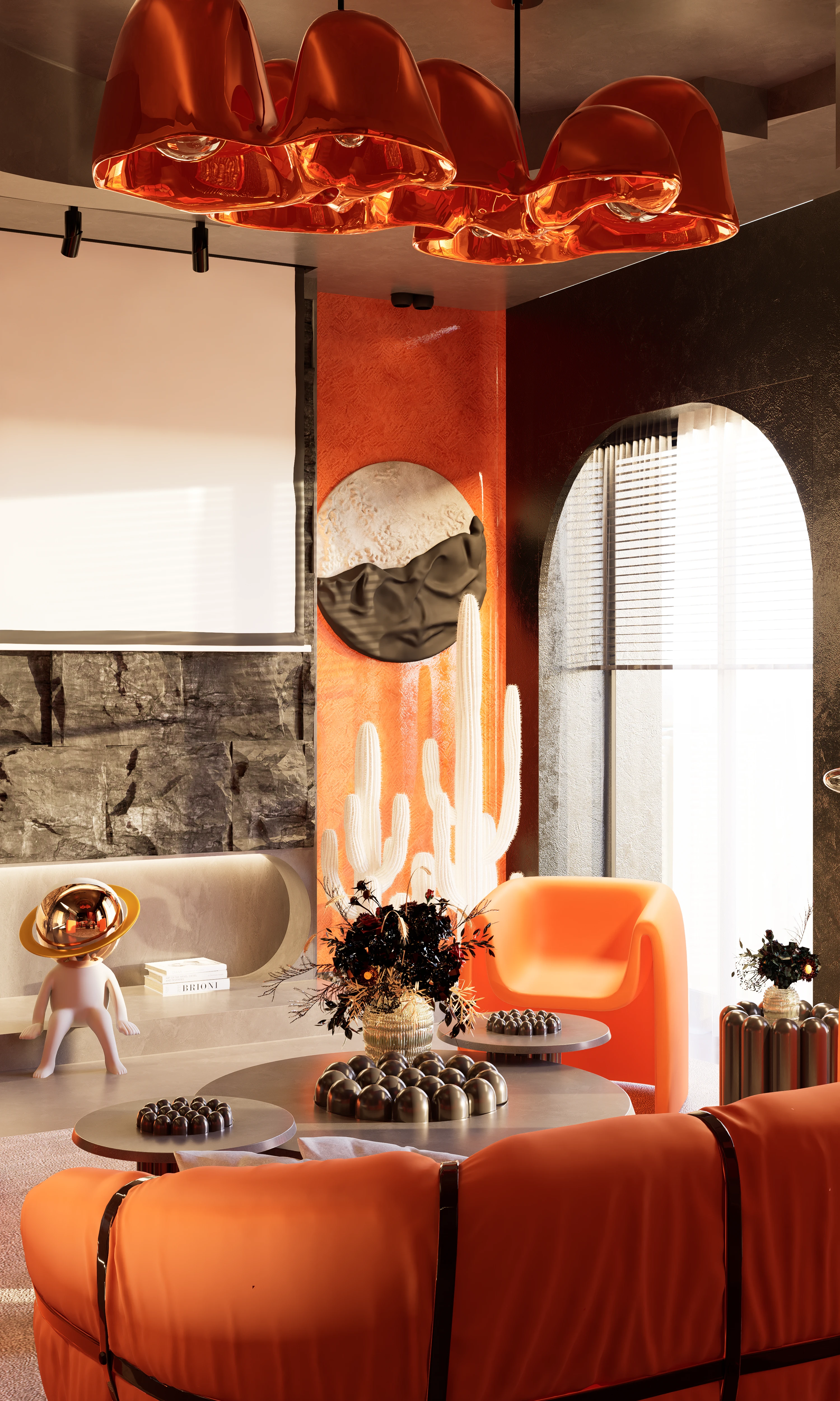Rizwan's lounge meant to reflect the clients love for the color orange keeping in mind his modern contemporary aesthetics and love for raw textures.