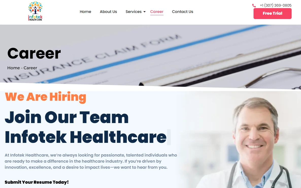 I independently led the end-to-end development of the InfoTech Healthcare website, delivering a comprehensive digital presence tailored to the healthcare staffing and IT solutions industry.