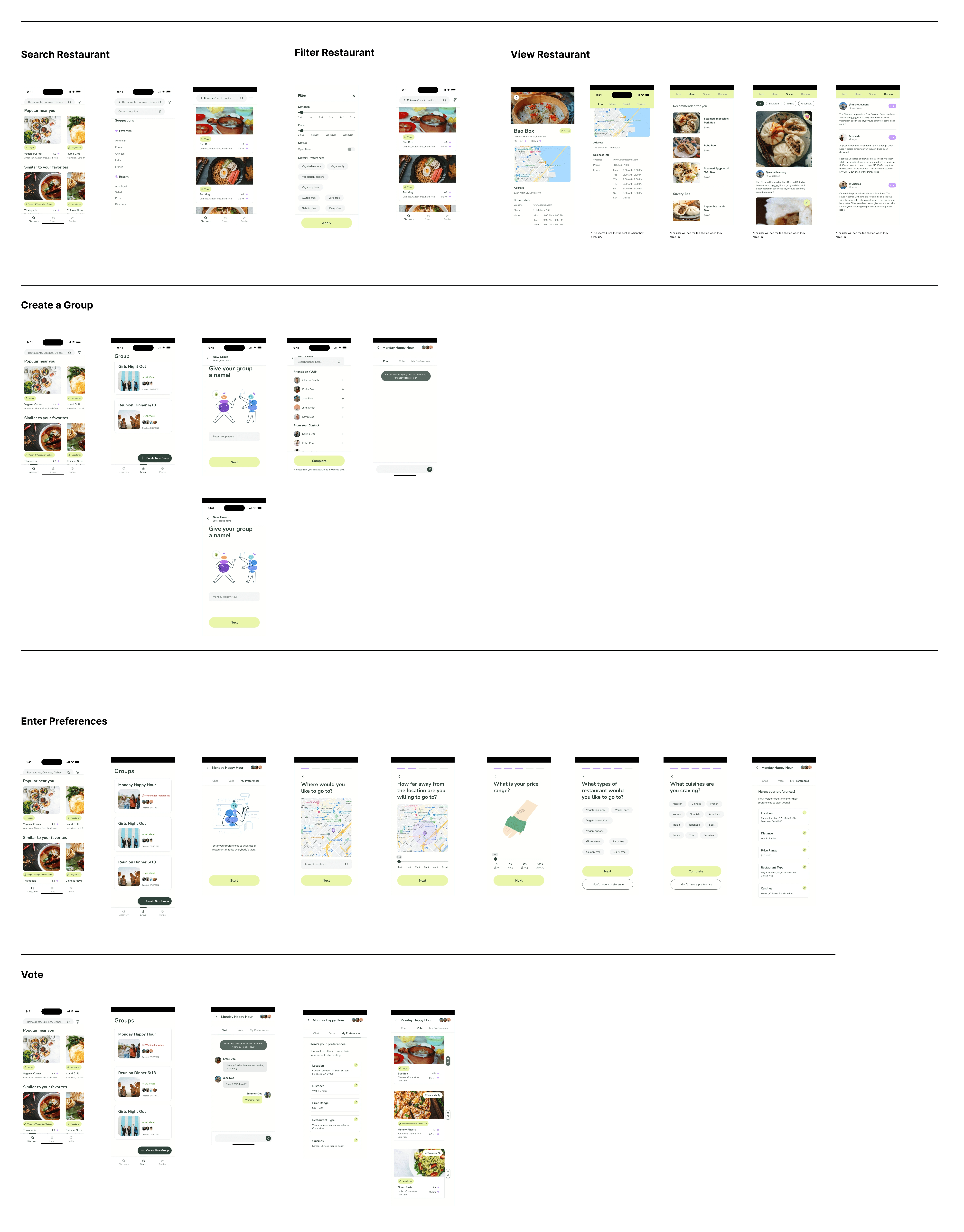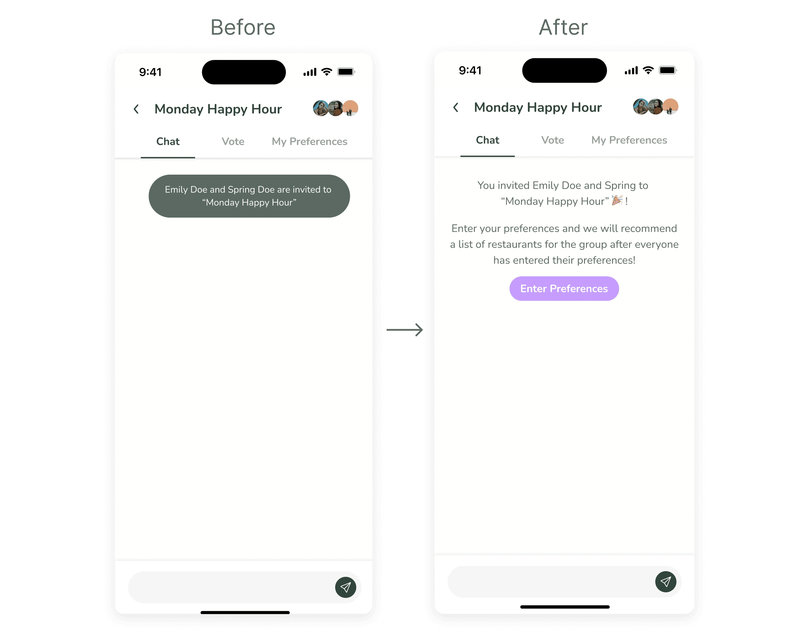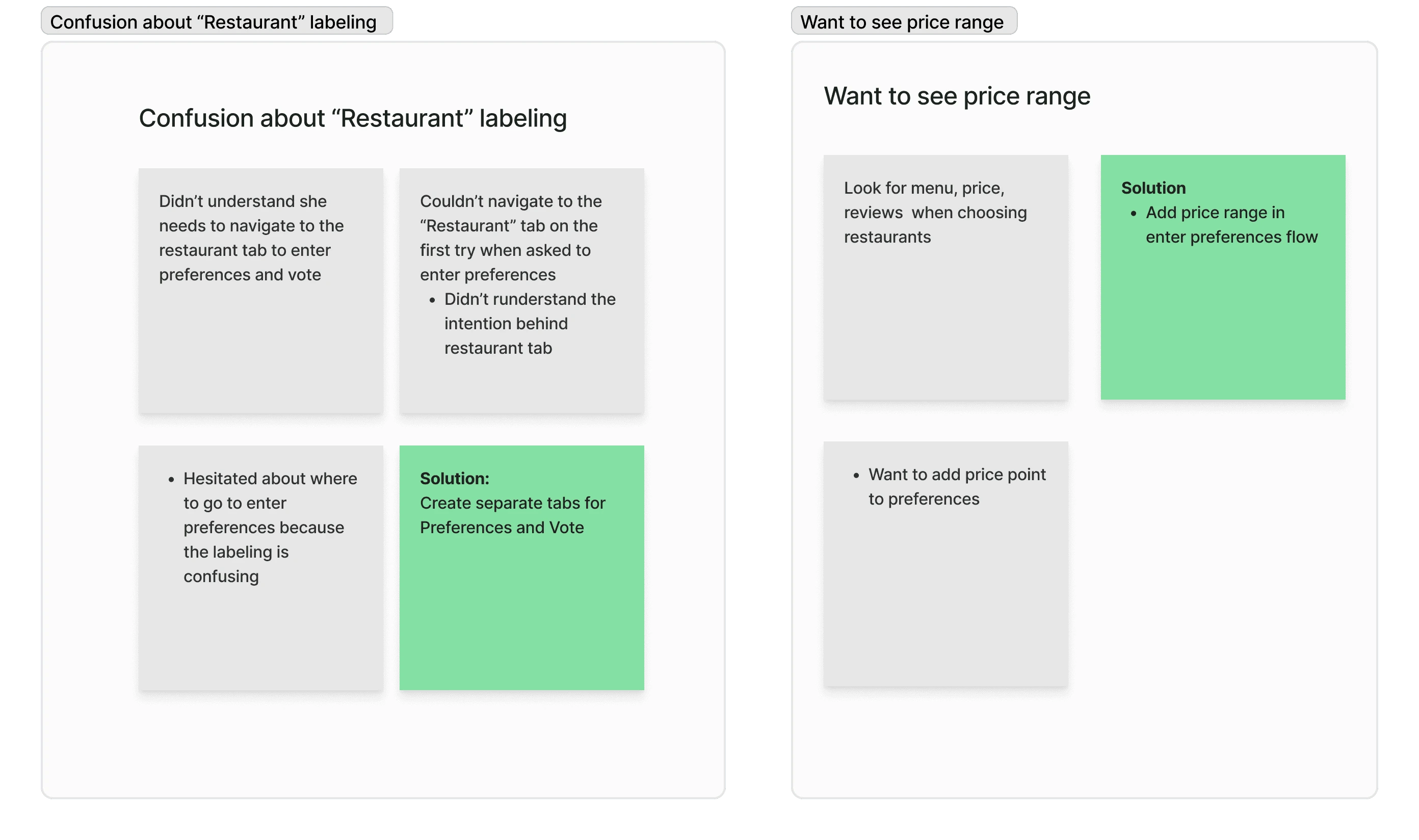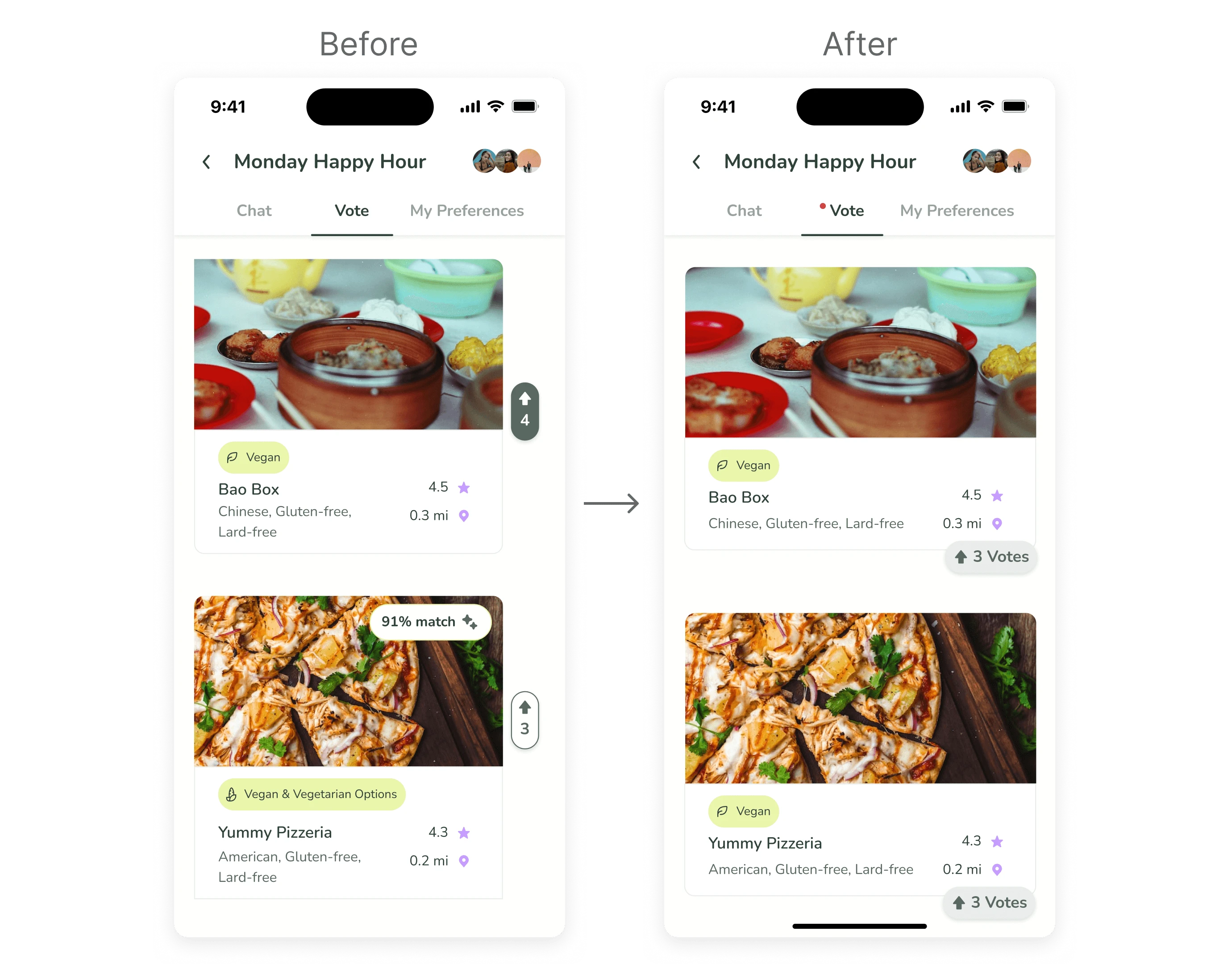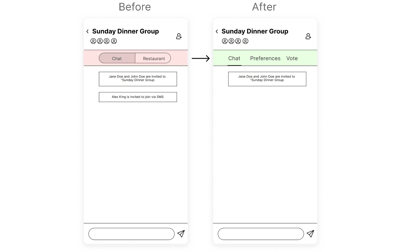 Users had difficulty understanding the purpose of the "Restaurant" tab, which is where they can enter preferences and vote for restaurants. To address this, I separated the two tabs and provided clear labels to help users easily locate and perform the desired actions.