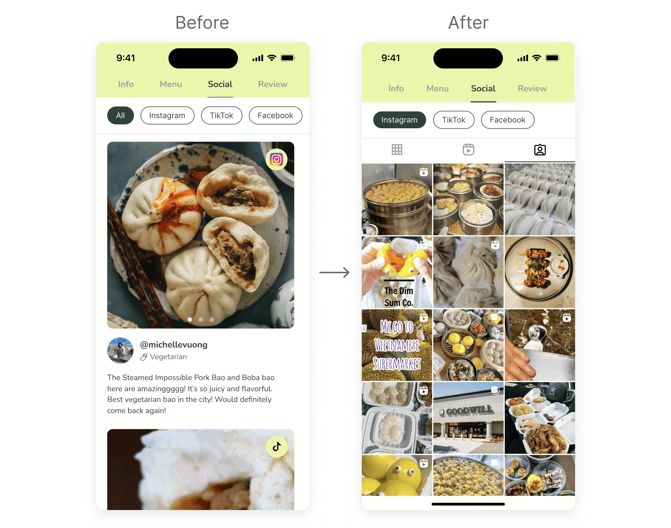 In my usability testing, many users expressed confusion about where the social media content comes from. In addition, I also consulted an engineer about the feasibility of the design and I realized that aggregating all the social media content and building an in-app social feed is technically too complicated for an MVP product.