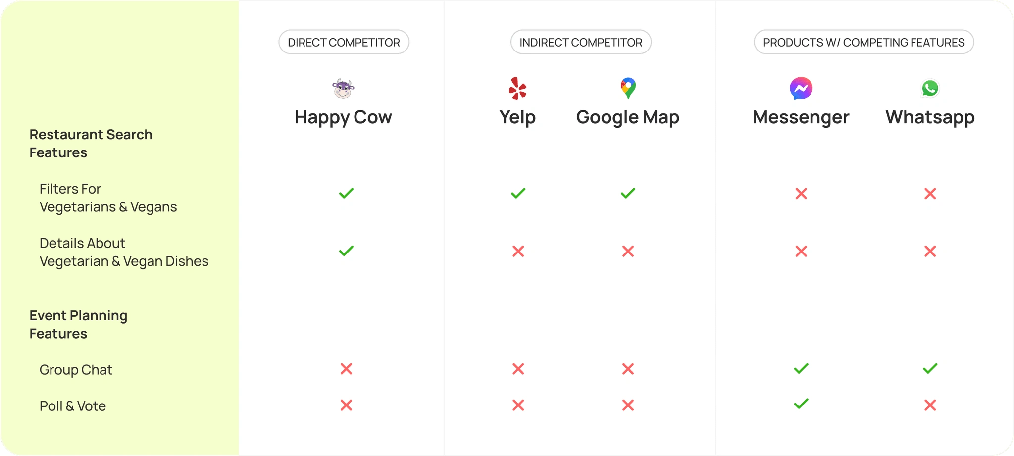 Vegans & vegetarians usually switch between 3-5 apps to research and plan whenever they dine out with others. These apps include Yelp, Google Maps, iMessage, Messenger, Instagram, TikTok, etc.