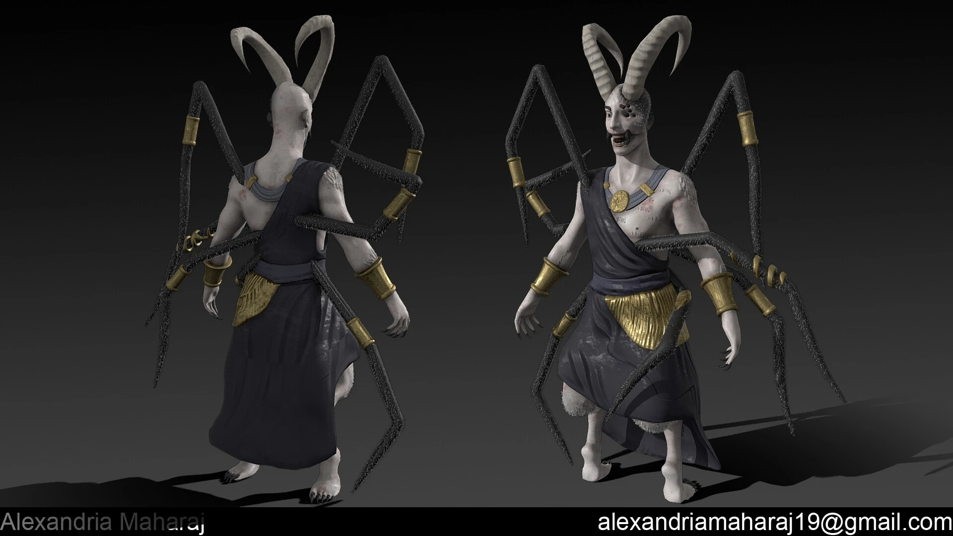 I've had the pleasure of working on this incredibly interesting character for my client, Chaim, who is currently developing an indie game called Warsze. This character combines the attributes of a human, spider legs/mandibles, ibex legs, raptor claws, and Babylonian-inspired clothing. I've finished the sculpt, now I'm retopologizing the geometry, and afterward, I'll complete his textures!