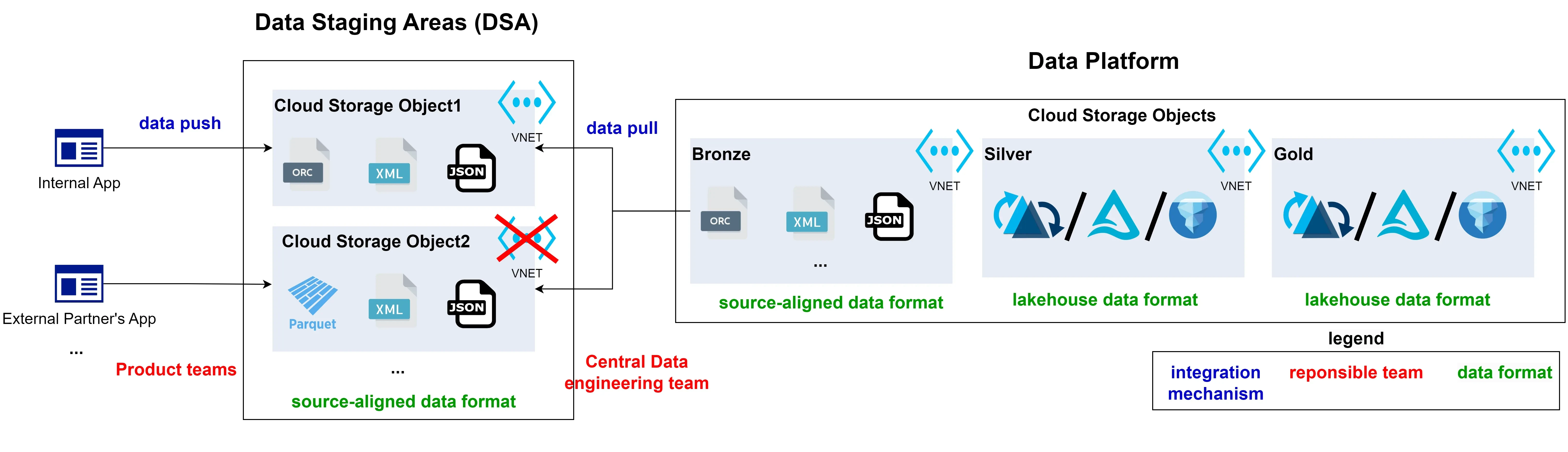 Responsibility separation. In order to scale storing data in a centrally managed solution, integrations sometimes need to be built by engineers creating client-facing applications. Considering that product teams usually just want to push data to a persistent layer, so it can be stored for historical analysis, data doesn’t need to be processed up till gold layer straightaway. In fact, it’s enough that data is initially stored in a source-aligned, raw format. However, since it’s not data engineers that would be building the integrations to the source systems here, they can’t be responsible for all of the operational support that those data integrations need. Hence, there is a need for a clear boundary of work delivered by product teams and data engineering teams.