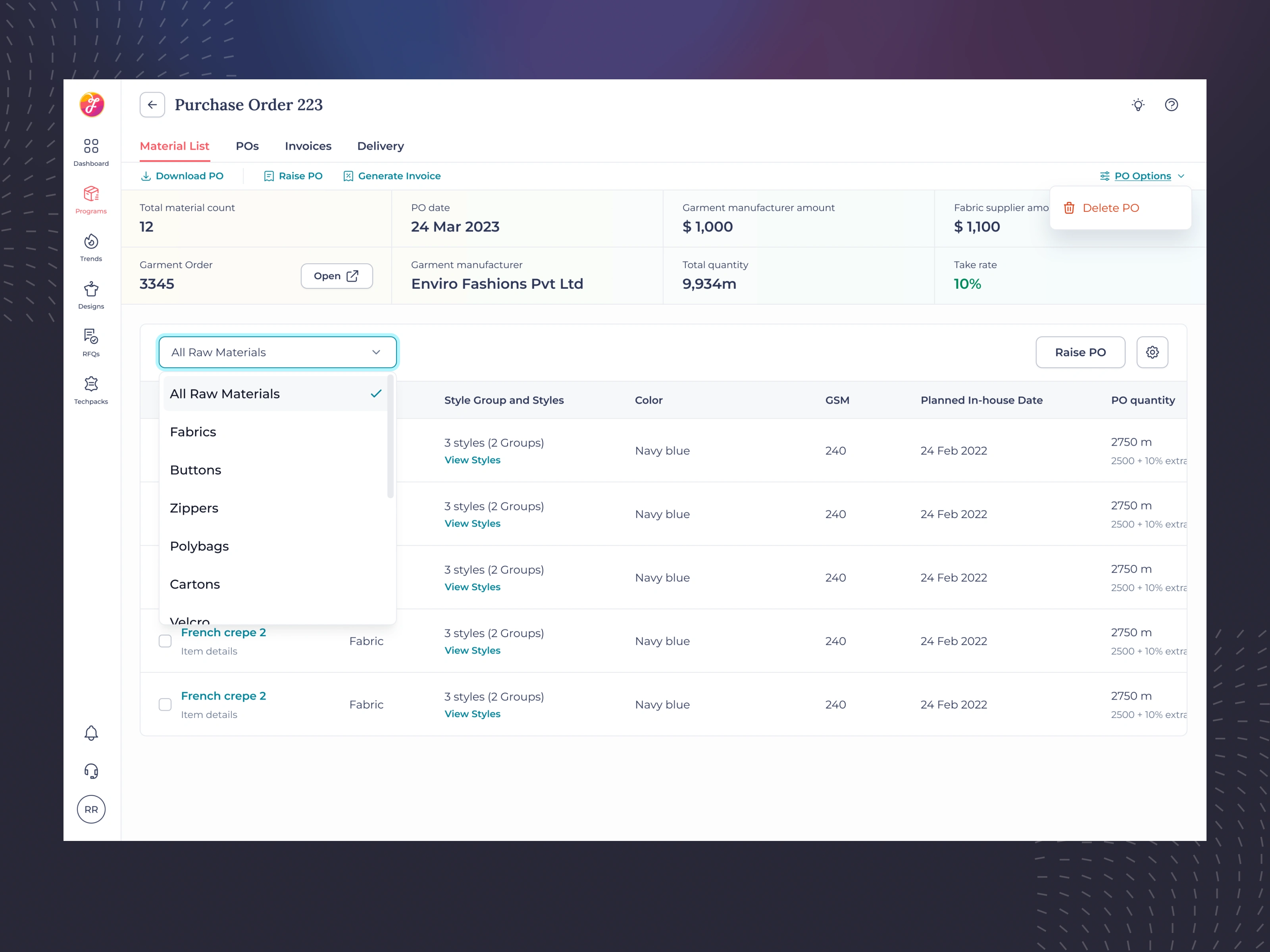 The goal was to create a scalable, intuitive, and efficient experience that helps garment manufacturers manage raw materials, track usage, and raise purchase orders seamlessly — all from a unified interface.