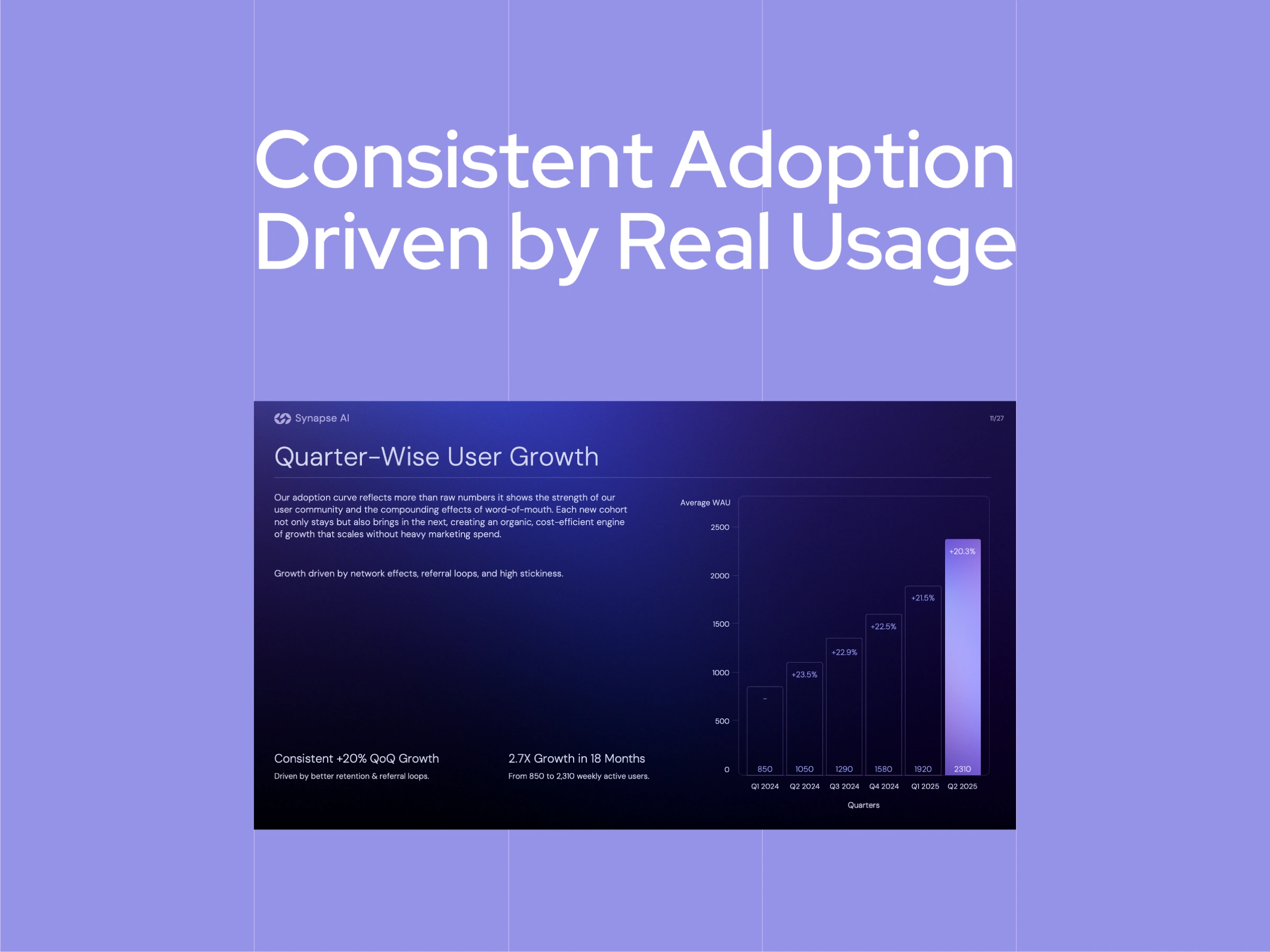 Rather than highlighting absolute numbers or celebratory milestones, the slide focuses on consistency and direction. Quarter-wise user growth shows a pattern that investors recognize immediately: repeated adoption driven by real usage, not short-term spikes.