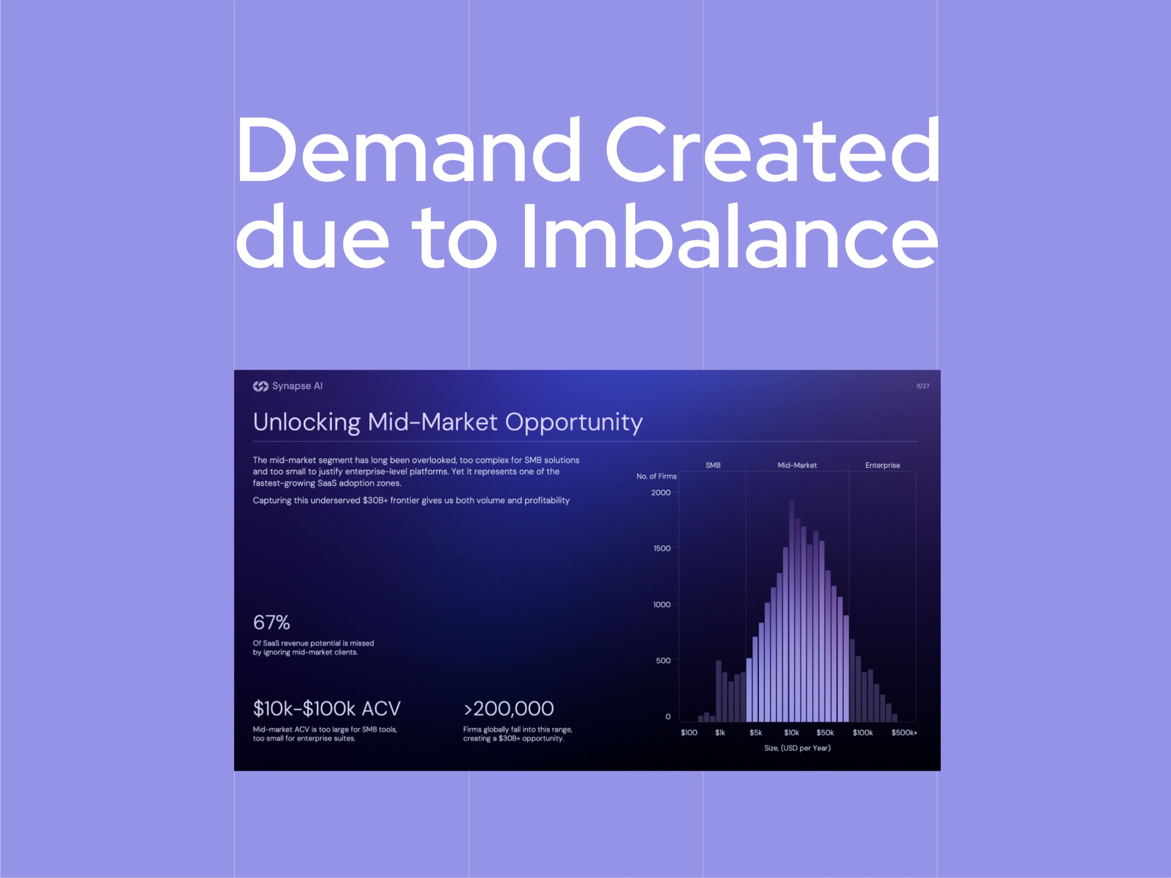 By focusing on mid-market teams, the slide reframes the problem as a gap rather than a complaint. These teams face operational complexity similar to enterprise organizations, yet lack access to tools designed for their scale and constraints.