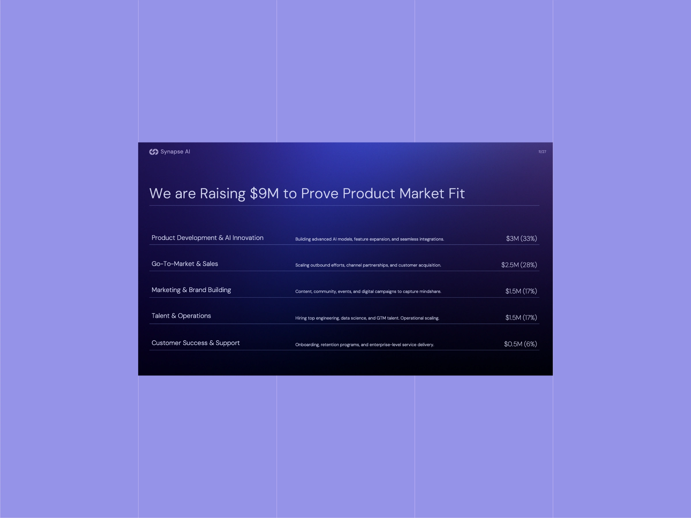 For Synapse AI, the objective was not to simply explain the product. The objective was to frame the company in a way that makes funding feel logical and inevitable.