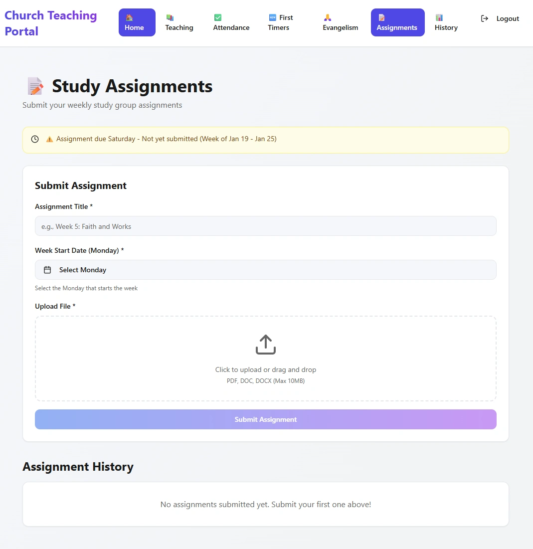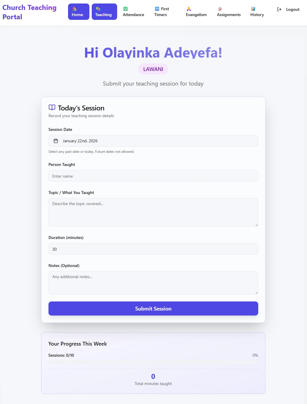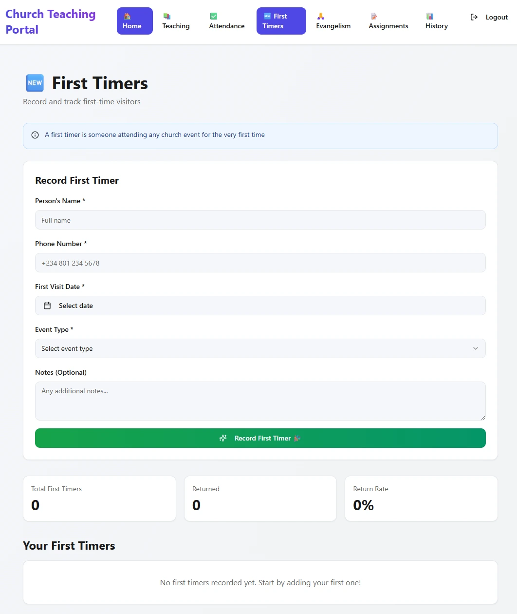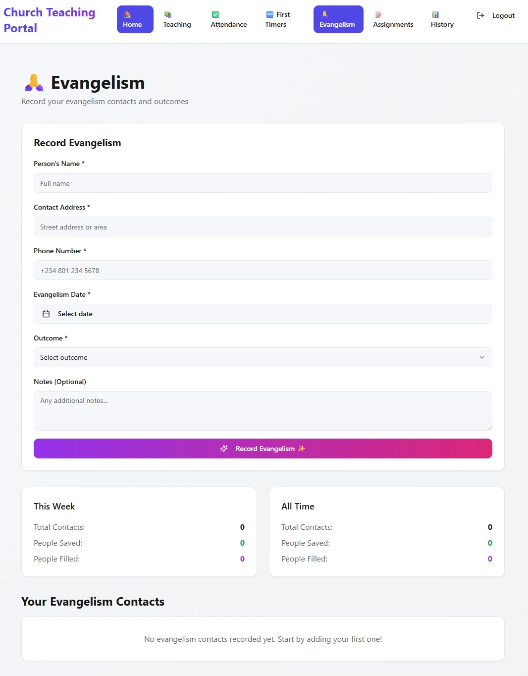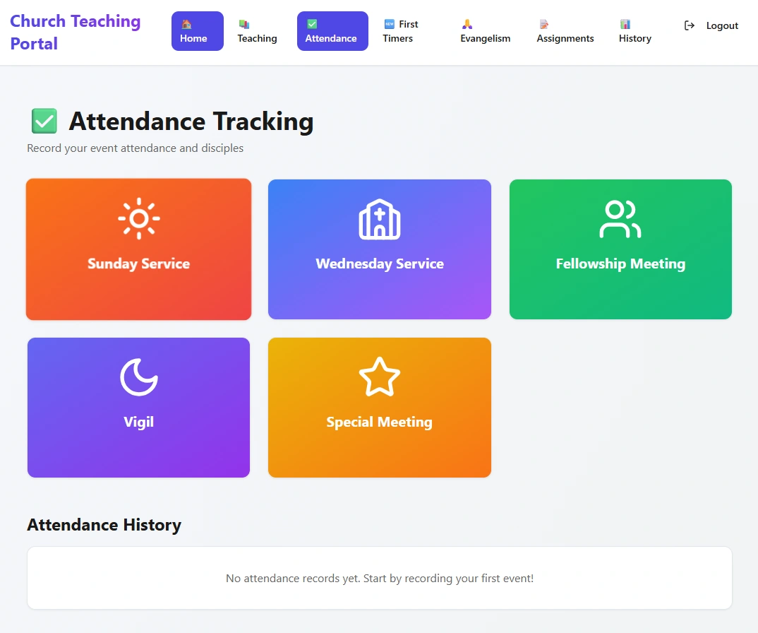 This project delivers a unified digital platform that helps churches track, manage, and understand member and pastor activities at scale across teaching, service participation, attendance, first-timers, evangelism, assignments, and member history.