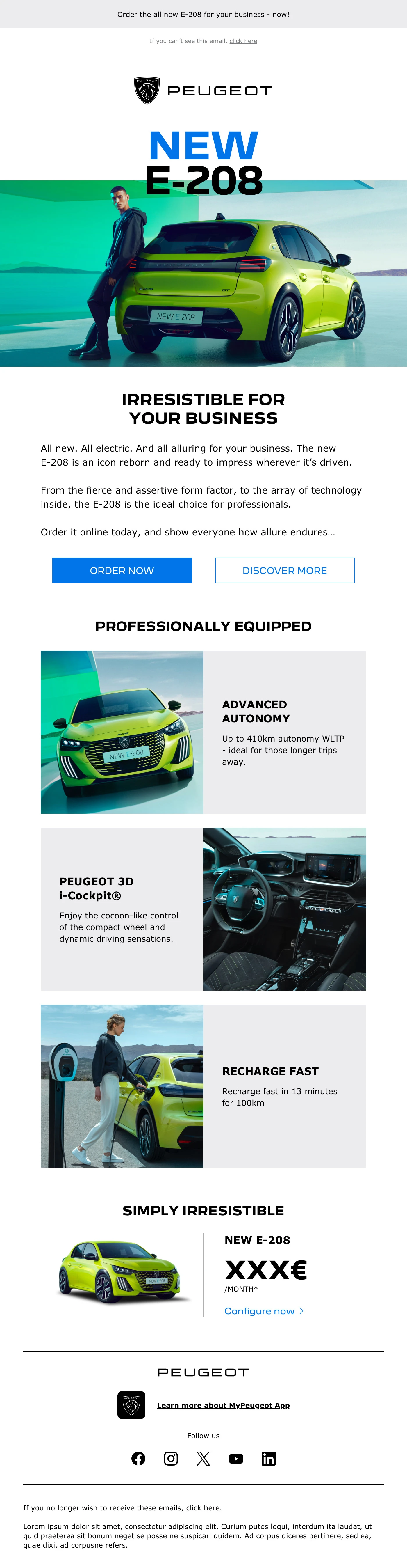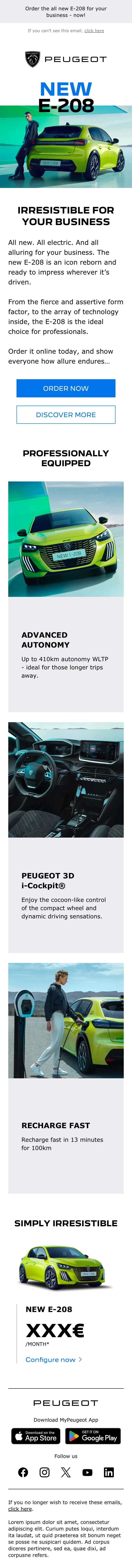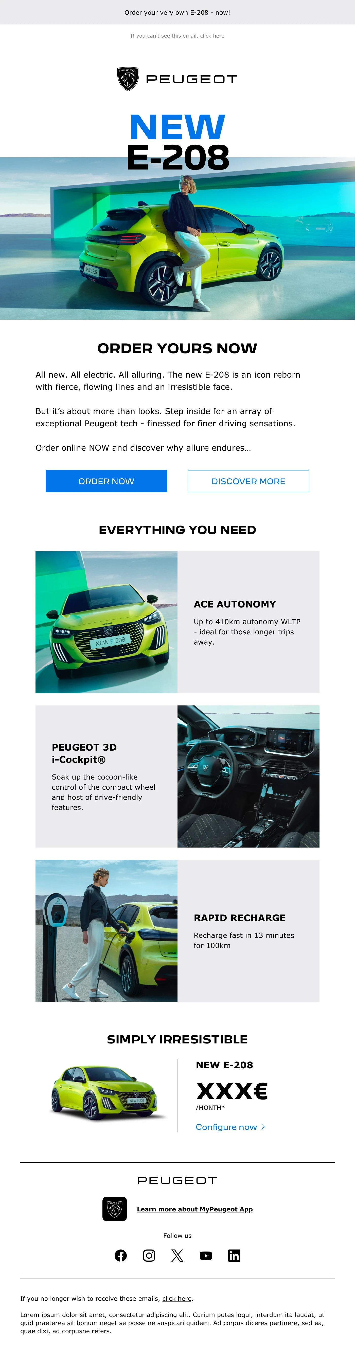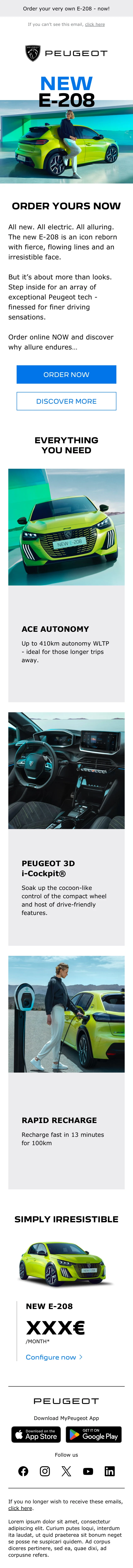 For the launch campaign of the new Peugeot E-208, I created various promotional assets, including the landing page, emails, display banners, social media posts and print assets for POS.