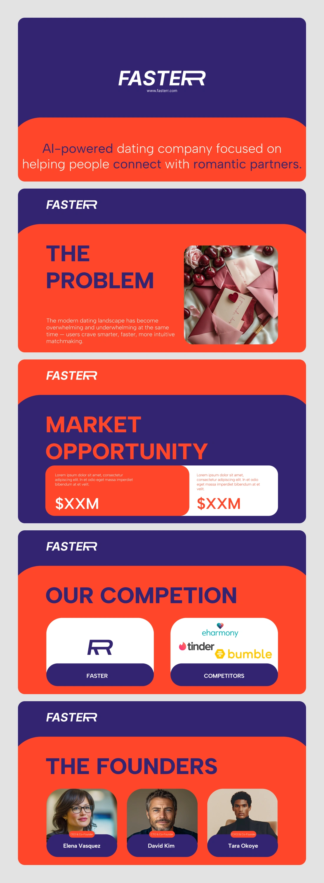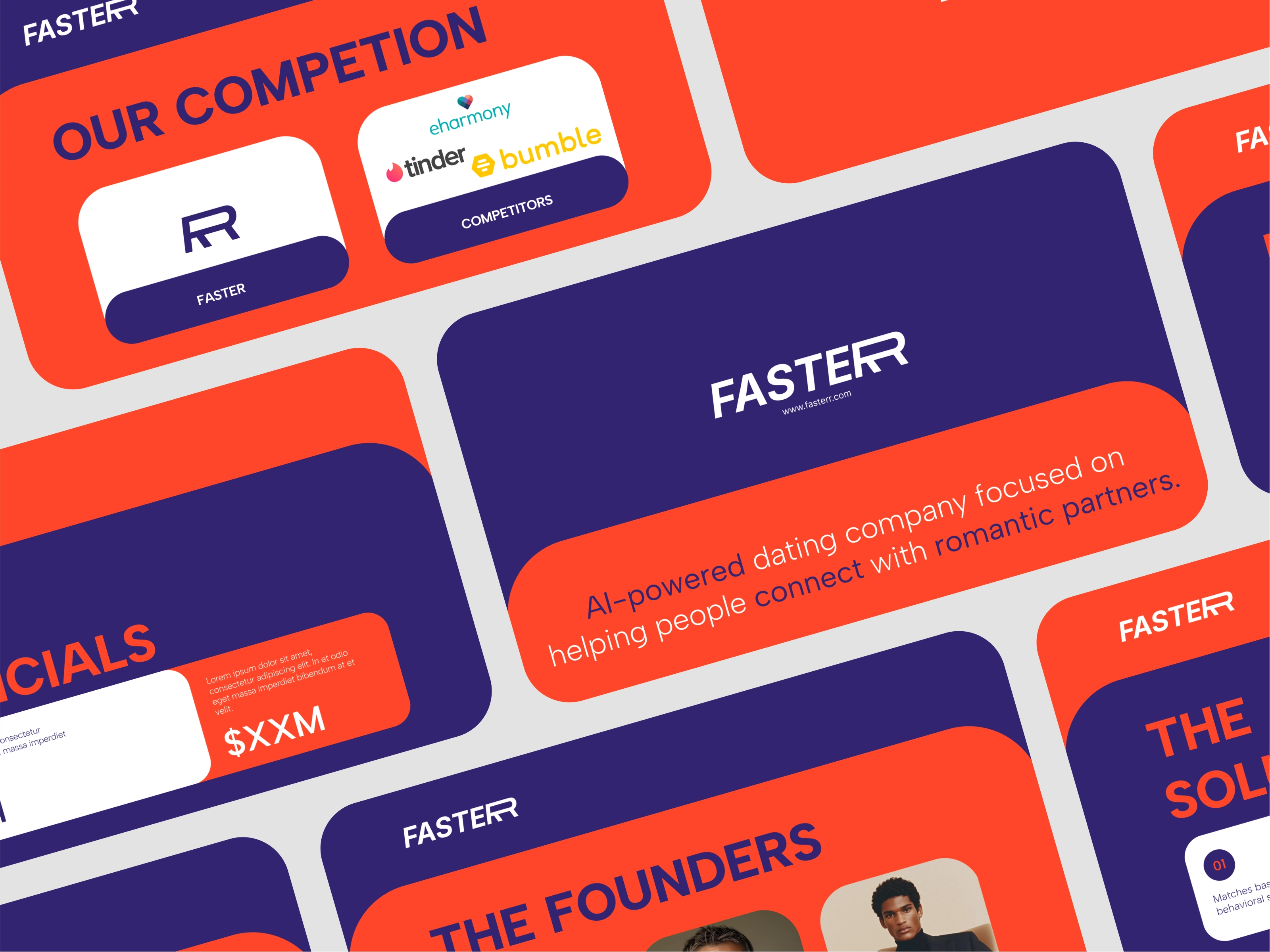 Designed an investor pitch deck for Fasterr, an AI-powered dating platform.