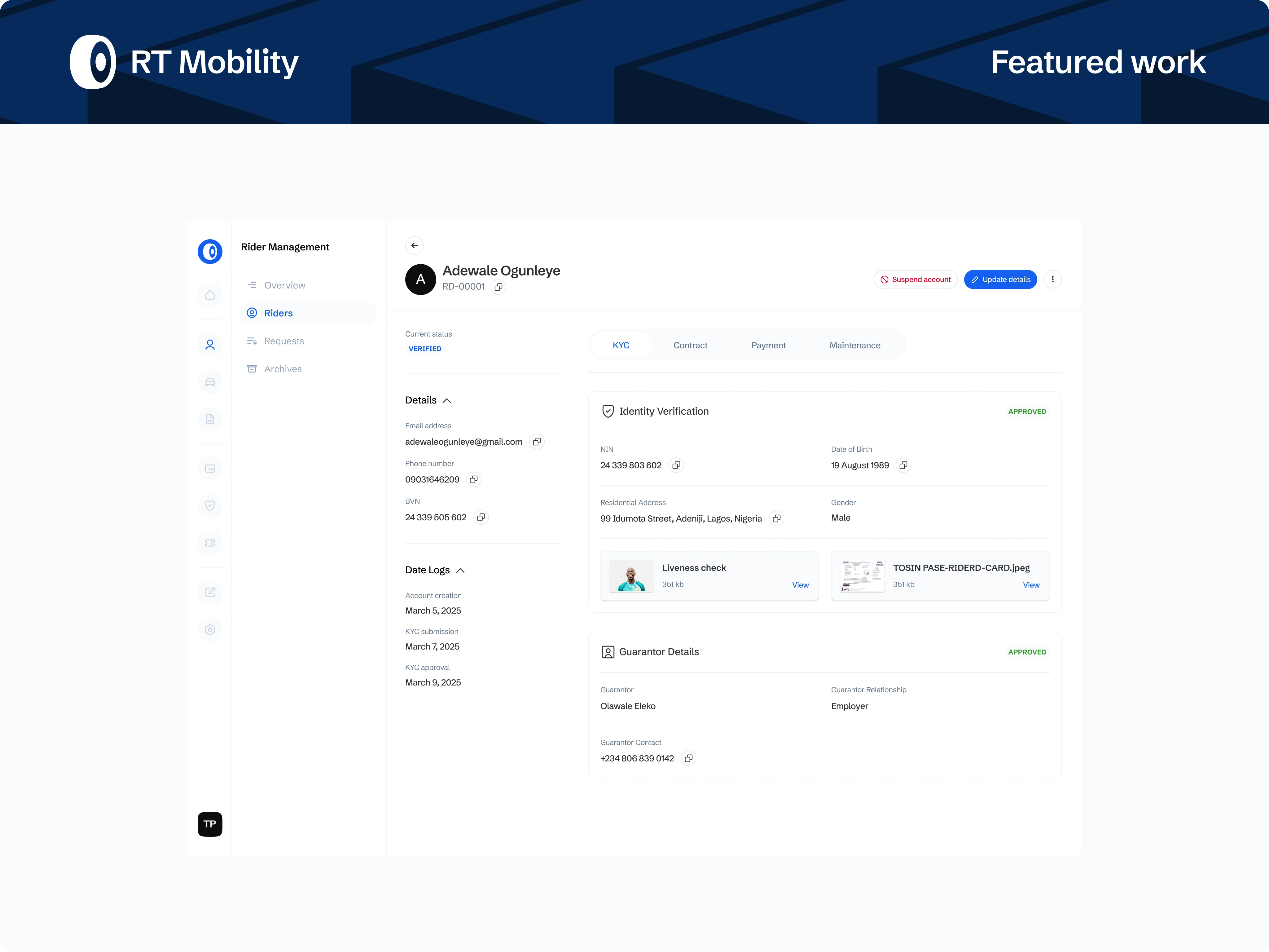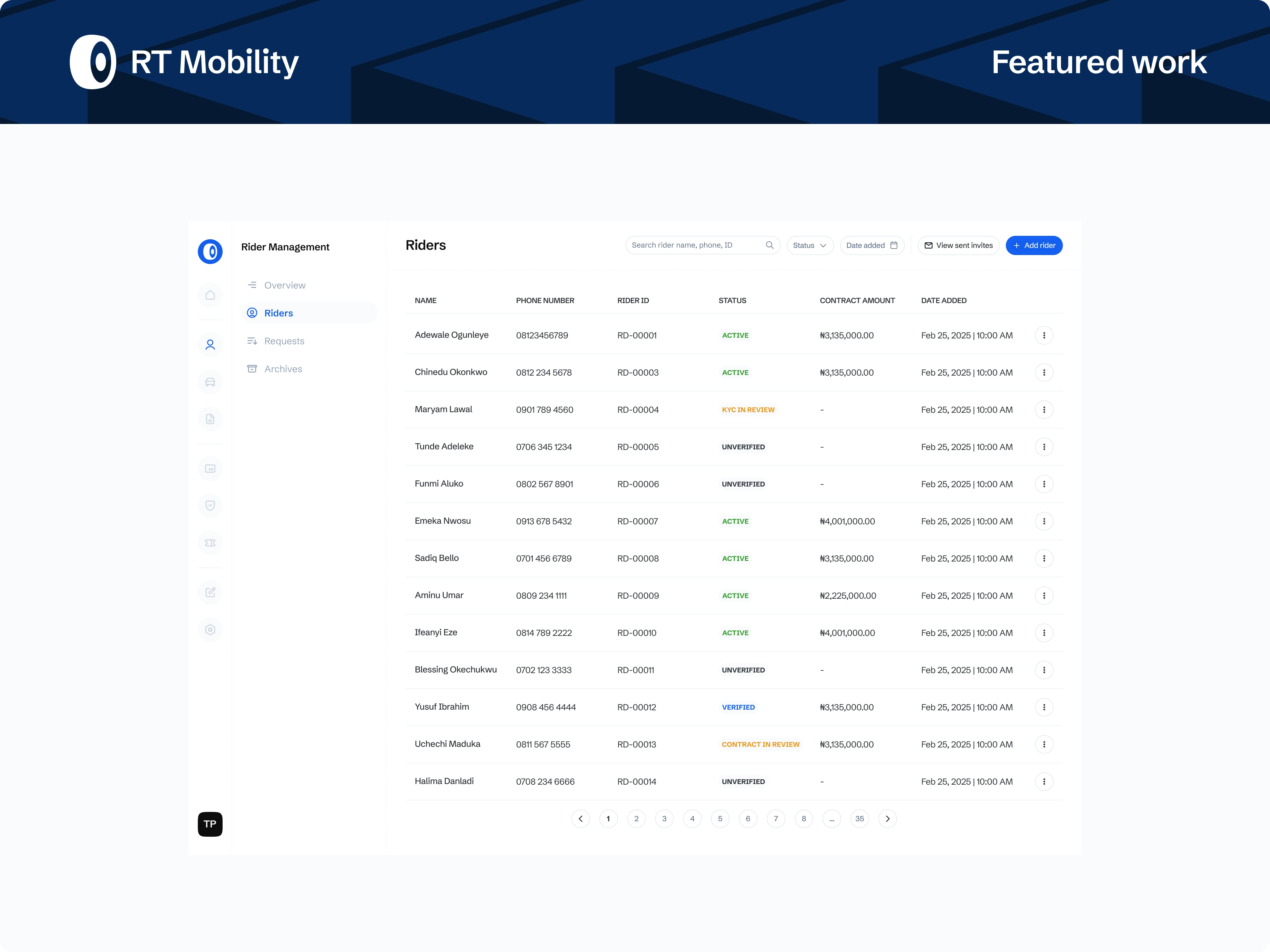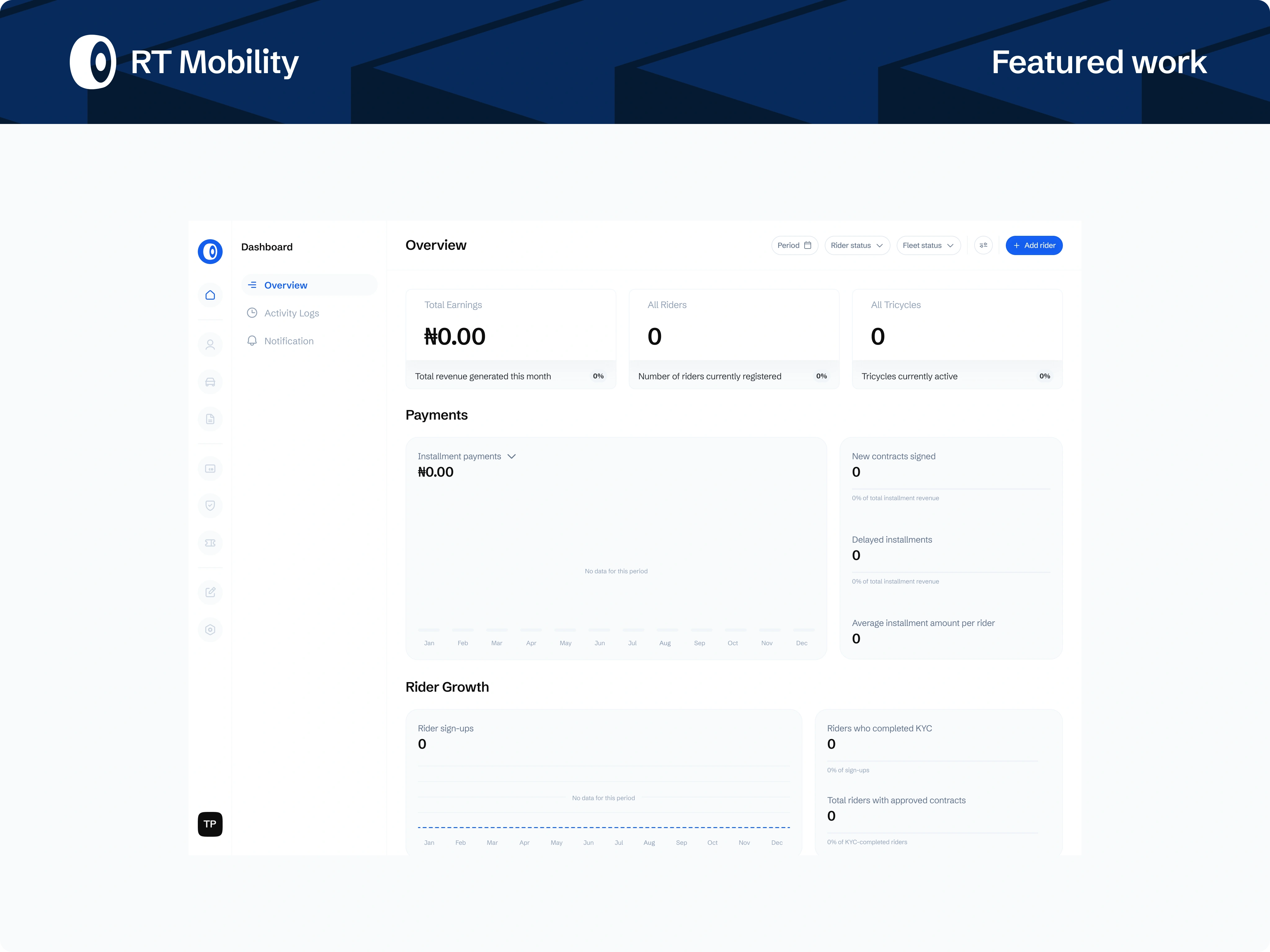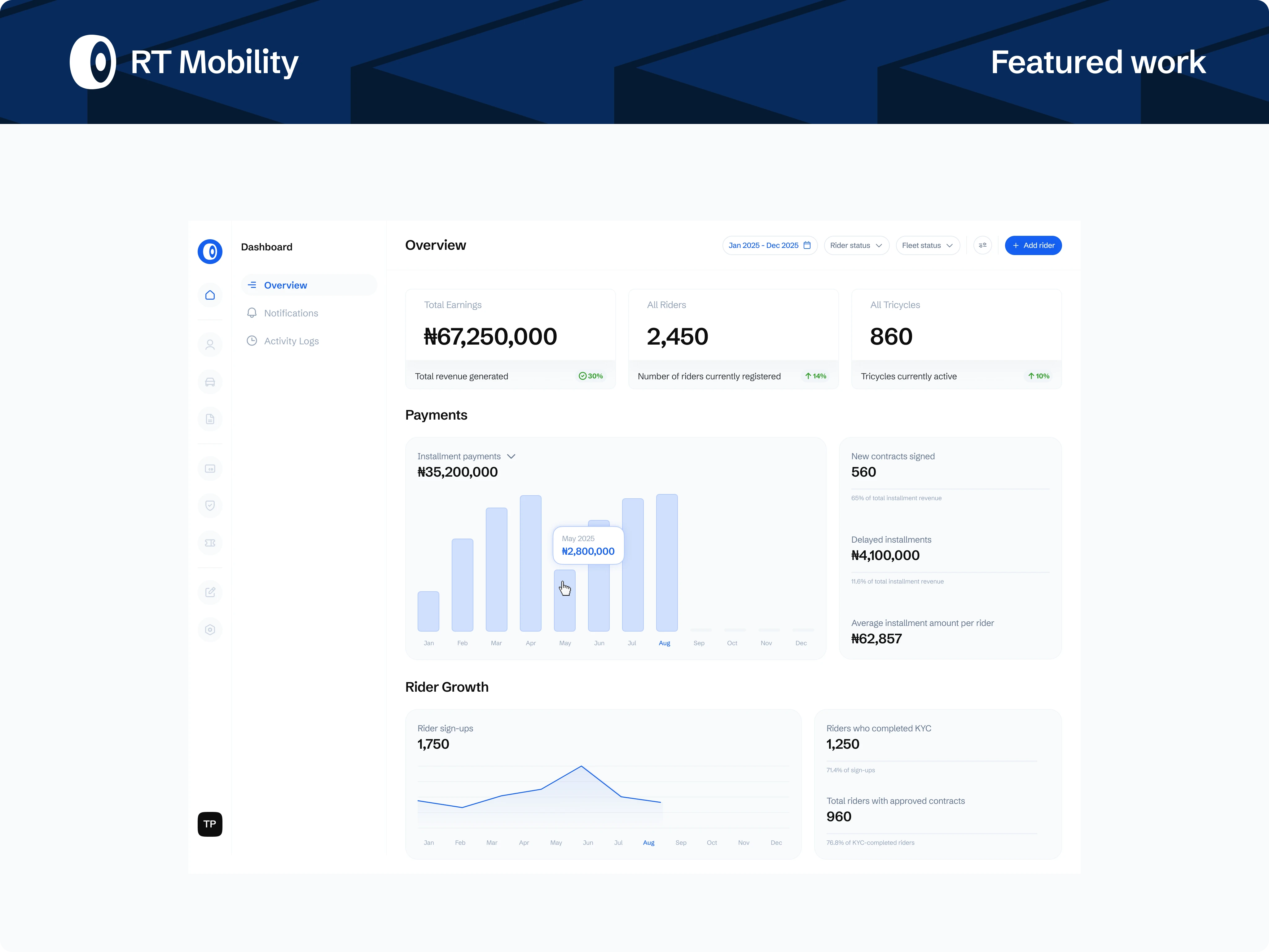 A role-based admin platform powering a Ride-to-Own (RTO) tricycle business, designed to manage riders, fleet operations, contracts, payments, and compliance at scale. The system translates complex, offline-heavy workflows into a centralised, auditable product built for operational efficiency and revenue control.