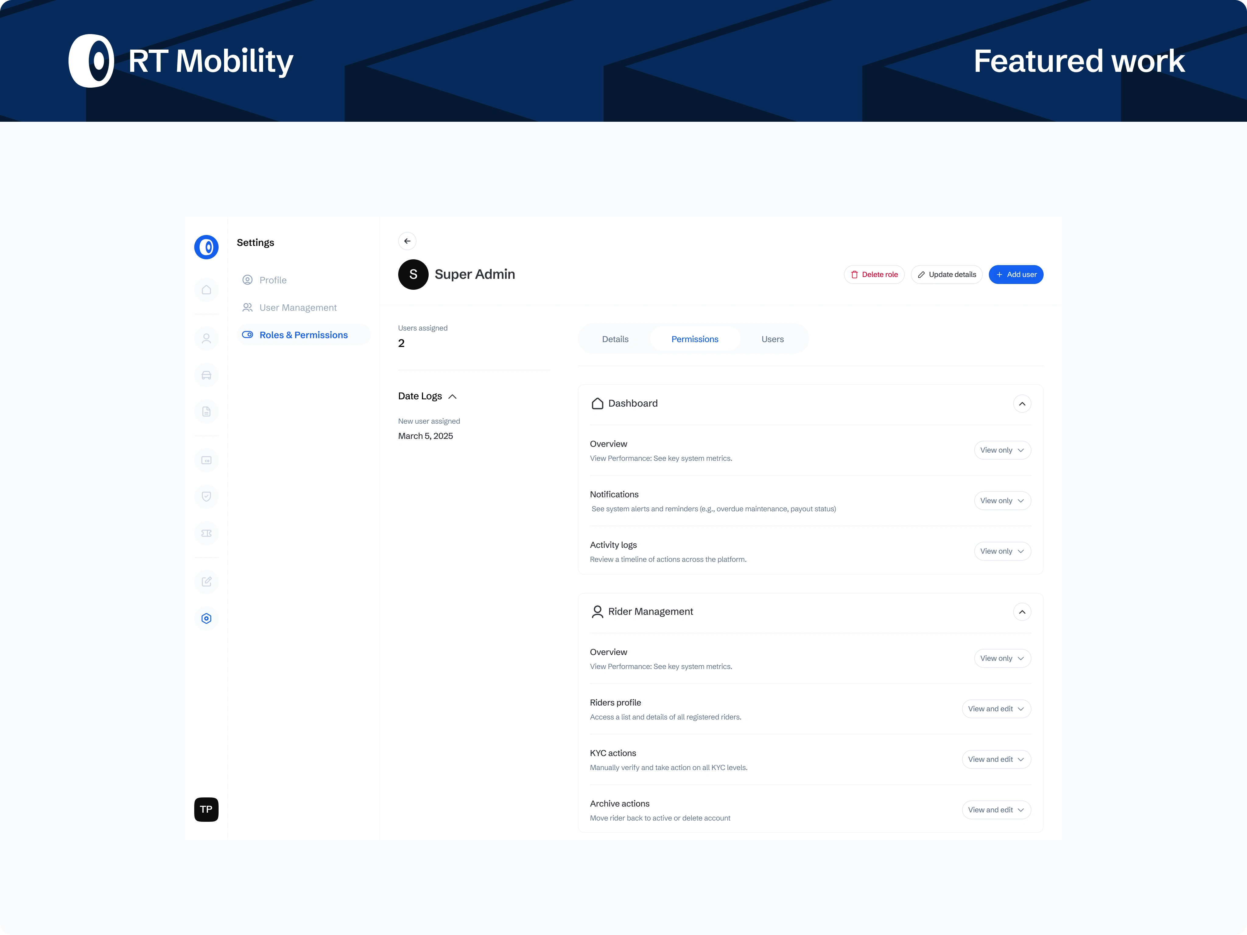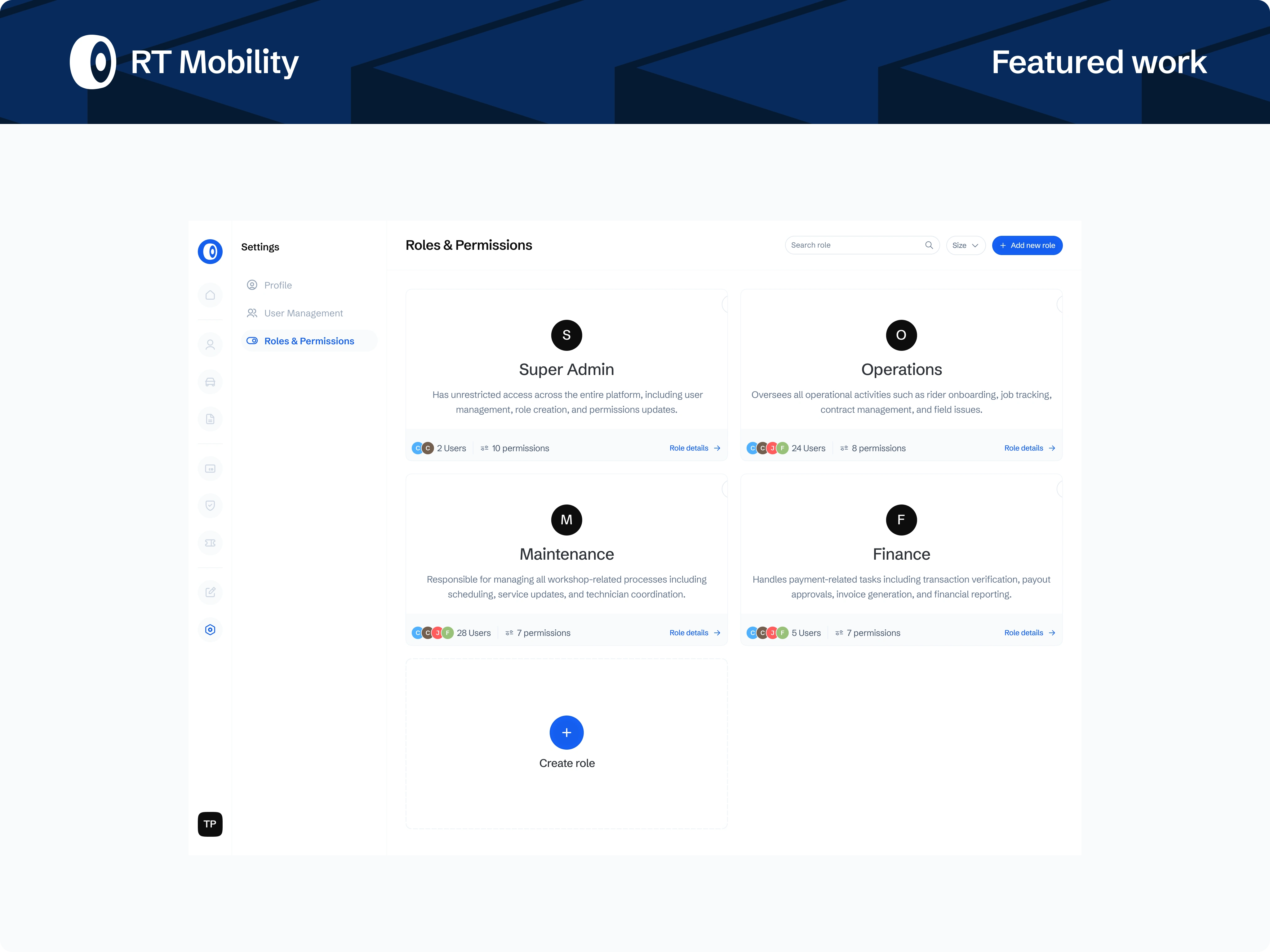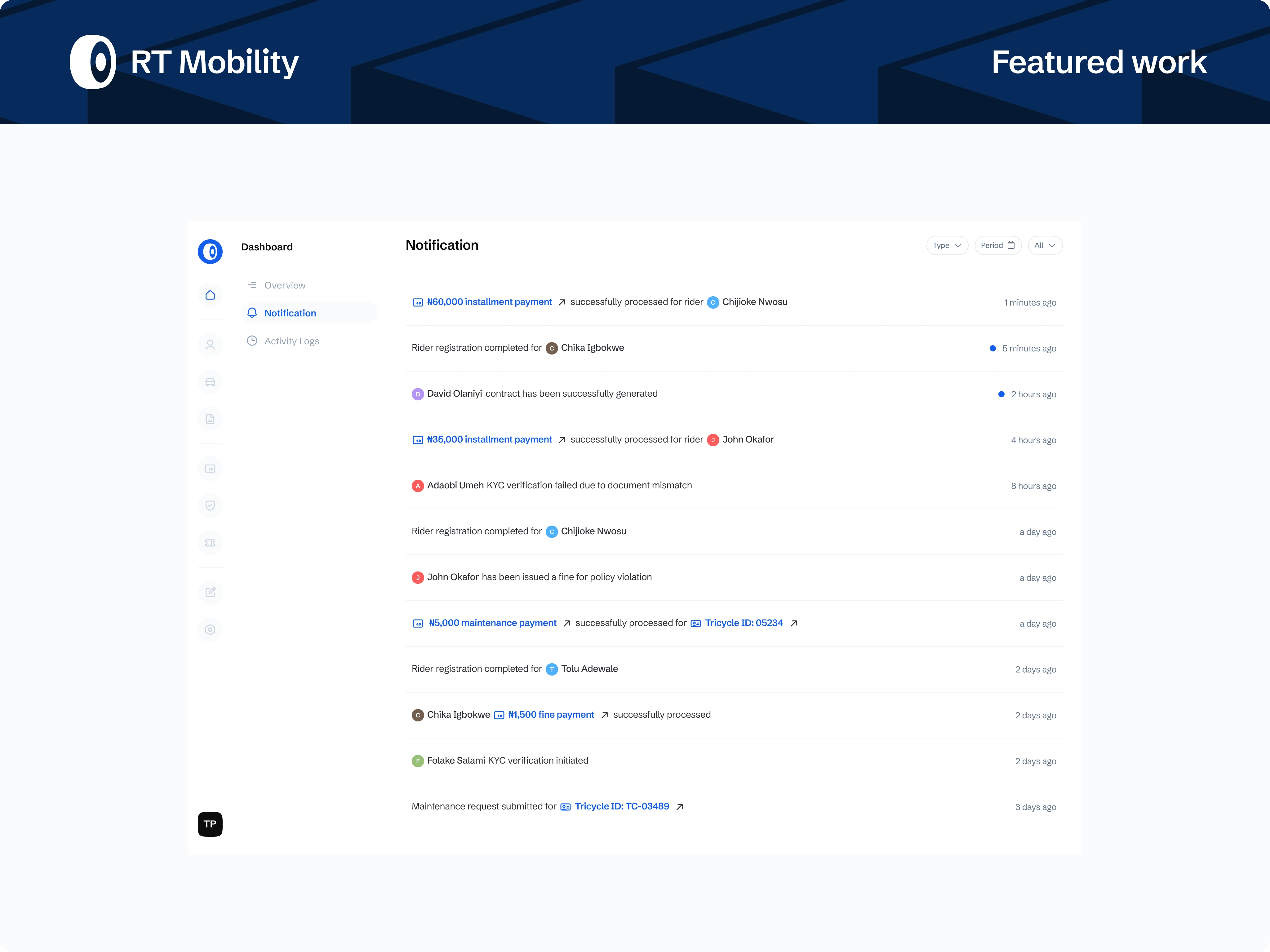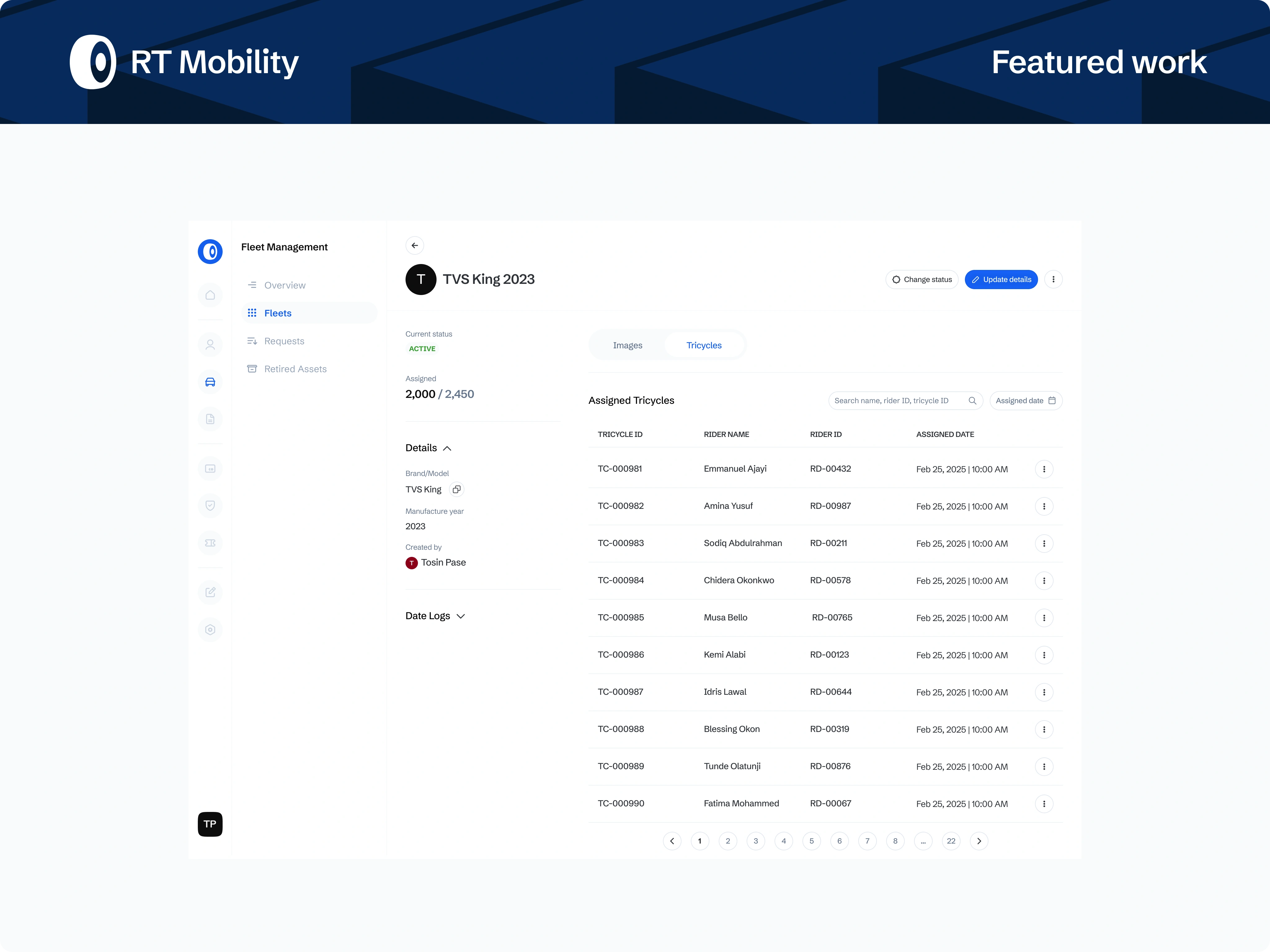 A role-based admin platform powering a Ride-to-Own (RTO) tricycle business, designed to manage riders, fleet operations, contracts, payments, and compliance at scale. The system translates complex, offline-heavy workflows into a centralised, auditable product built for operational efficiency and revenue control.