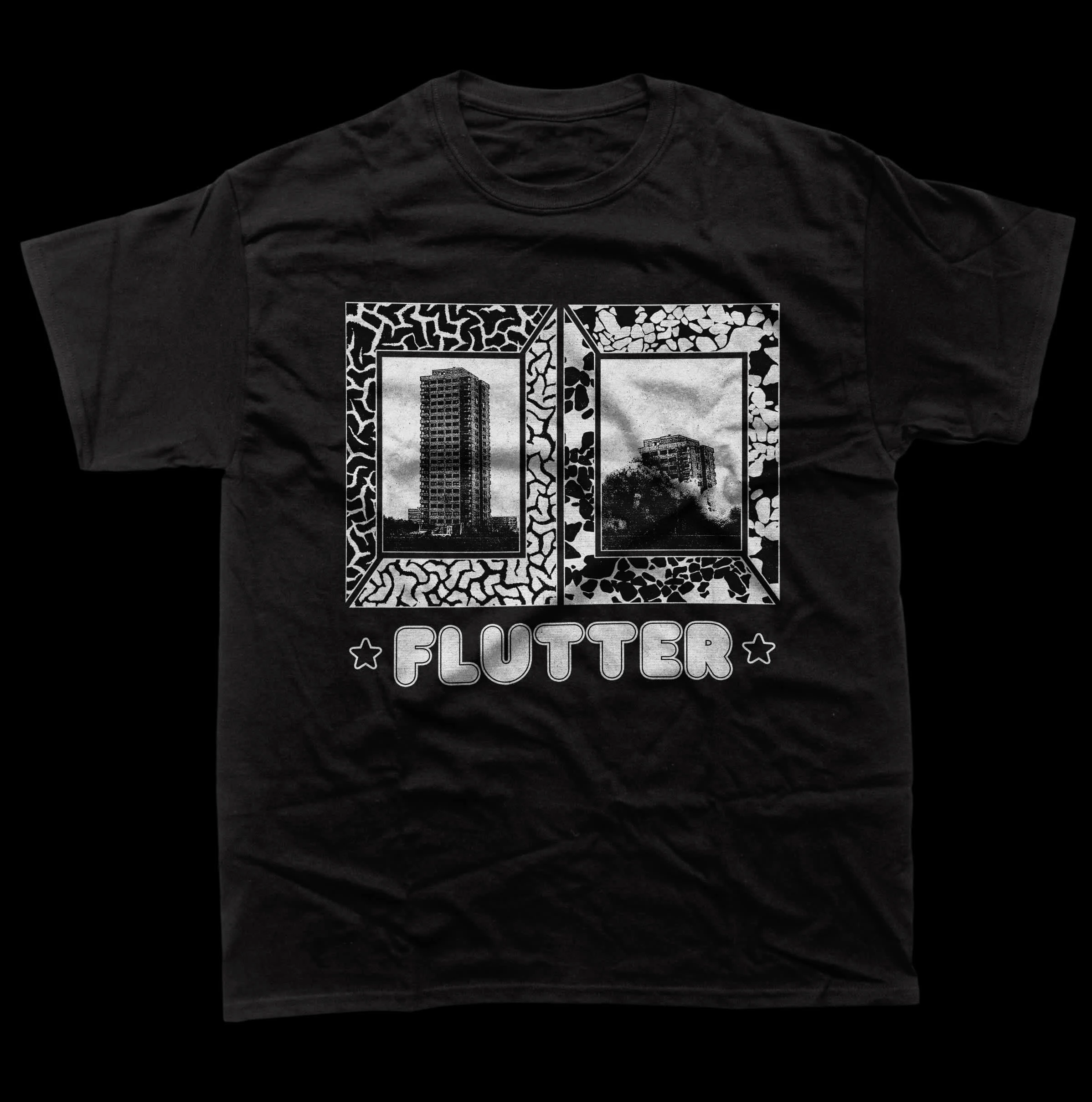 Designed a band tee for Flutter featuring a collage of brutalist architecture and playful line textures. Printed for live shows and online sales.