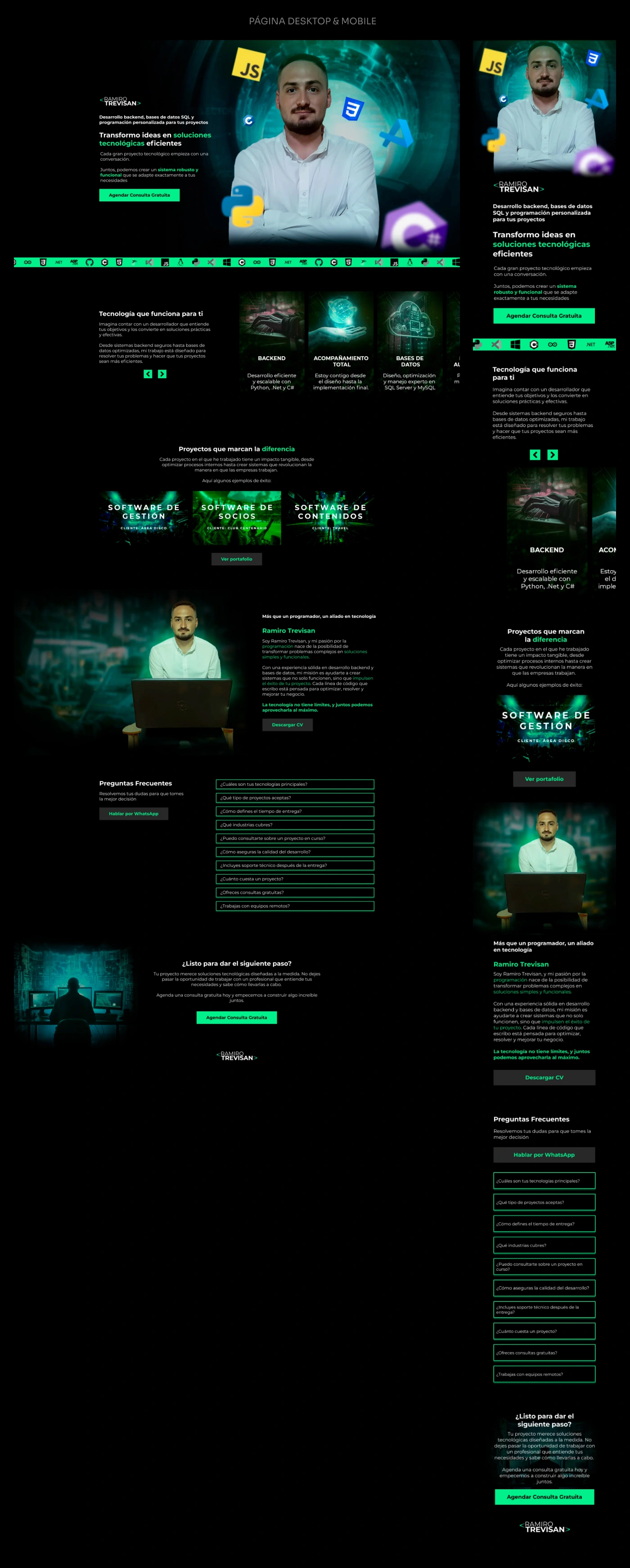 Este proyecto consistió en el diseño y desarrollo de una landing page profesional para Ramiro Trevisan, un especialista en desarrollo backend y bases de datos. El objetivo principal fue destacar sus habilidades técnicas y proyectos destacados, con un enfoque en soluciones tecnológicas eficientes y personalizadas. Se priorizó un diseño moderno con elementos visuales tecnológicos y un esquema de colores oscuros combinado con acentos verdes, evocando innovación, profesionalismo y confianza. La estructura se diseñó para ser intuitiva y efectiva, facilitando el acceso a información clave y fomentando la conversión mediante llamadas a la acción claras.