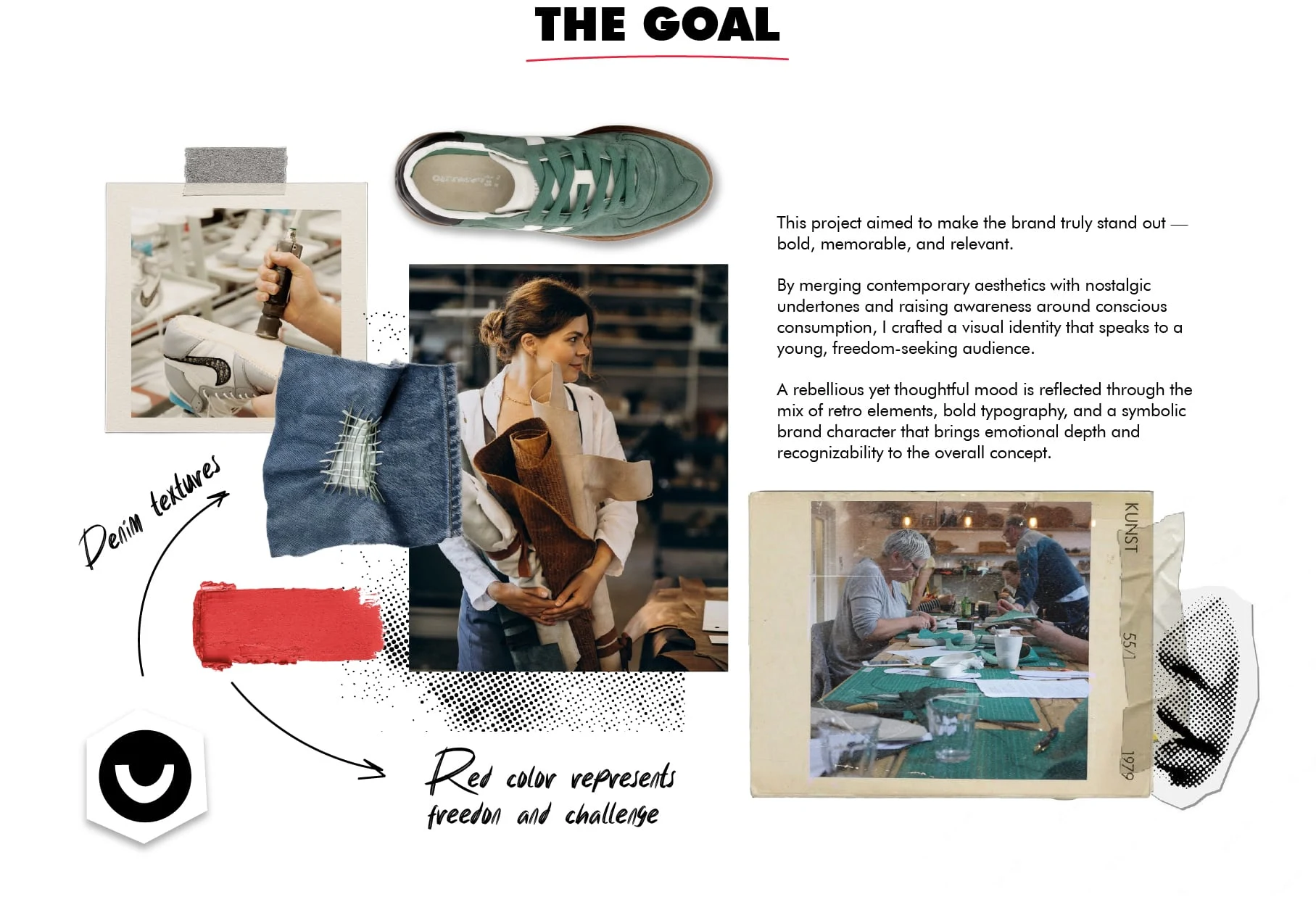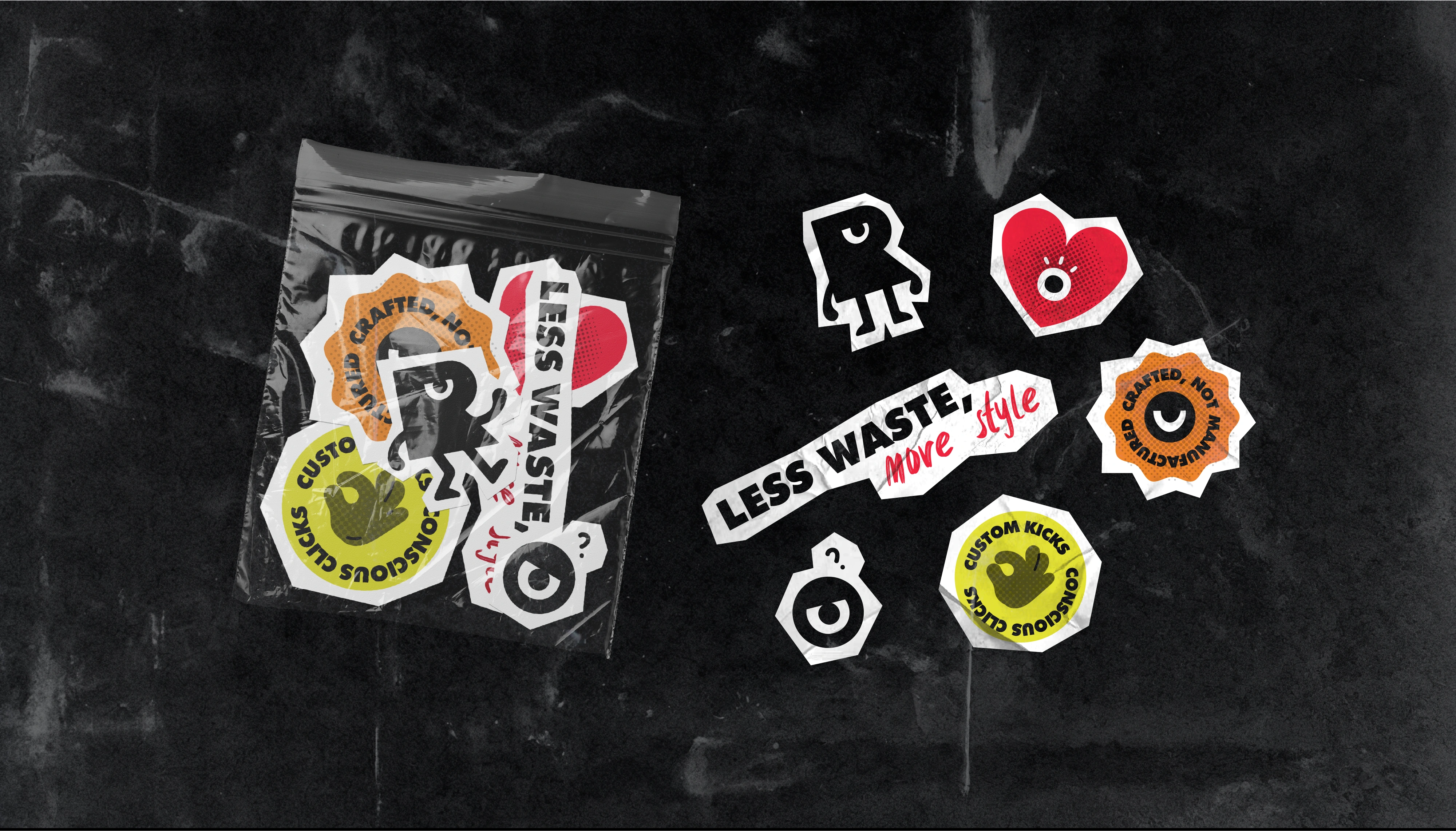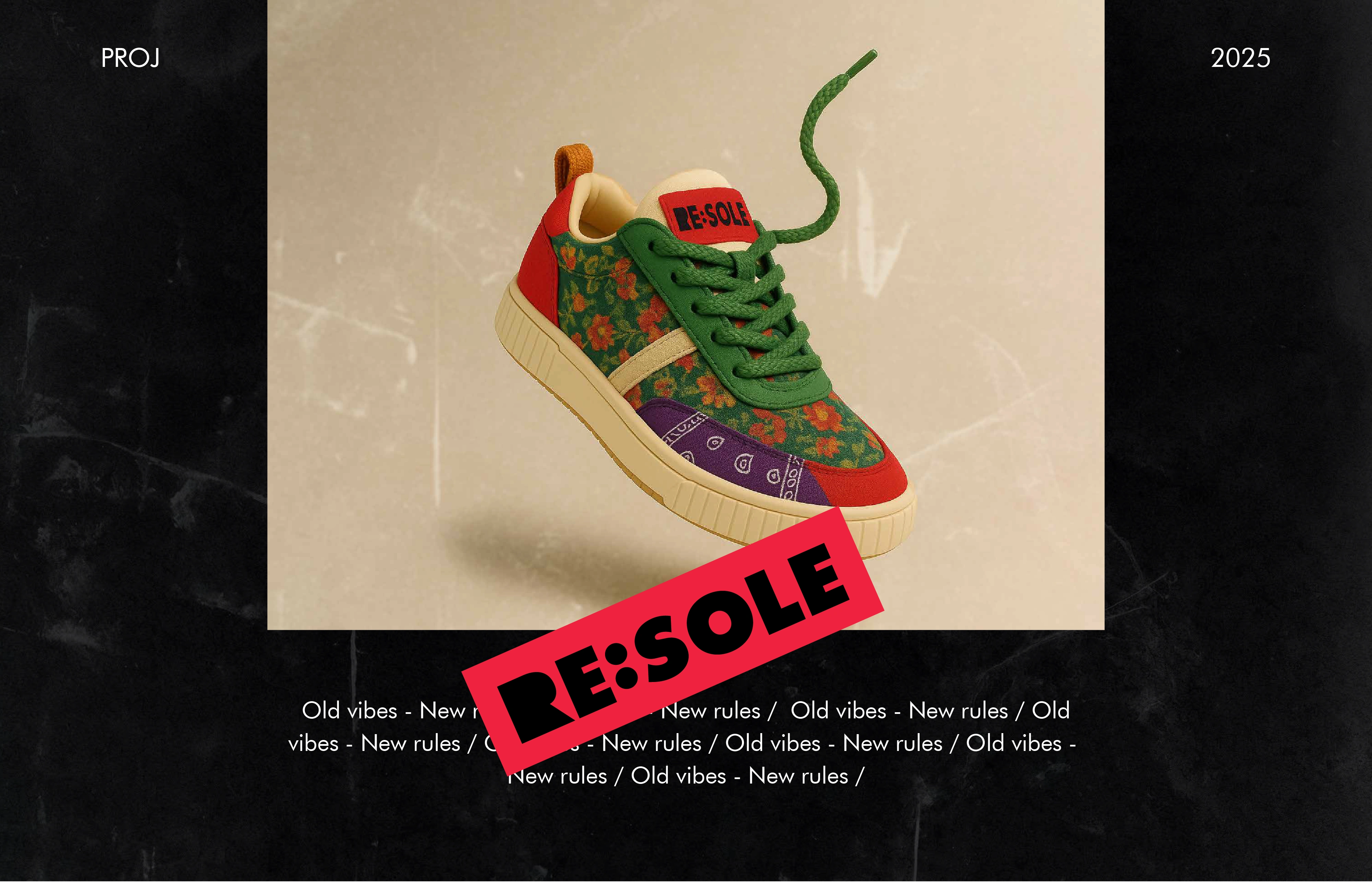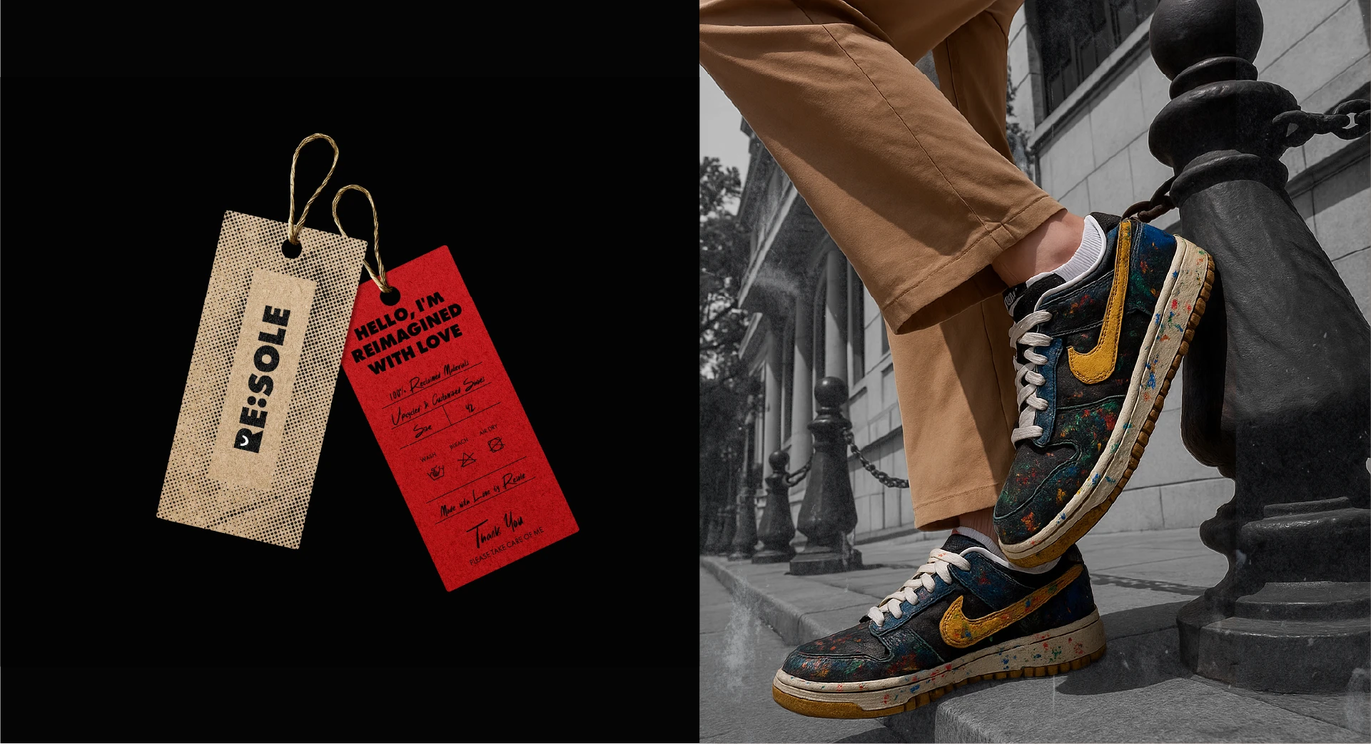 Upcycled sneaker studio transforming worn shoes into unique custom pieces. Merges streetwear and sustainability with bold visuals and nostalgic flair.