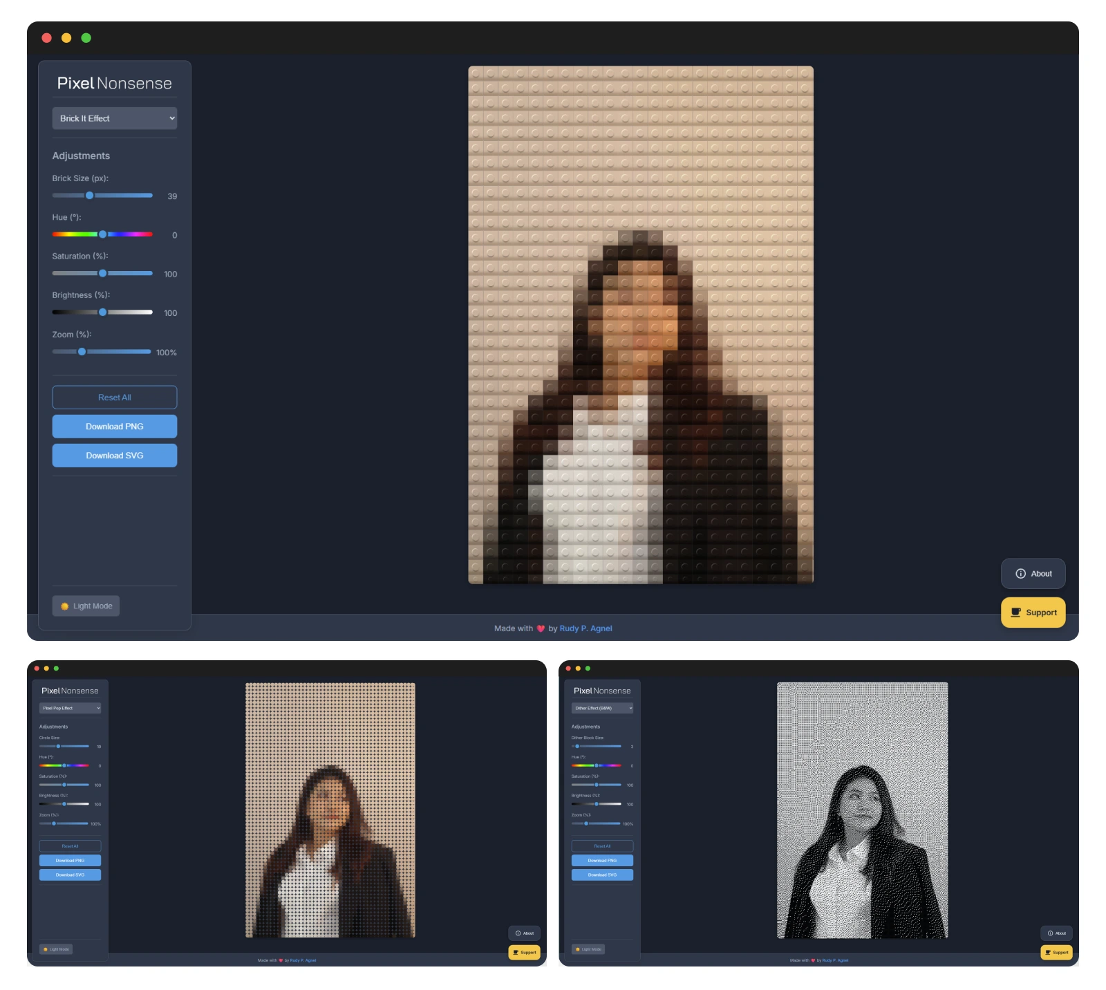It began as a playful experiment with circle pixels and grew into a full visual system. From the first “Brick It!” effect to evolving into LEGO-like bricks with depth and shadow, Pixel Nonsense showed how pure nonsense could be crafted into something clever and addictive. Try it live at