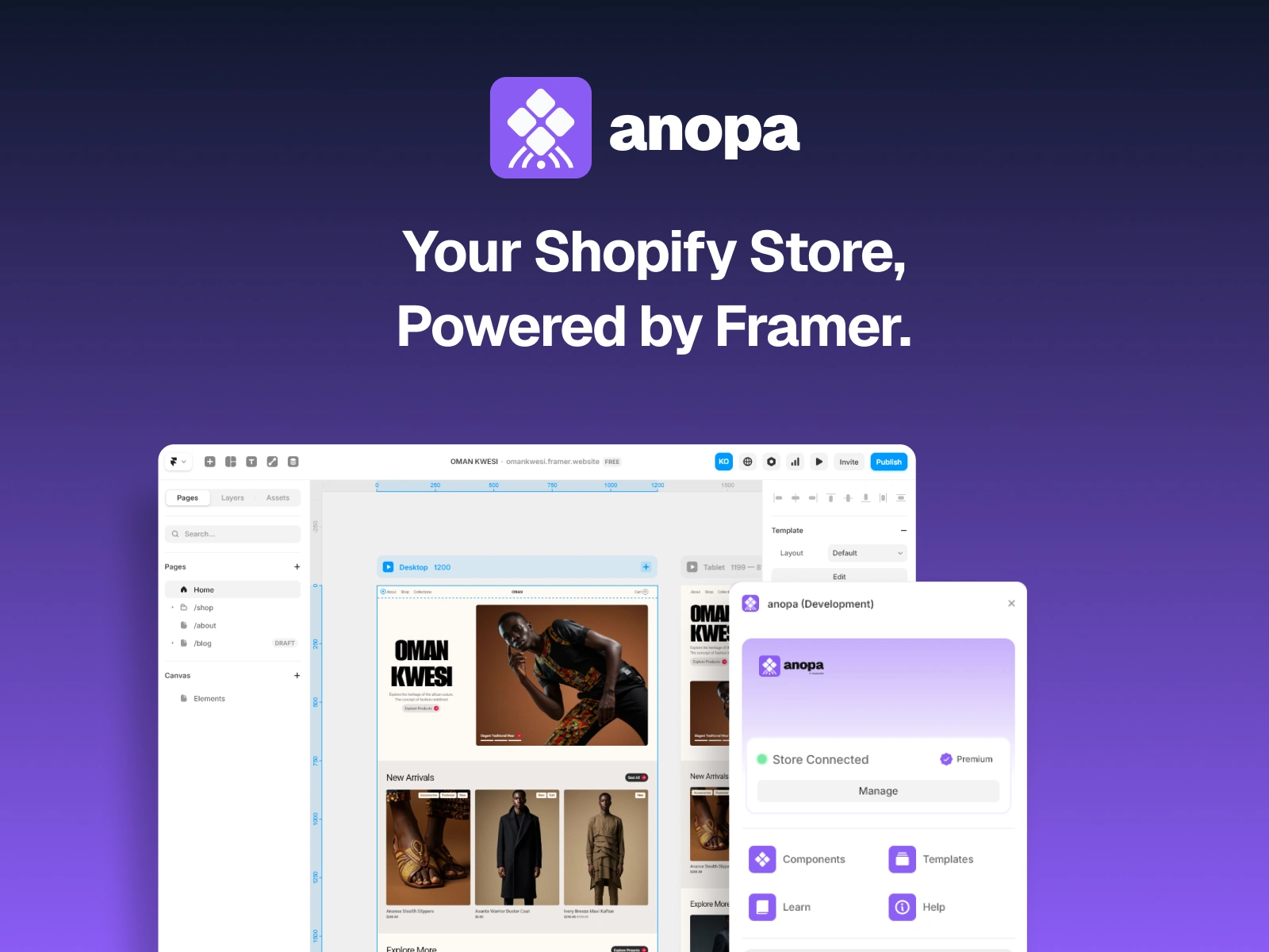 Anopa is a framer plugin that connects your framer website to Shopify robust ecommerce Capabilites. It offers easily customizable components to get you started