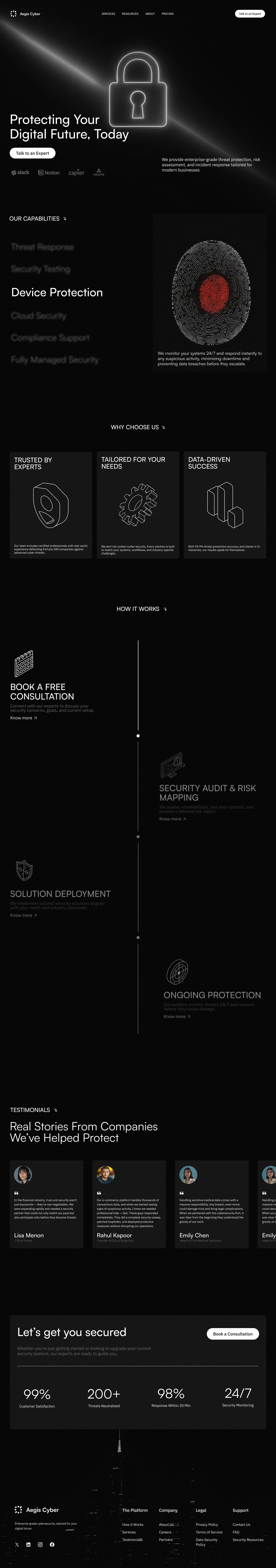 Designed a bold, trust-focused landing page for a cybersecurity SaaS. Used sharp visuals, dark UI, and clear CTA hierarchy to drive conversions.