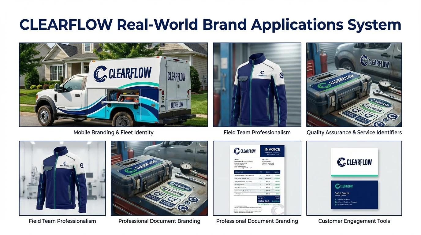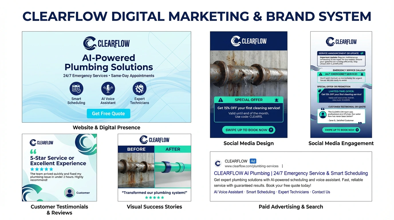 CLEARFLOW is a fictional, modern plumbing company designed to represent the next generation of local service businesses. The brand concept centers on a plumbing operation that leverages AI voice agents for 24/7 call handling, automated scheduling for instant job booking, and streamlined digital workflows to eliminate missed leads and slow response times.