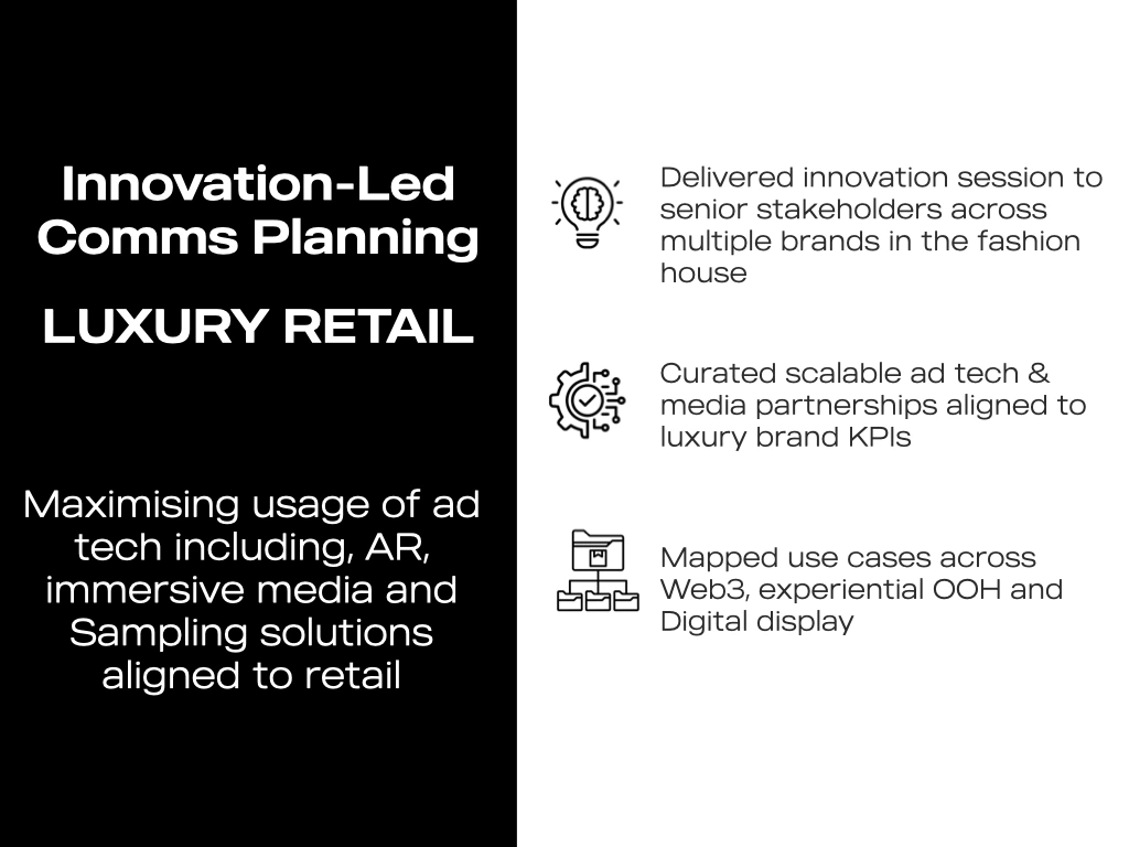 Crafted an innovation strategy session to align emerging media with brand challenges and unlock new routes to relevance beyond the traditional media mix.