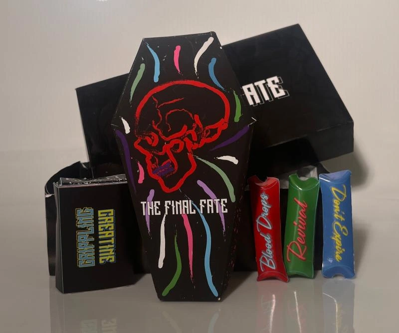 The Final Fate offers 3 drink mixes: Don’t Expire, Blood Drops, and Revival, and a matchbox containing a creatine supplement.