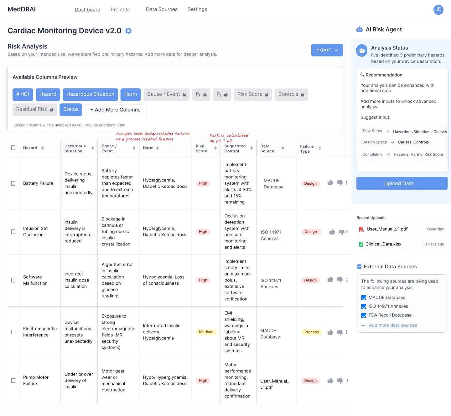 Automated AI tool for medical device risk analysis. Streamlined FMEA and risk mapping, cutting manual effort by 70% and improving audit readiness.