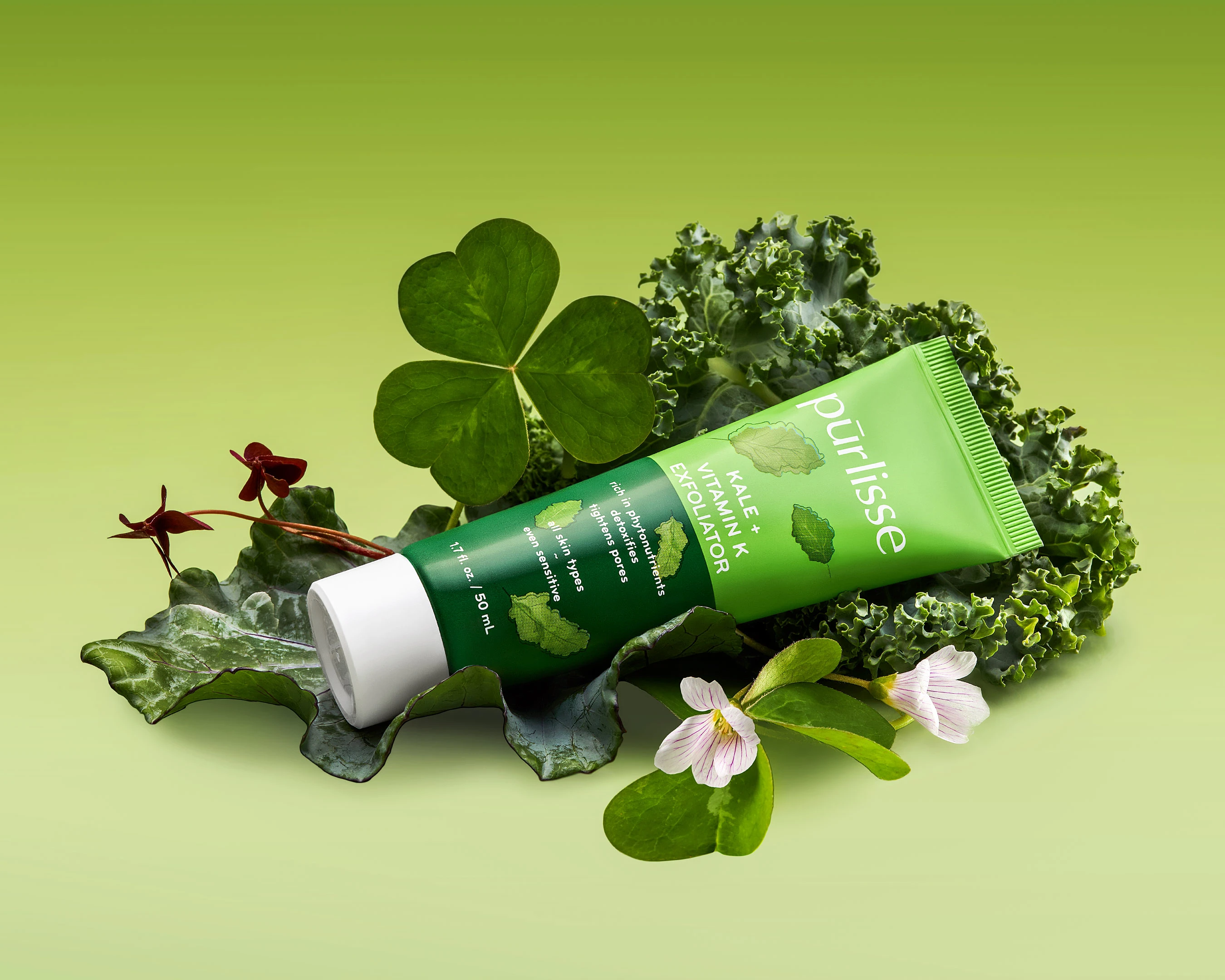 Art-directed with a nature-driven approach, combining layered botanical elements with soft, controlled lighting. Kale was featured as the hero ingredient, while additional leaves and florals were introduced as supporting visual elements to create a rich, immersive composition that suggests natural origins and brand values.