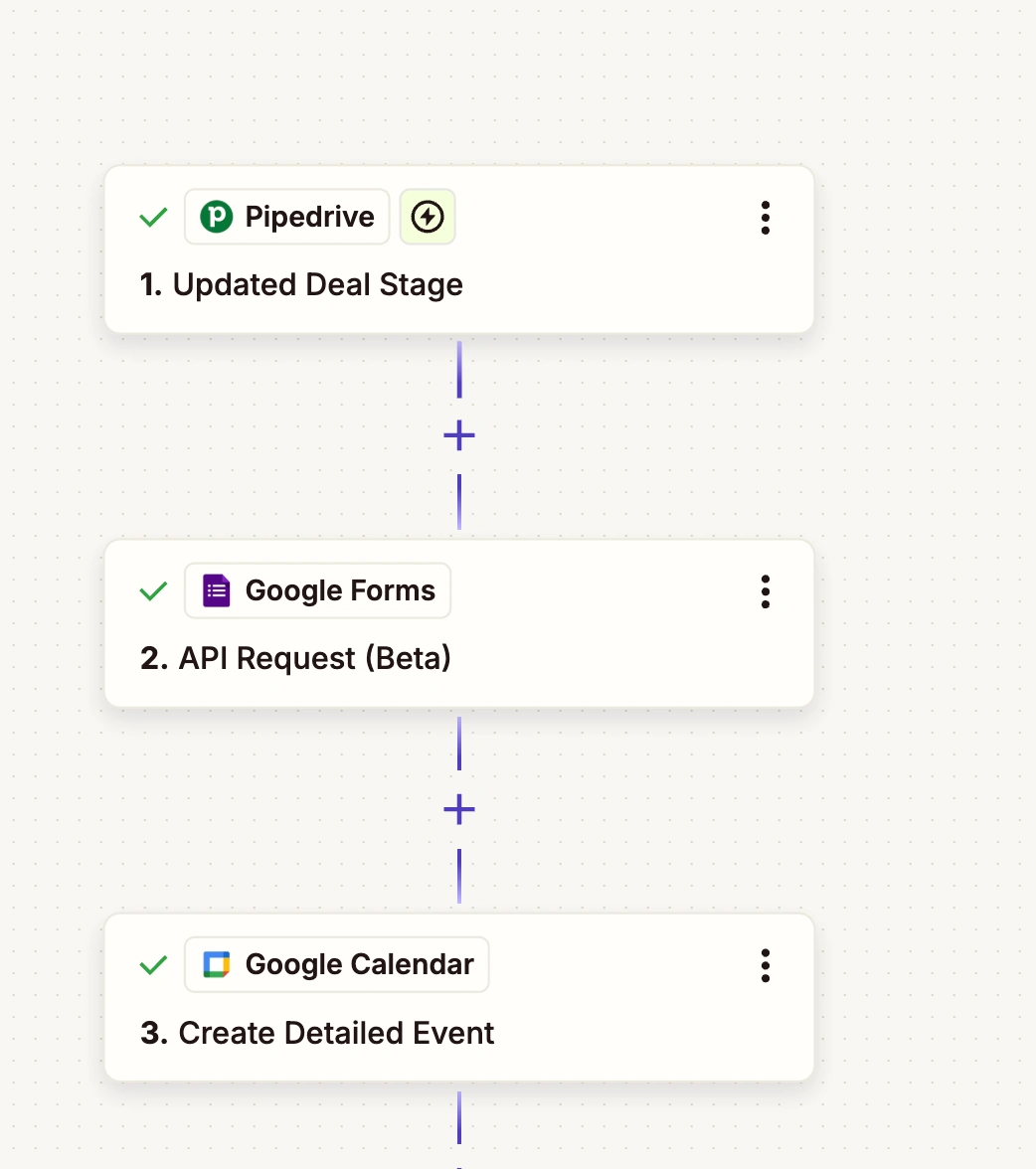 BrightEdge Media struggled with missed follow ups after deals advanced in Pipedrive. I built an automation that triggers when a deal stage is updated automatically sending data to Google Forms for campaign intake and scheduling client meetings in Google Calendar. This streamlined their deal to meeting process and improved lead response speed dramatically.