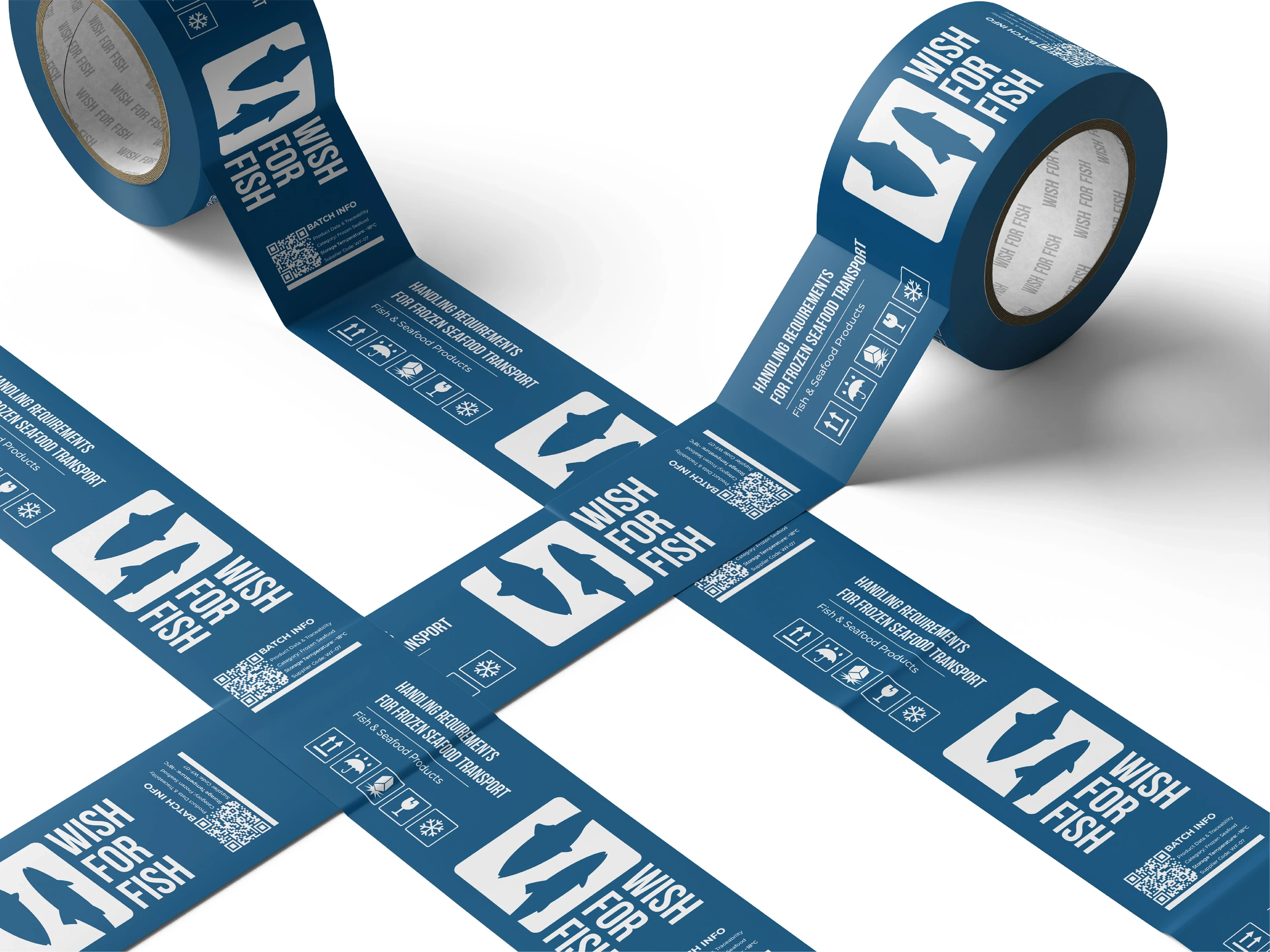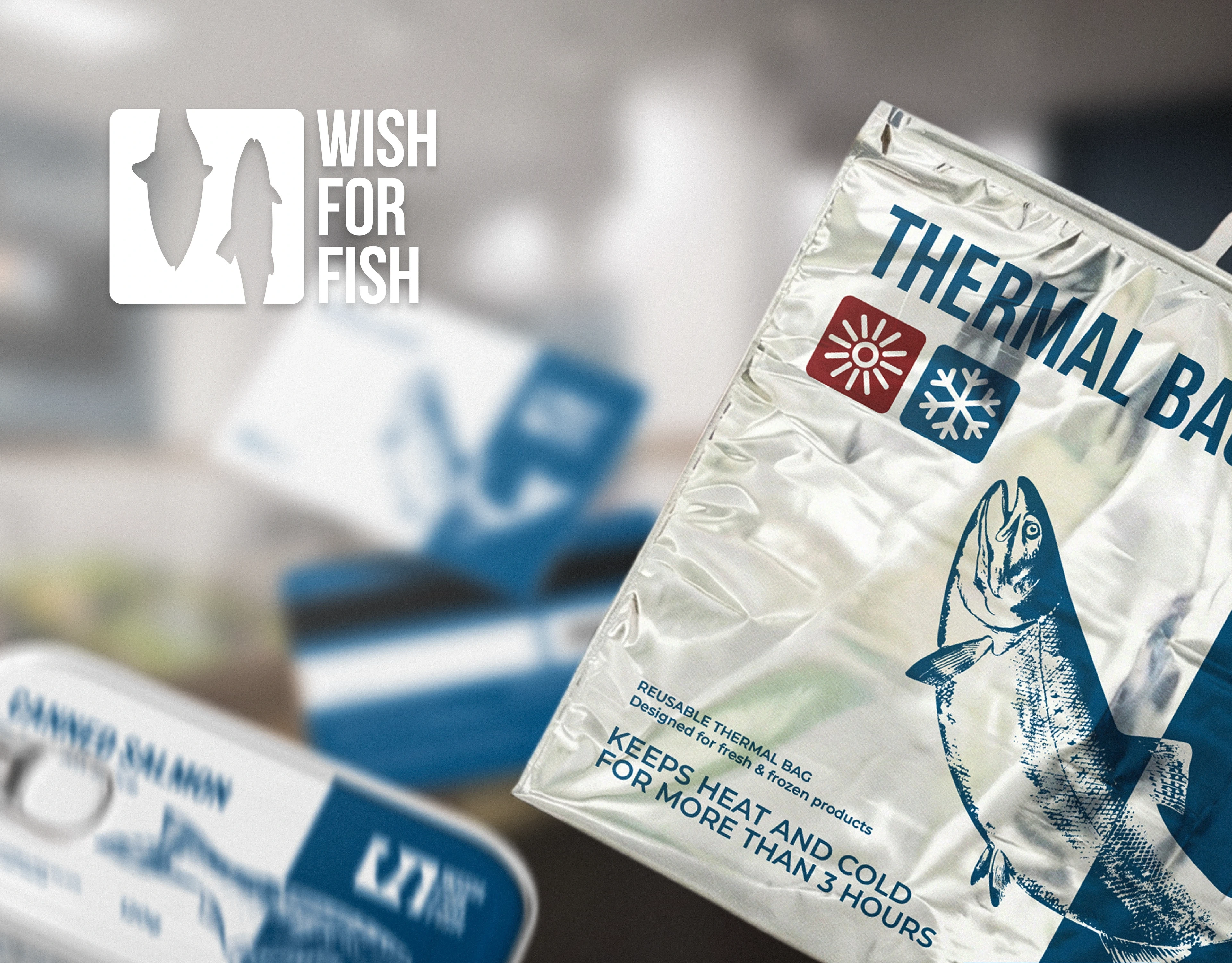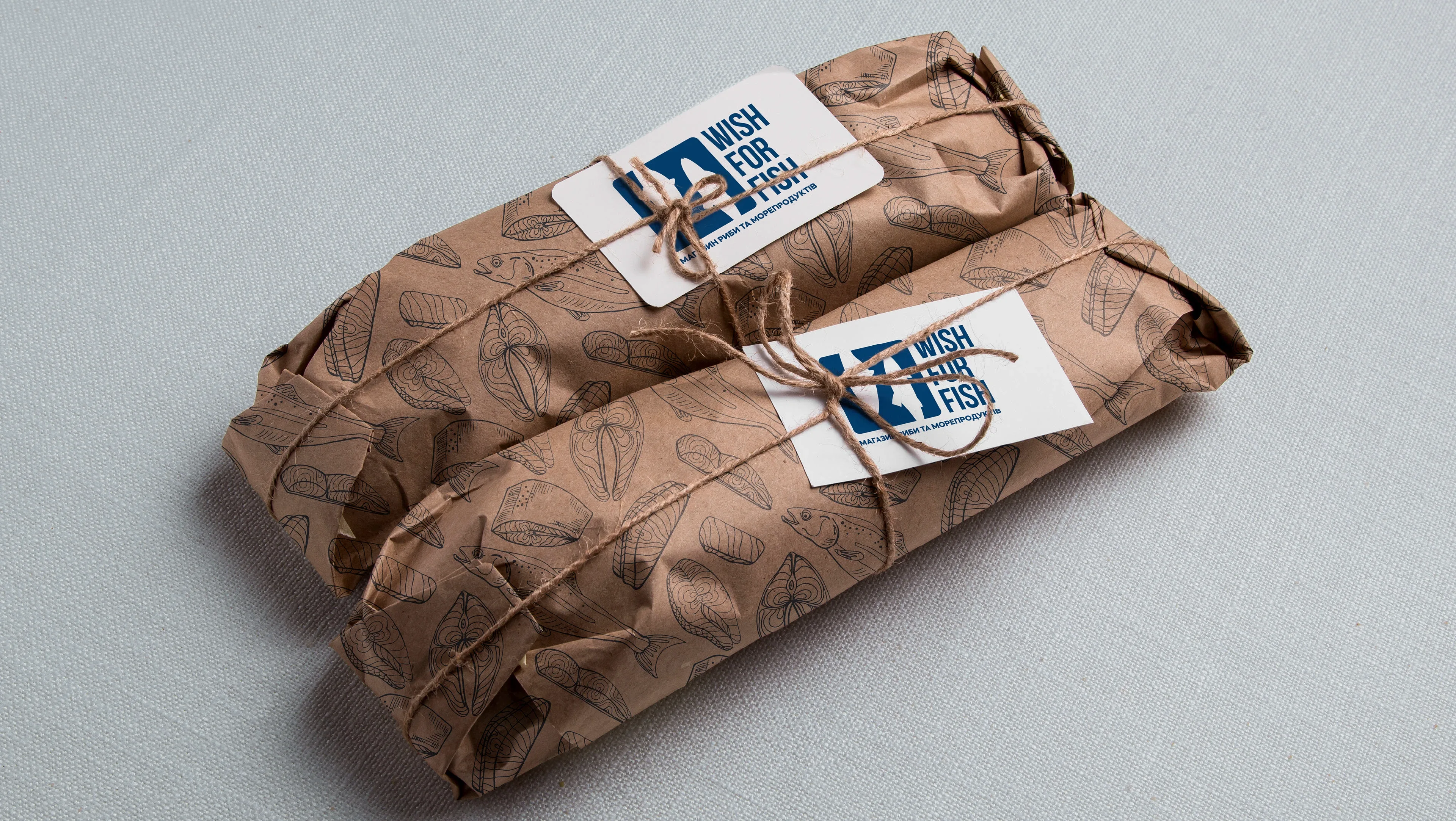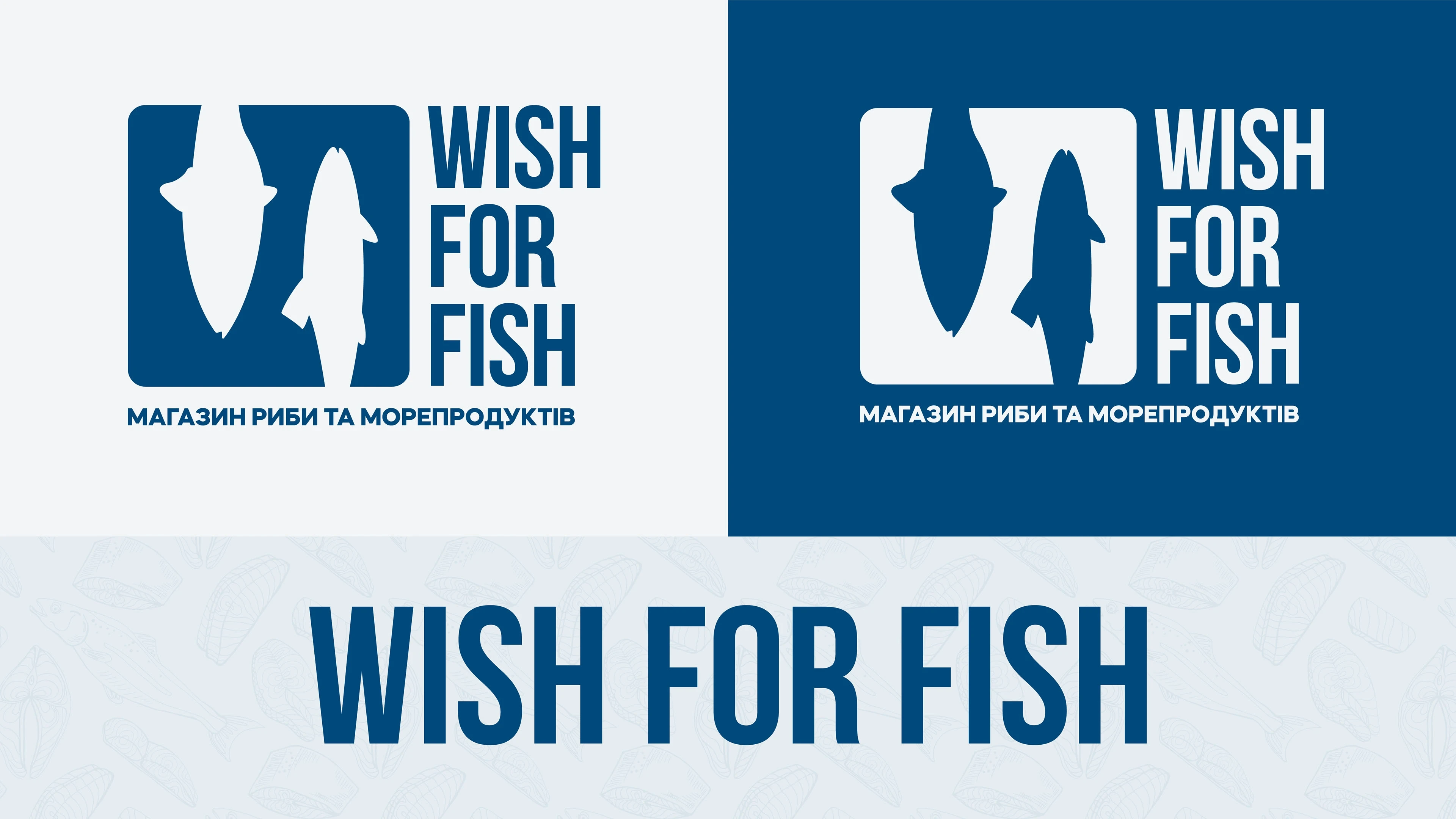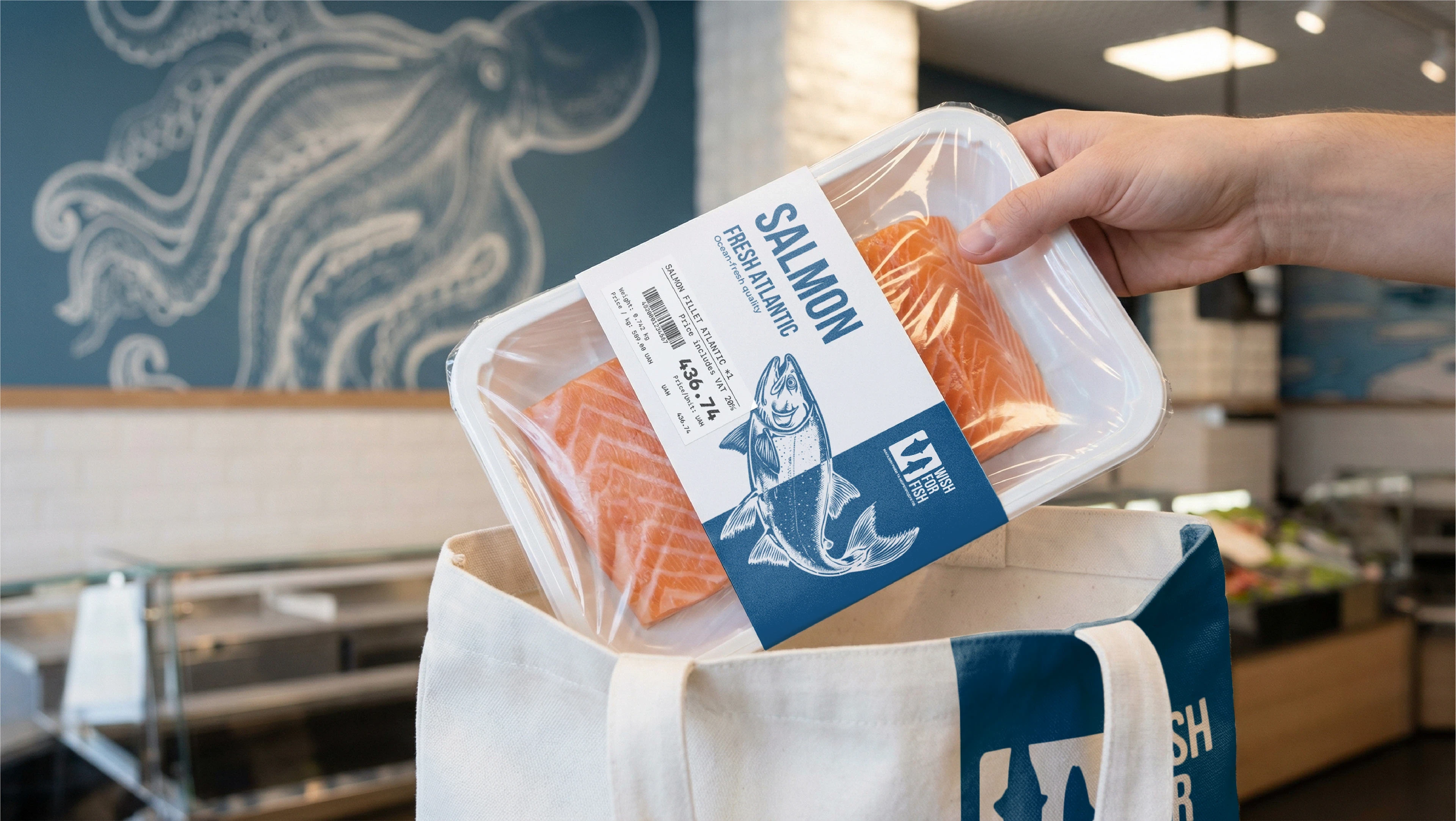 Full brand identity for a fish & seafood retail shop. Logo, packaging, labels, thermal bags, branded tape, loyalty cards, and in-store assets.