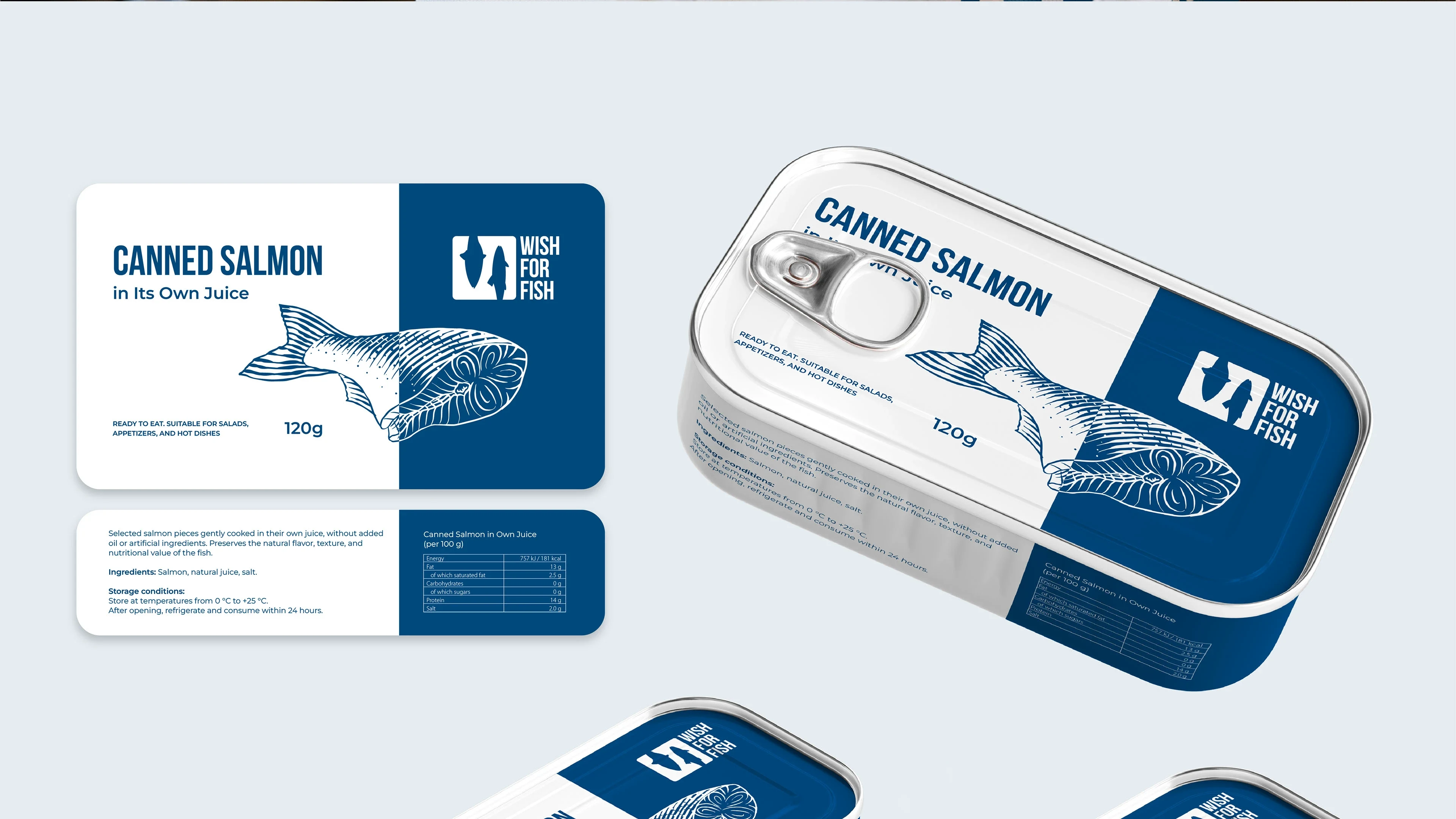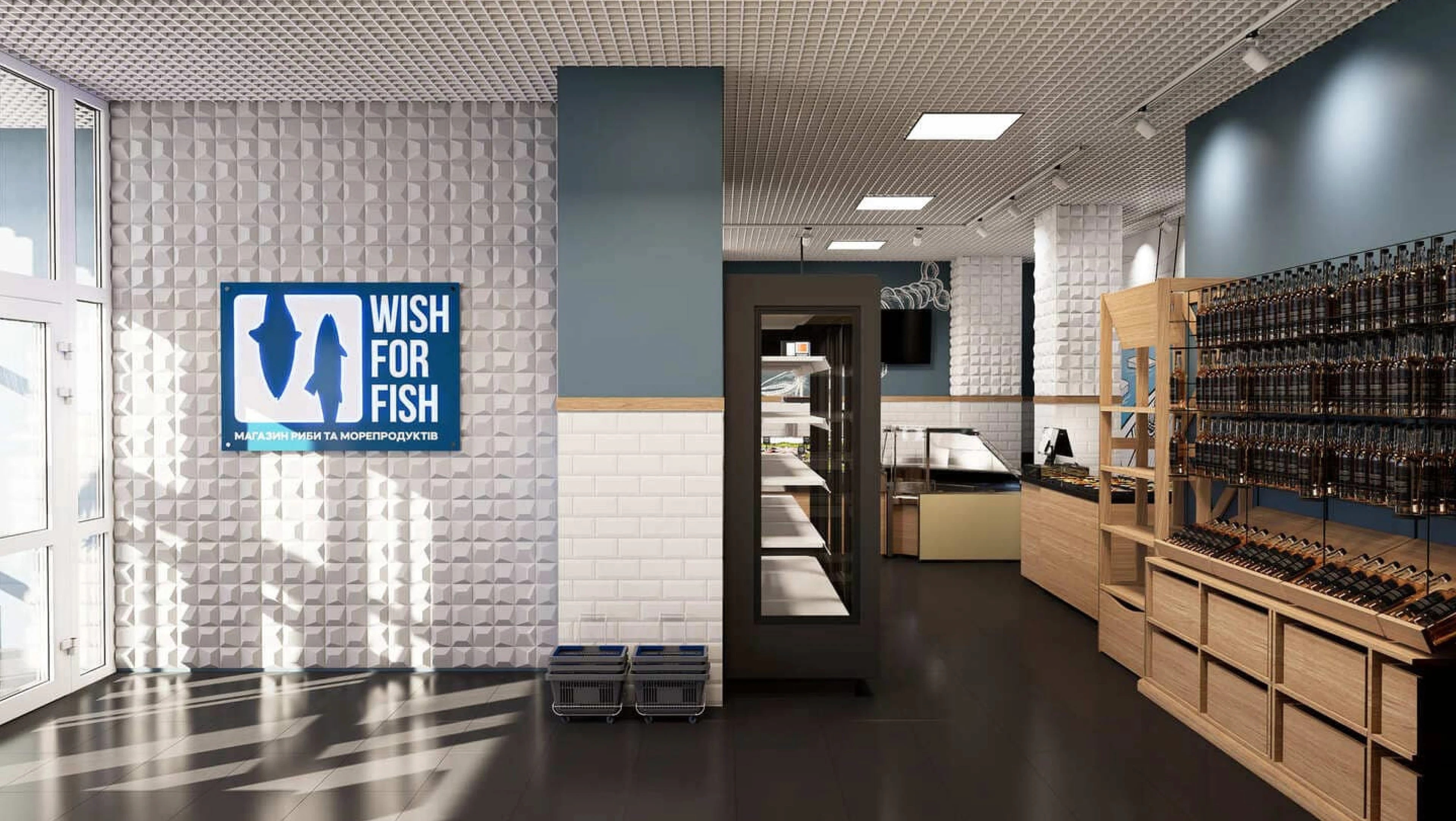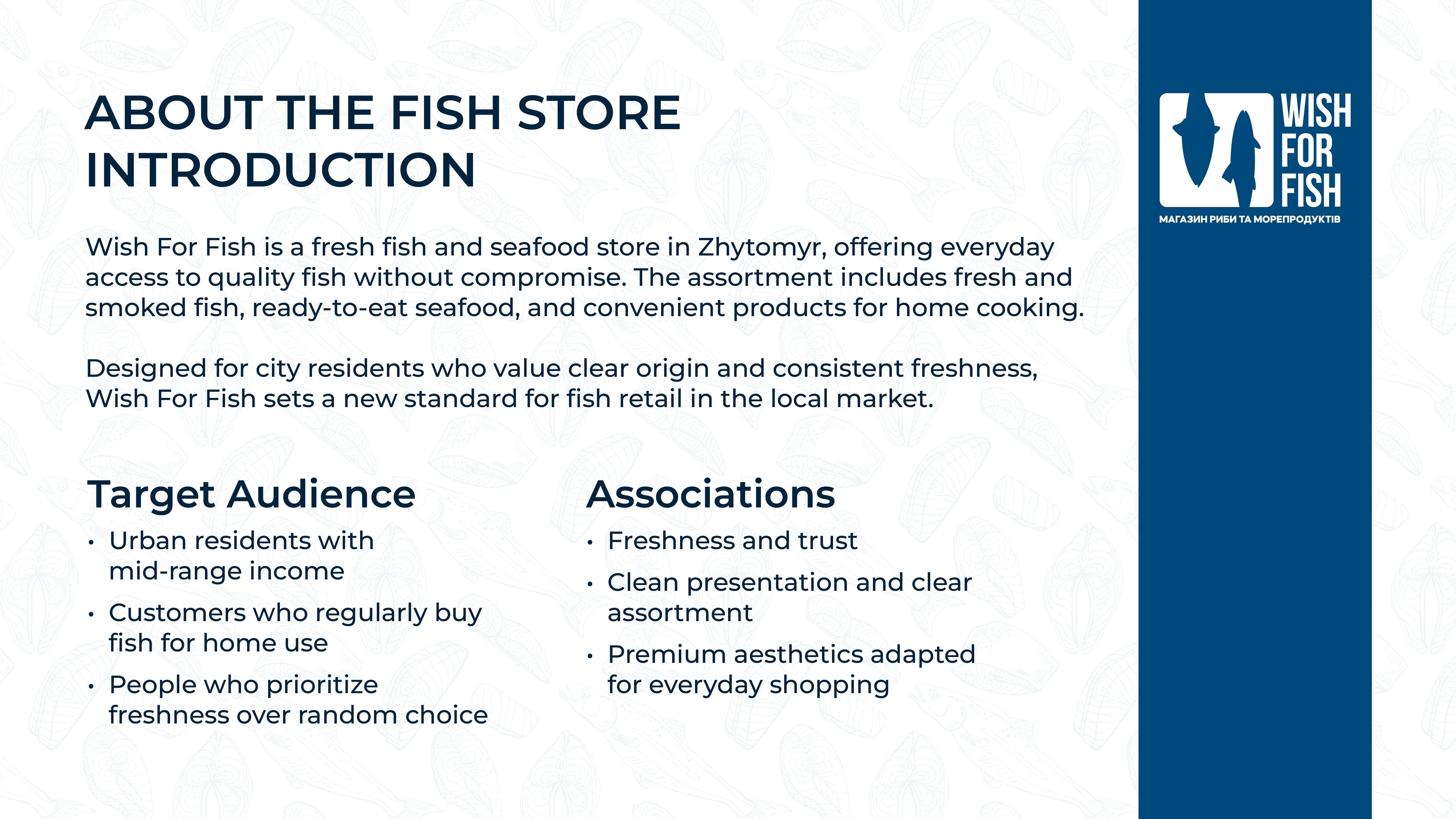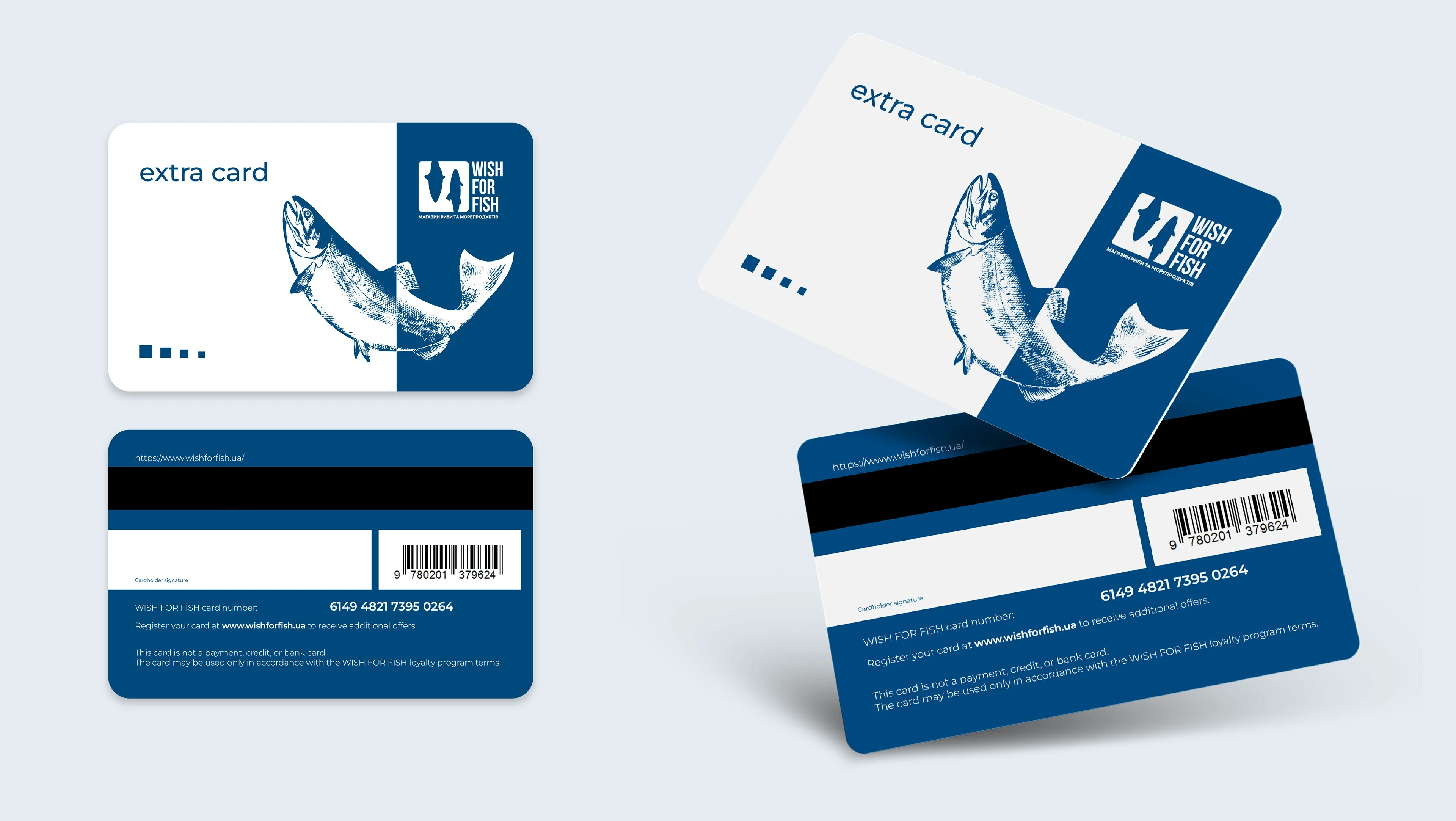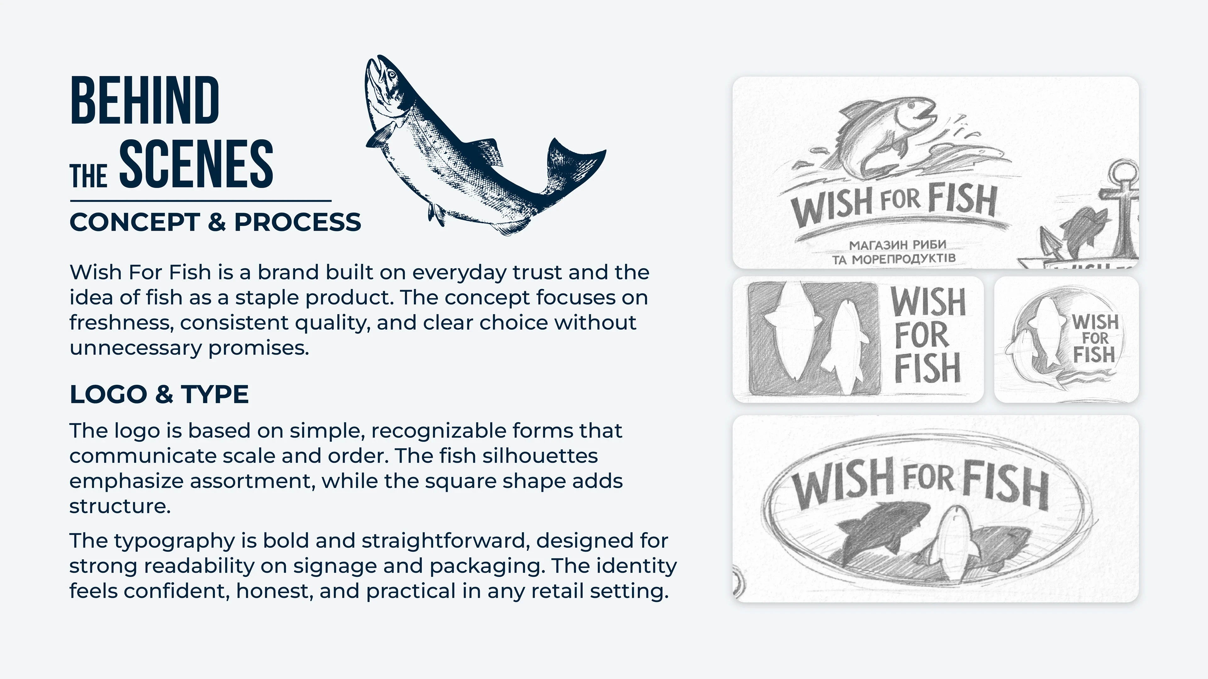 Full brand identity for a fish & seafood retail shop. Logo, packaging, labels, thermal bags, branded tape, loyalty cards, and in-store assets.
