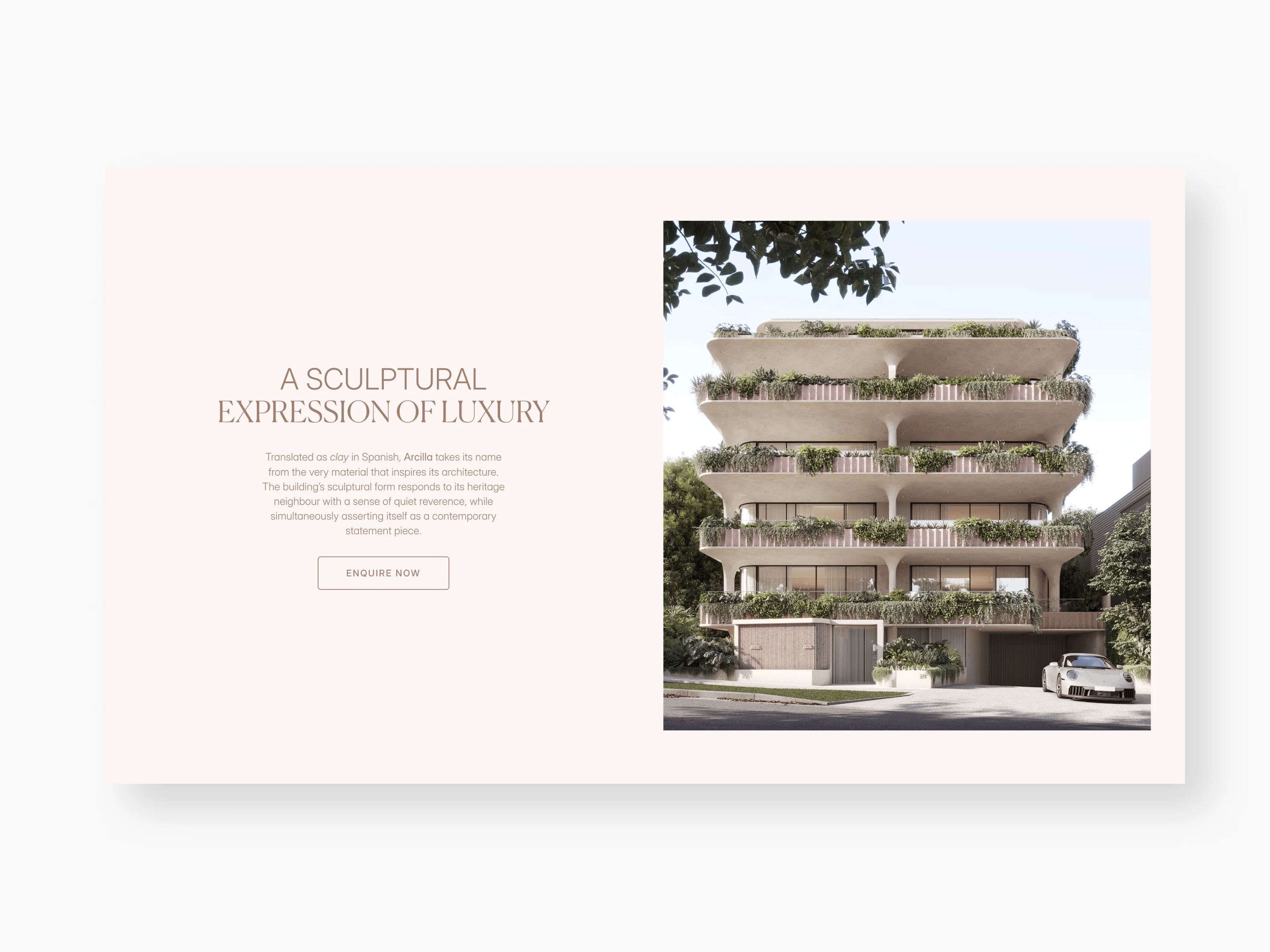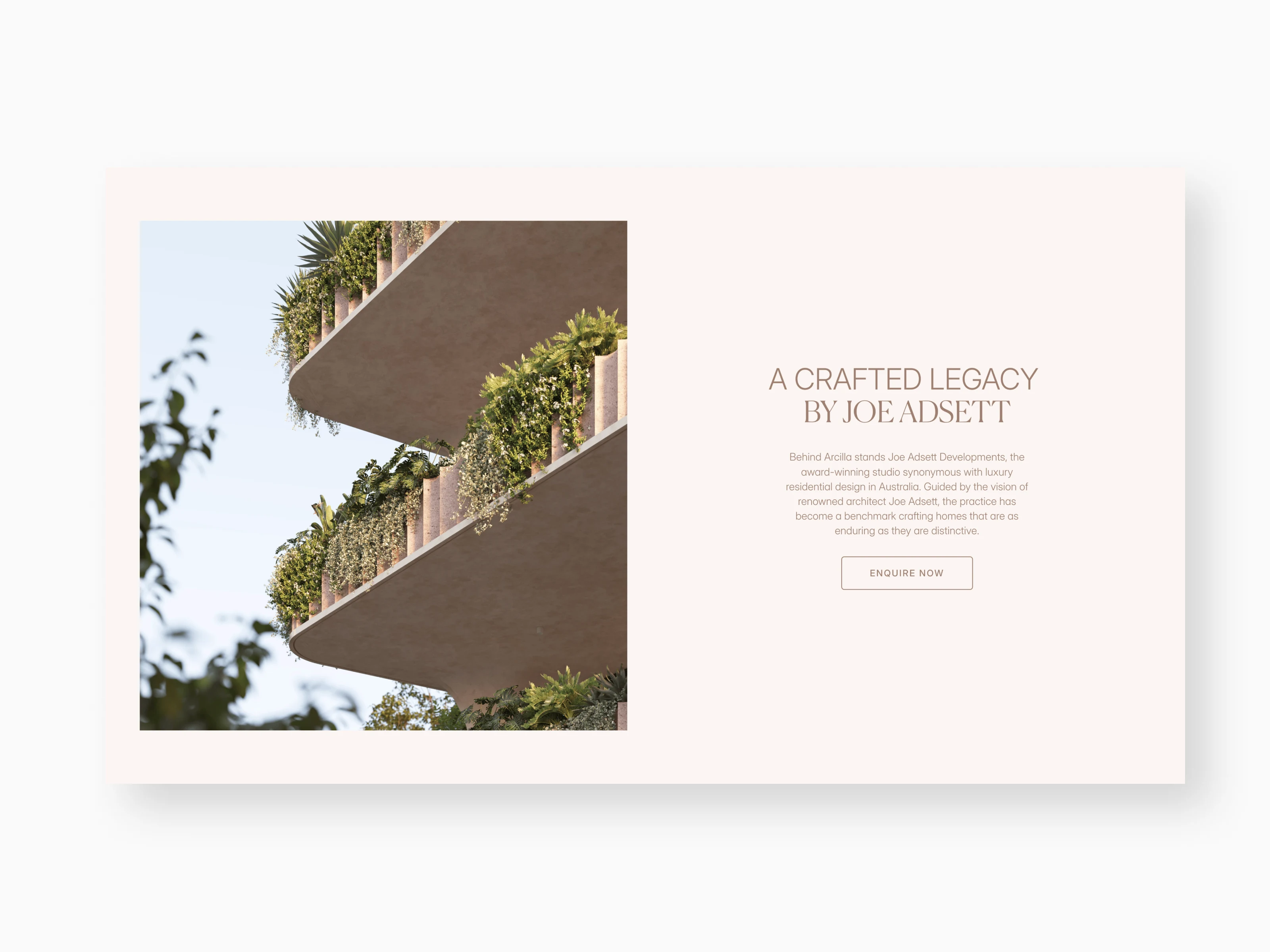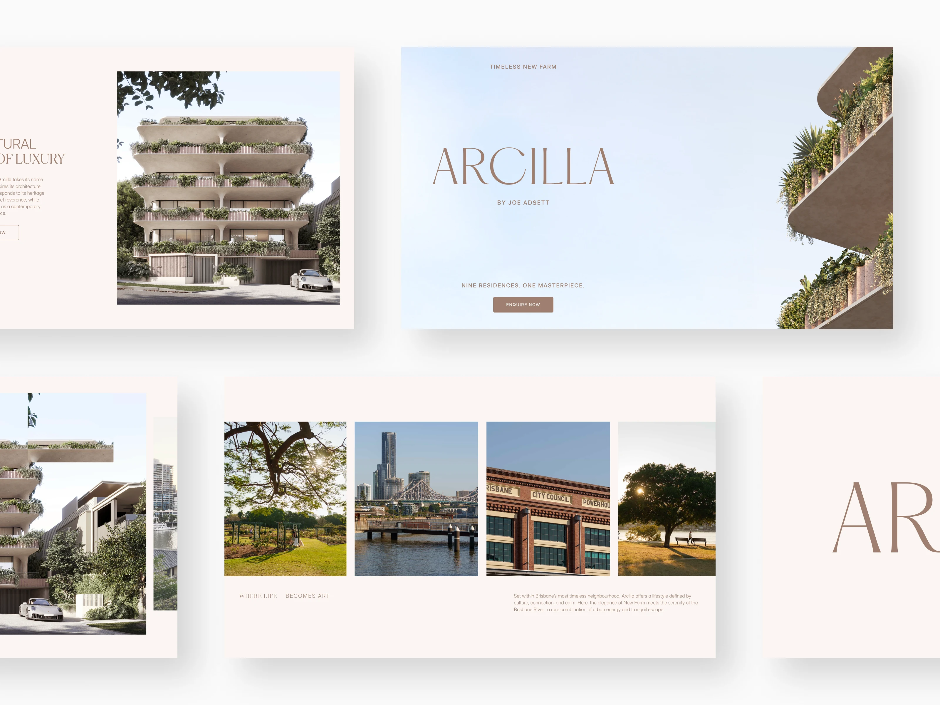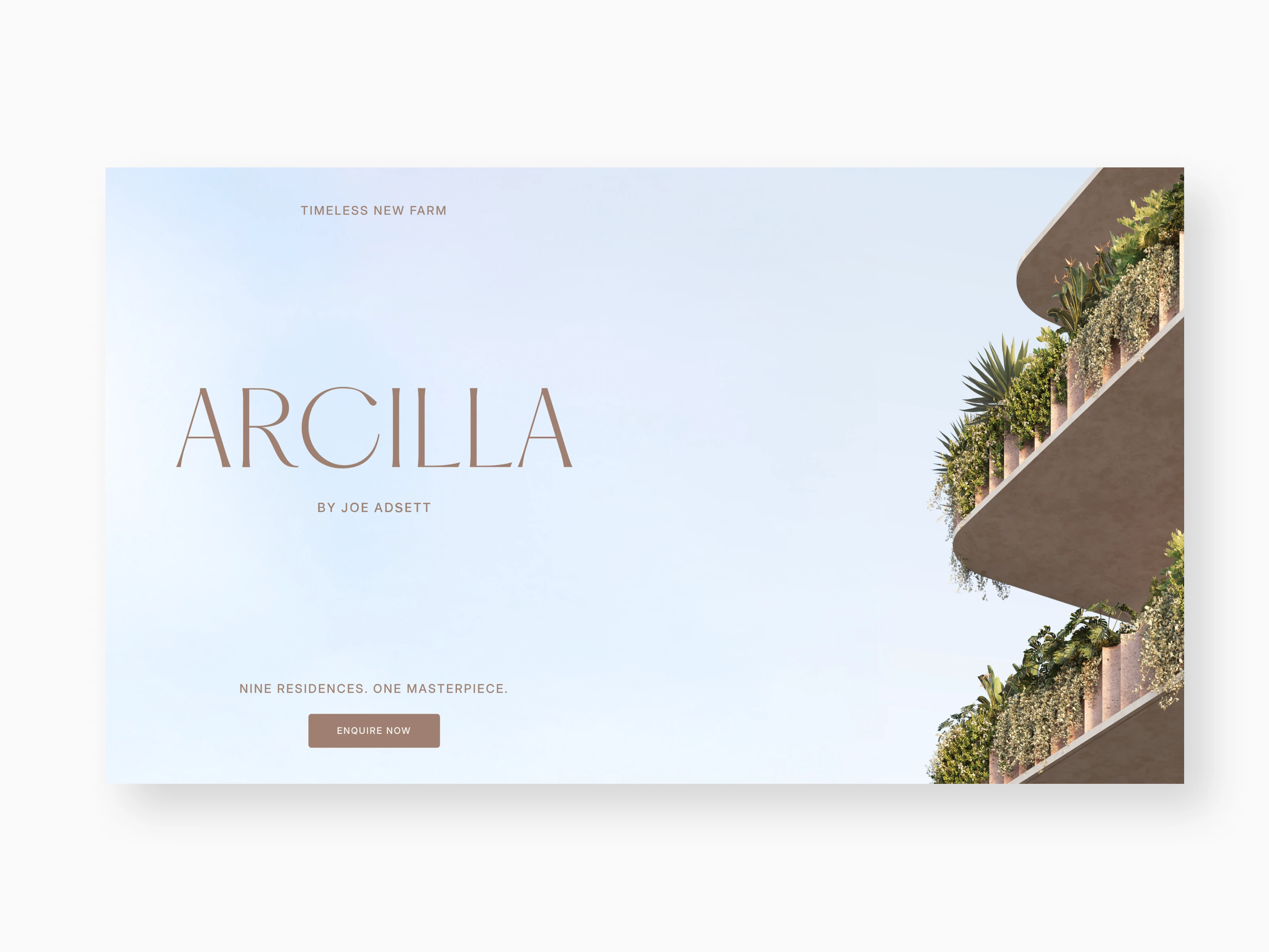 Arcilla is an ultra-boutique collection of nine luxury residences located in the timeless New Farm neighborhood. I designed a sophisticated waitlist experience for Joe Adsett Developments to showcase the project’s "sculptural expression of luxury" and capture high-intent inquiries prior to launch.