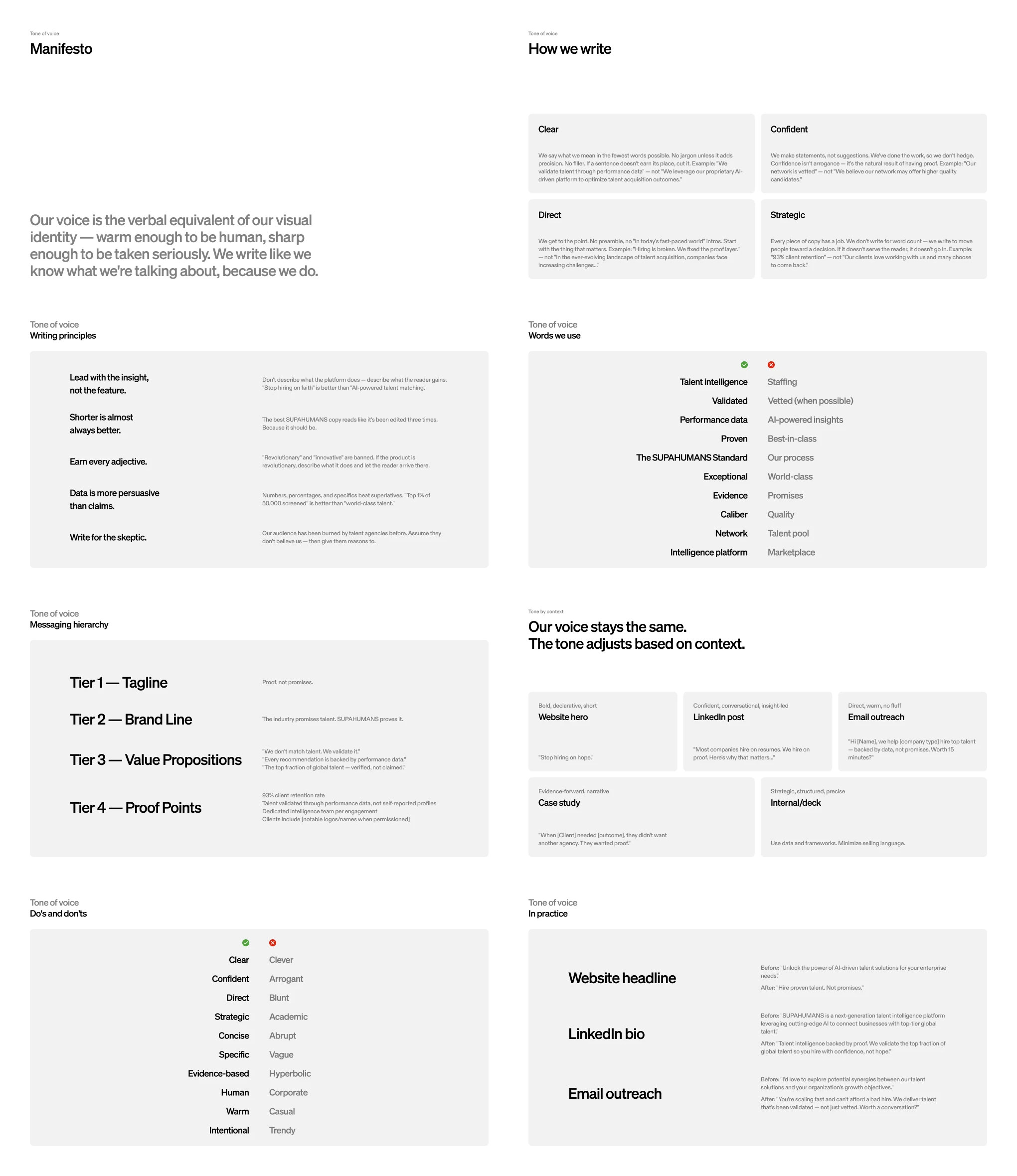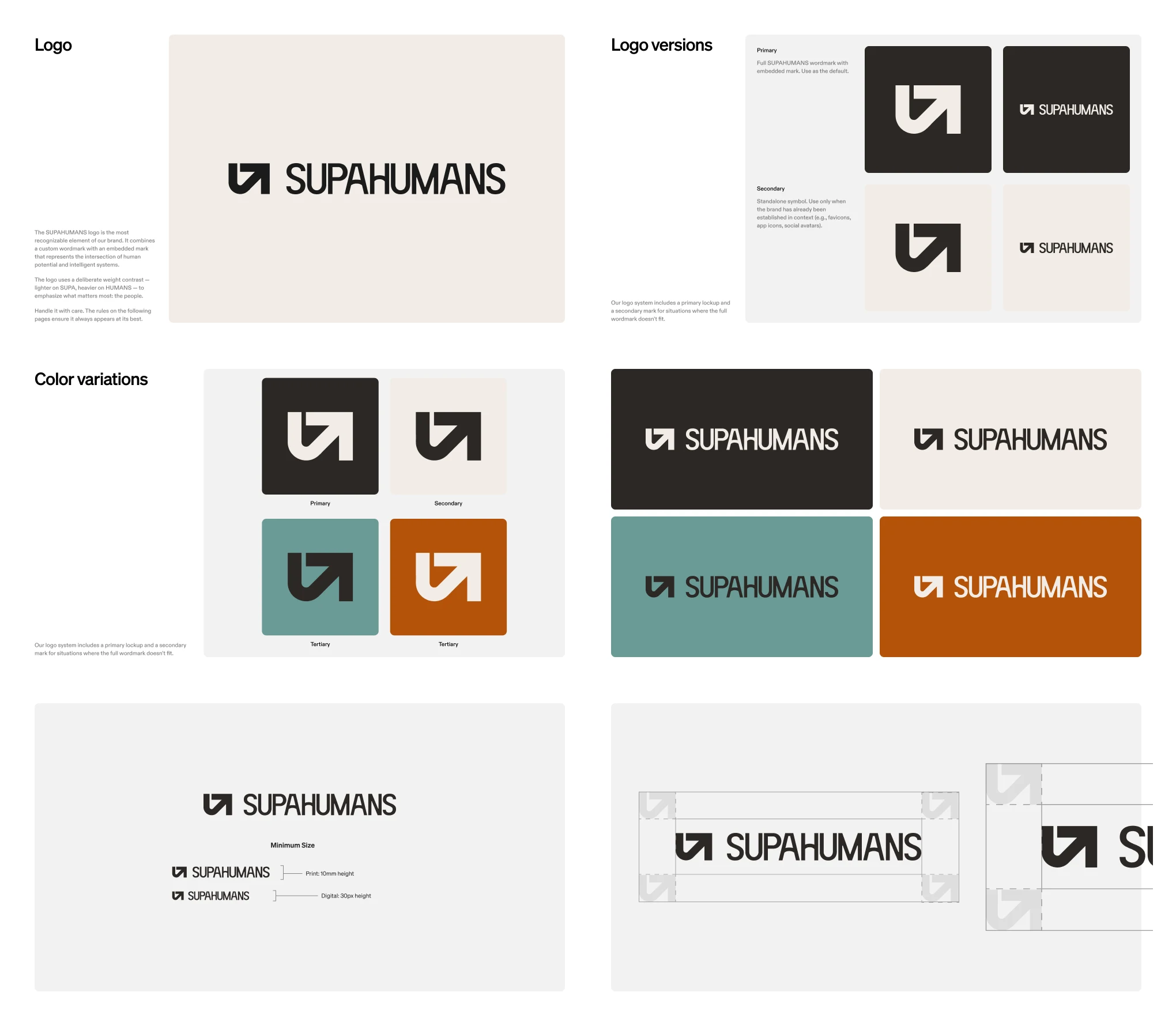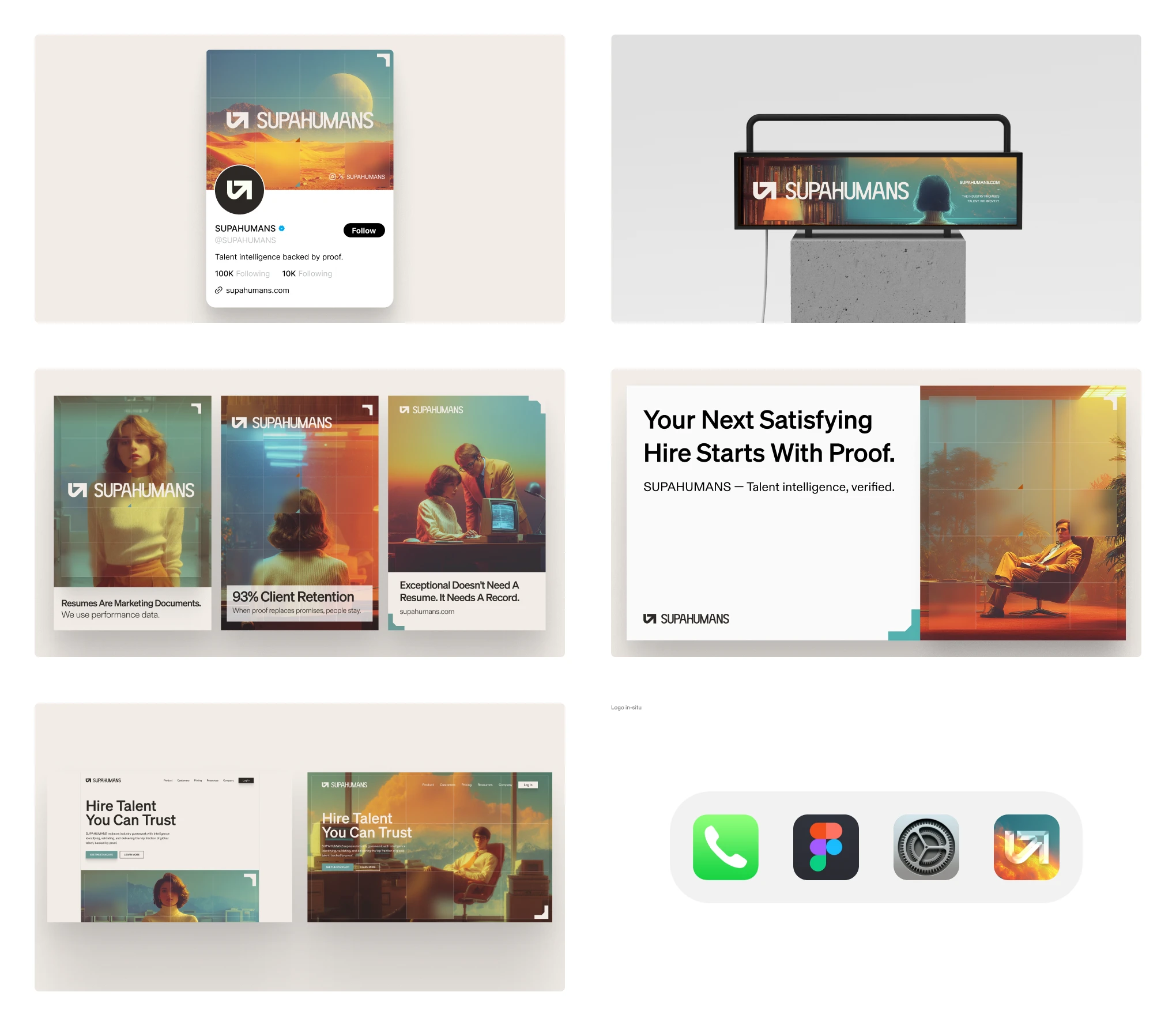The wordmark is restrained, Söhne and ABC Diatype, weights borrowed from quarterly reports, not Series A decks. A small custom glyph sits between SUPA and HUMANS, the only nod to the technology underneath. The color palette refuses every saturated startup primary in favor of warm charcoal, dusty teal, sand, deep amber. The photography is split into two tracks, illustrated worlds and analog portraits — both graded into the same amber-to-teal split-tone, so the entire image library reads as one continuous shoot taken across two different decades. The voice is declarative and unhyped: AI-certified. Human-verified. Placed in 24 hours. No "future of work." No "unlock your potential." No verbs that don't earn their keep.