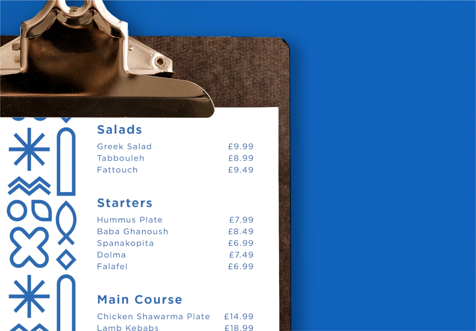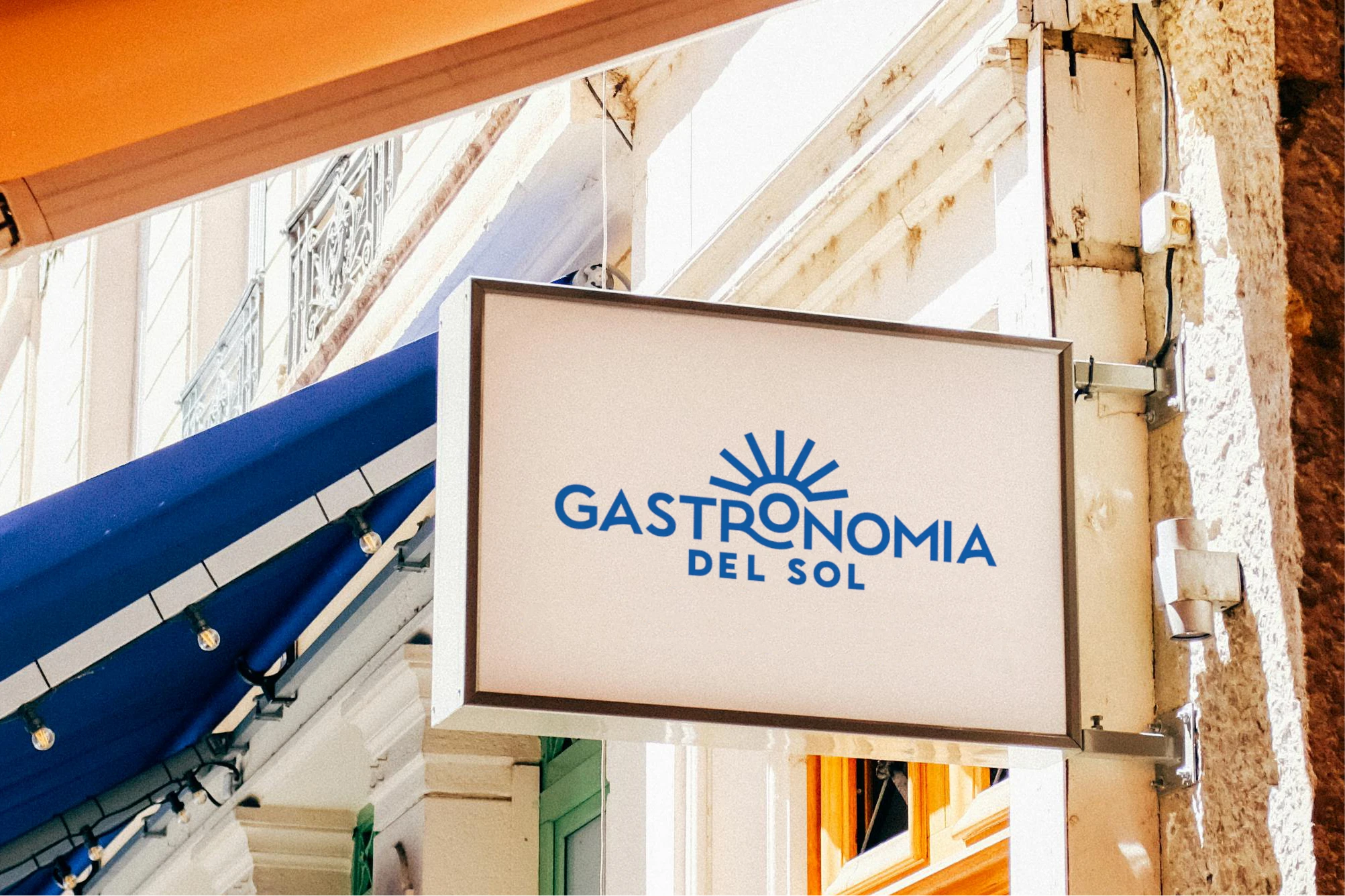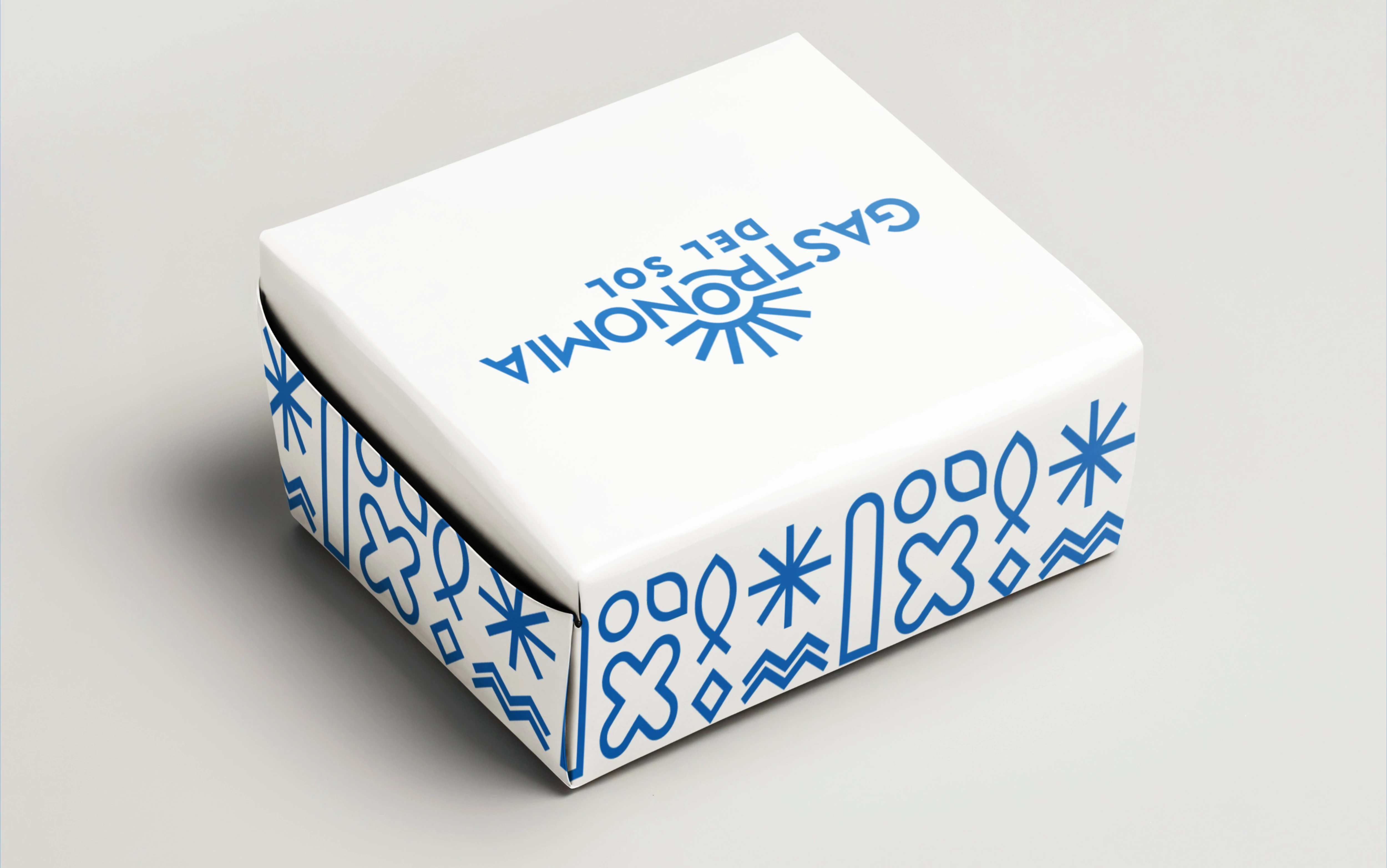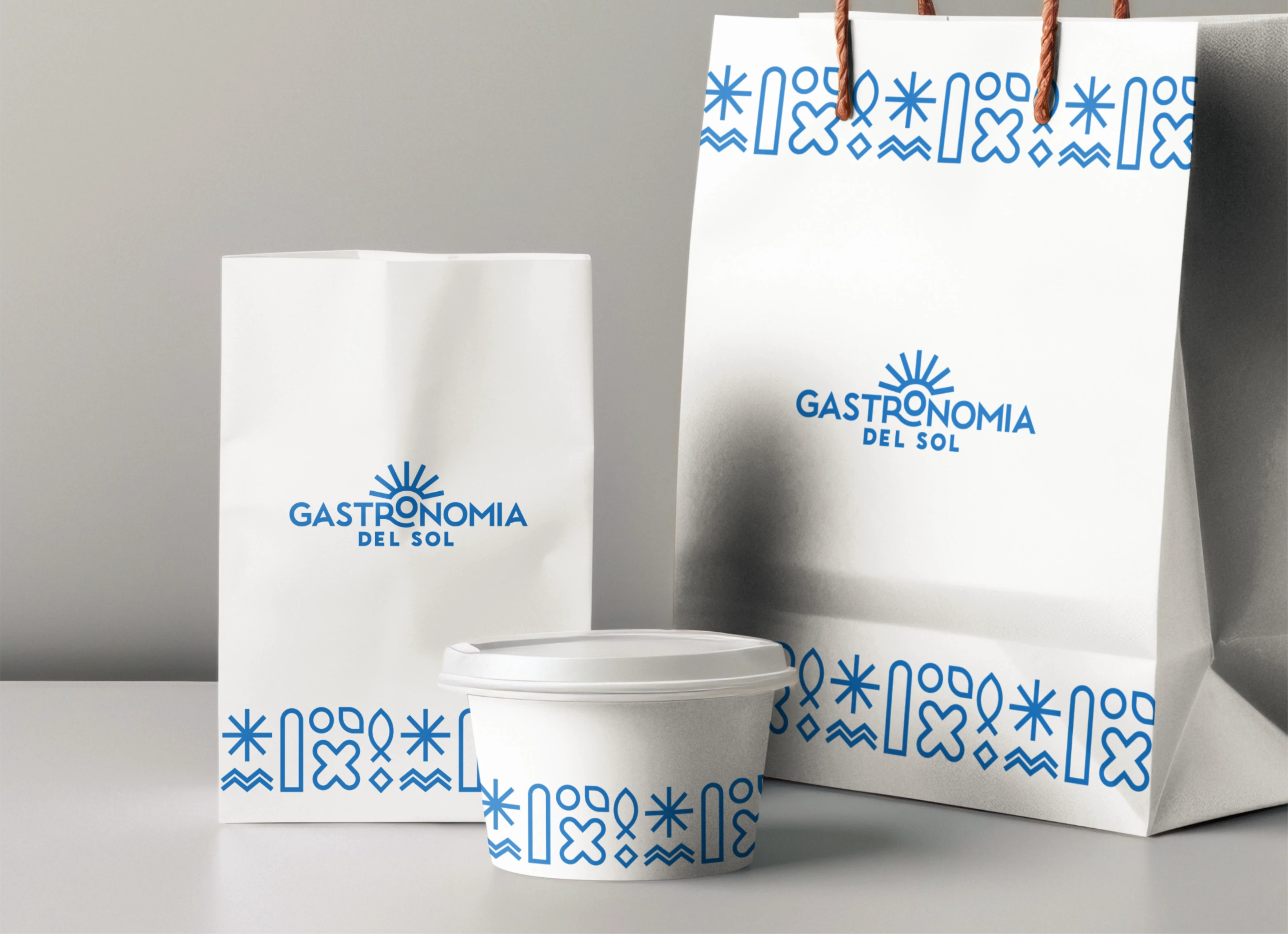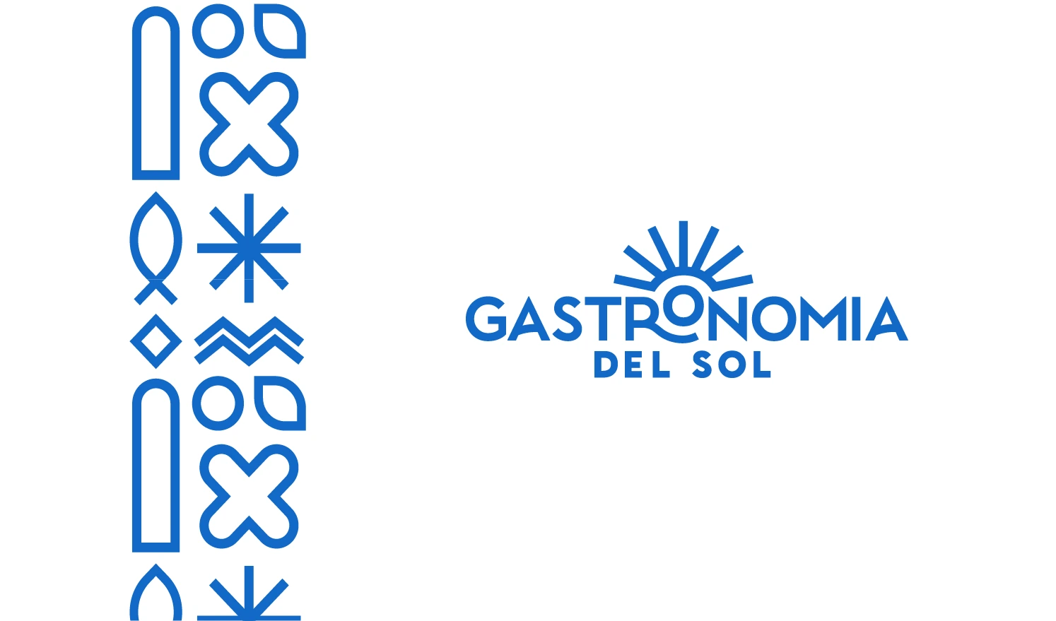Gastronomía del Sol is a Mediterranean restaurant. Inspired by Azulejos tiles, the brand identity uses modular illustrations in a clean monoline style.