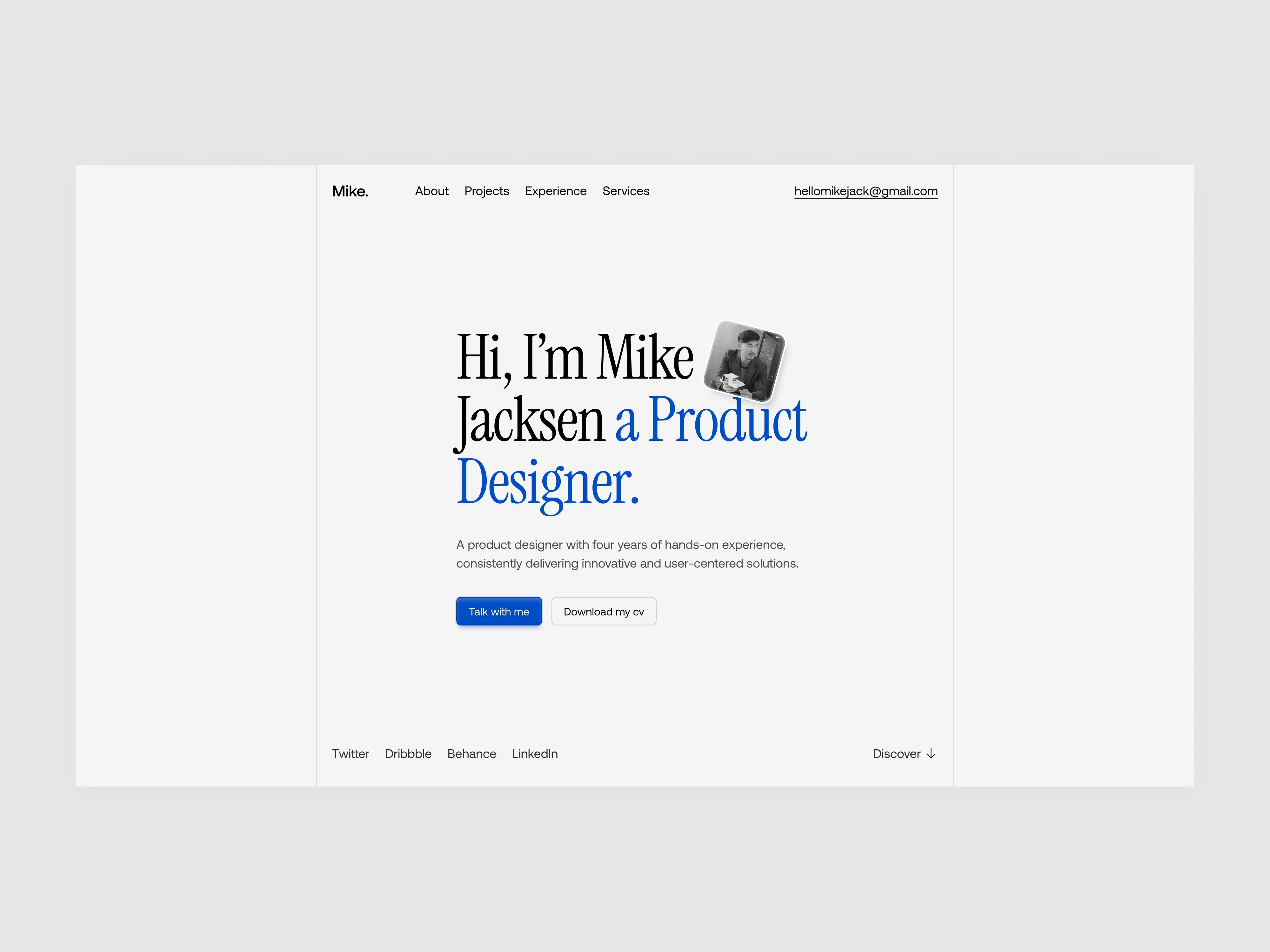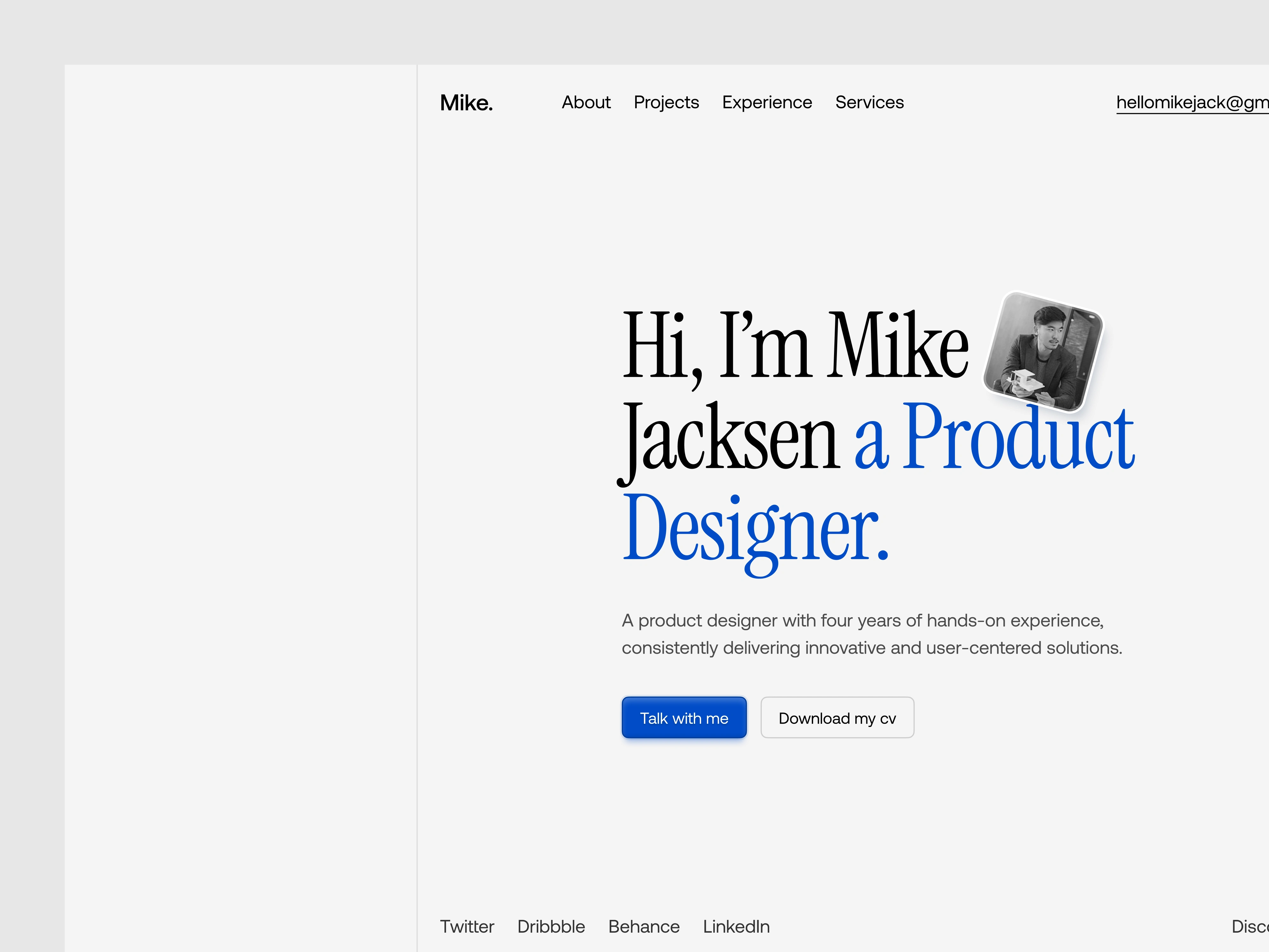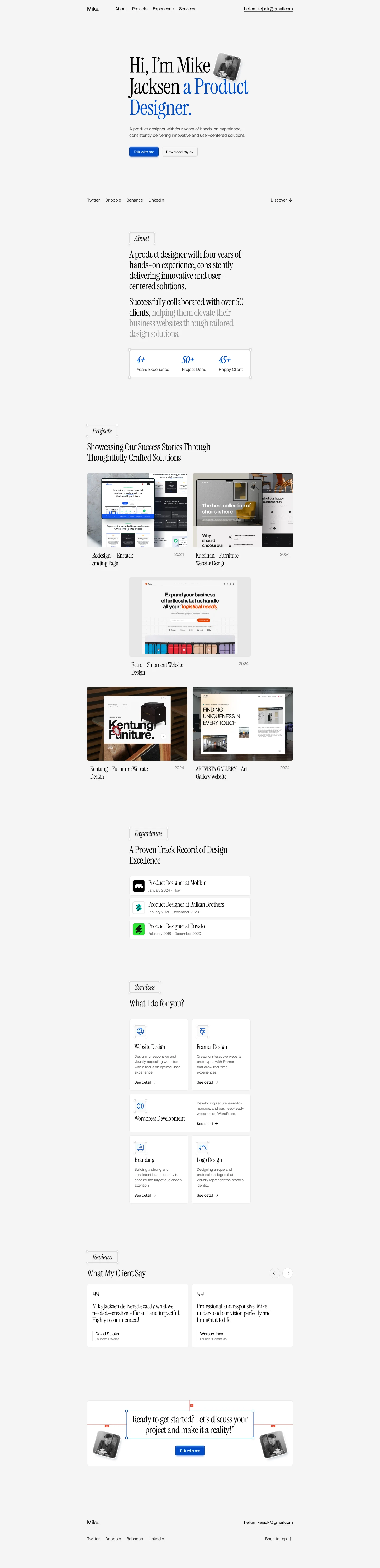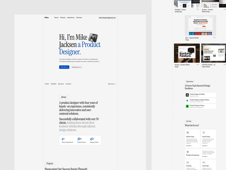 Presenting a uniquely modern landing page for a product designer. This design blends creativity and innovation, offering a clean, visually striking interface that highlights the designer's work and expertise. Perfect for showcasing portfolio pieces while ensuring an engaging user experience.