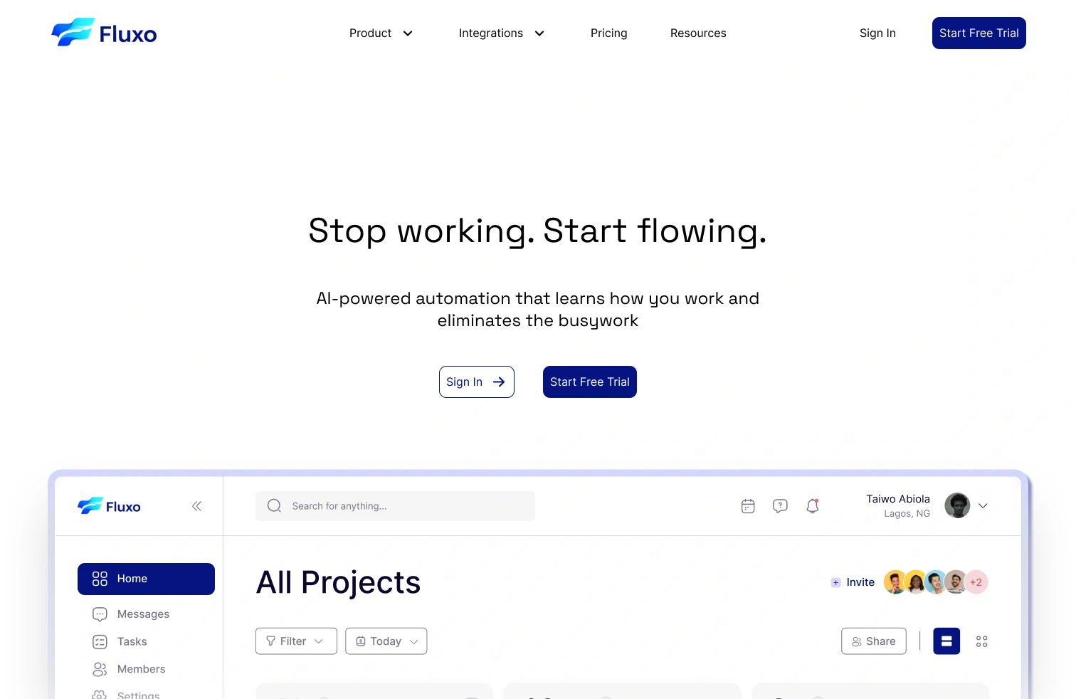 I'm currently designing FLUXO's landing page experience, starting with a hero section that balances bold messaging with product clarity. The hero features a clean, minimalist approach with the headline "Stop working. Start flowing." in large, confident typography that immediately communicates the core value proposition. I kept the headline to exactly 32 characters (including spaces and punctuation) to maintain visual impact while ensuring readability across all devices. Below the headline, I crafted a concise subheadline that explains the product in plain language: "AI-powered automation that learns how you work and eliminates the busywork." This subheadline stays within optimal length for scanning while delivering clear product understanding without jargon. I designed dual CTAs with "Sign In" as a secondary ghost button with an arrow icon for returning users, and "Start Free Trial" as the primary action in deep navy blue, creating clear hierarchy and reducing decision friction. The layout uses generous whitespace and center alignment to create focus and breathing room, letting the message land without distraction or visual competition. Below the fold, I integrated a large product screenshot showcasing the actual Fluxo interface with a subtle glassmorphic border treatment and elevated shadow that adds depth and premium feel without overdoing effects. The screenshot displays a clean dashboard with "All Projects" as the main view, collaborative features like color-coded team member avatars with a "+2" indicator, and intuitive left-sidebar navigation including Home, Messages, Tasks, Members, and Settings, giving visitors an immediate understanding of the product's organization and team-centric features. The interface preview shows real, functional UI elements like filter dropdowns, "Today" date selectors, "Share" buttons, and a compact grid icon menu, making the product feel tangible, production-ready, and immediately usable rather than conceptual or vaporware. My navigation design uses a clean horizontal layout with subtle dropdown indicators on "Product" and "Integrations," keeping the header minimal while suggesting content depth. The right side of the nav features "Sign In" in simple text and "Start Free Trial" in a rounded navy button, maintaining CTA consistency between header and hero. The Fluxo logo uses a modern layered gradient icon (vibrant blue to cyan creating a flowing wave effect) paired with clean sans-serif wordmark, establishing strong brand identity and the "flow" concept without overwhelming the minimal aesthetic.