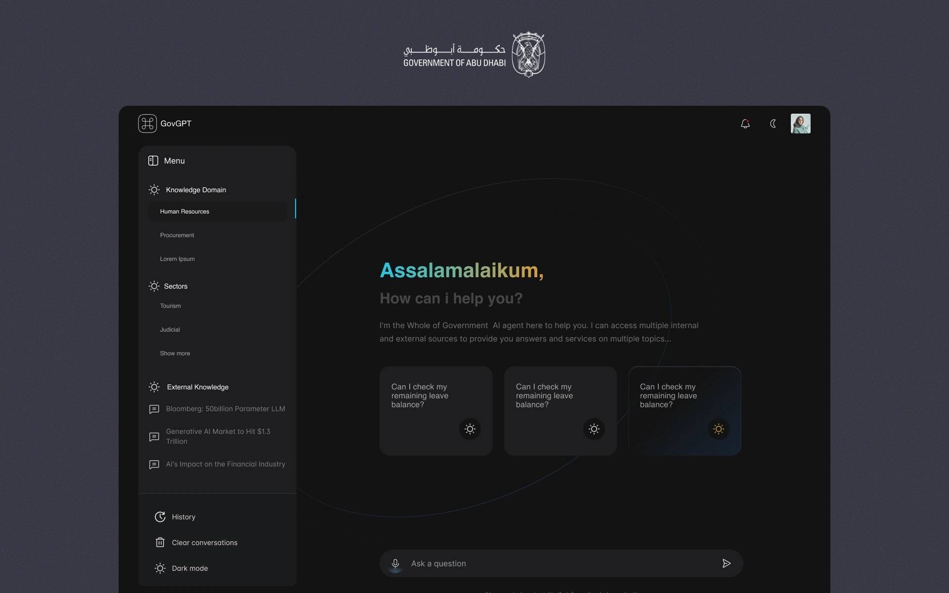 GovGPT is Abu Dhabi Government’s secure generative AI platform designed to streamline access to government information and services. I led the design of the platform, focusing on usability, trust, and seamless interaction across multiple government entities — ensuring a cohesive experience for citizens, employees, and decision-makers.