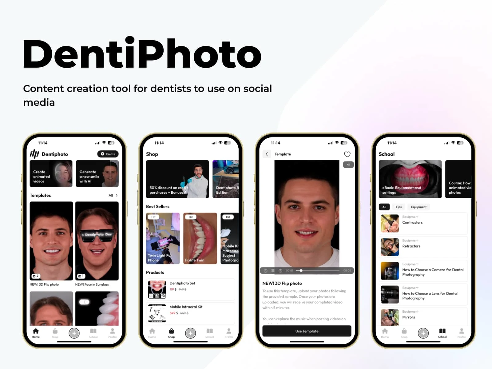 DentiPhoto is a mobile app that helps dentists and clinics generate animated visual content based on patient photos. It streamlines the process of showcasing dental transformations and product promotions.