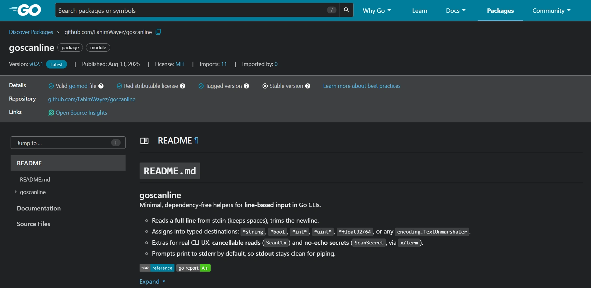 I built and published GoScanLine, a lightweight Go package that simplifies taking multi-word input from the command line. In raw Go, 'fmt.Scanln' stops at the first space, forcing developers to write extra boilerplate with 'bufio.Reader'. GoScanLine abstracts this into a simple, reusable function for full-line input. The package is live on