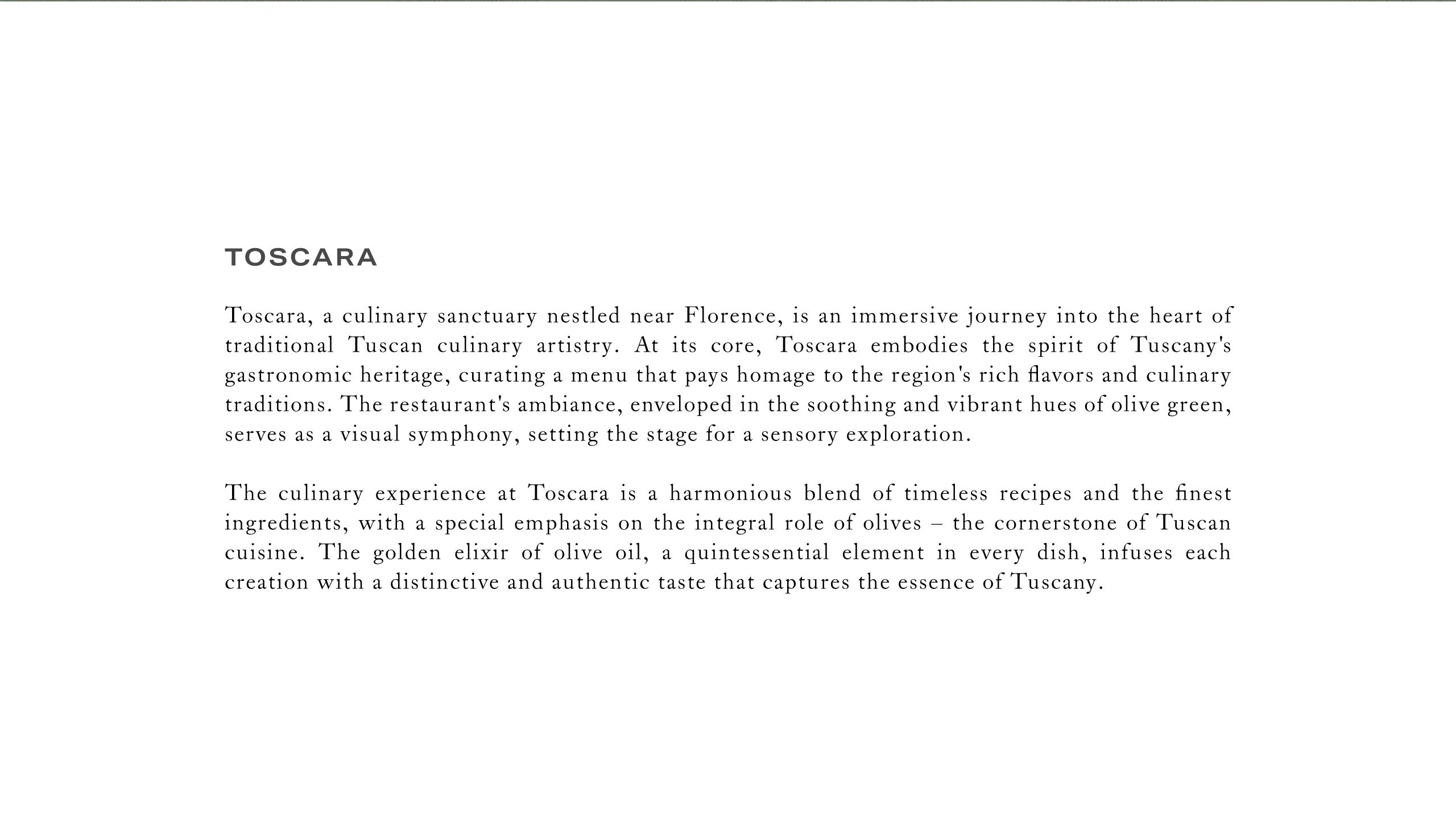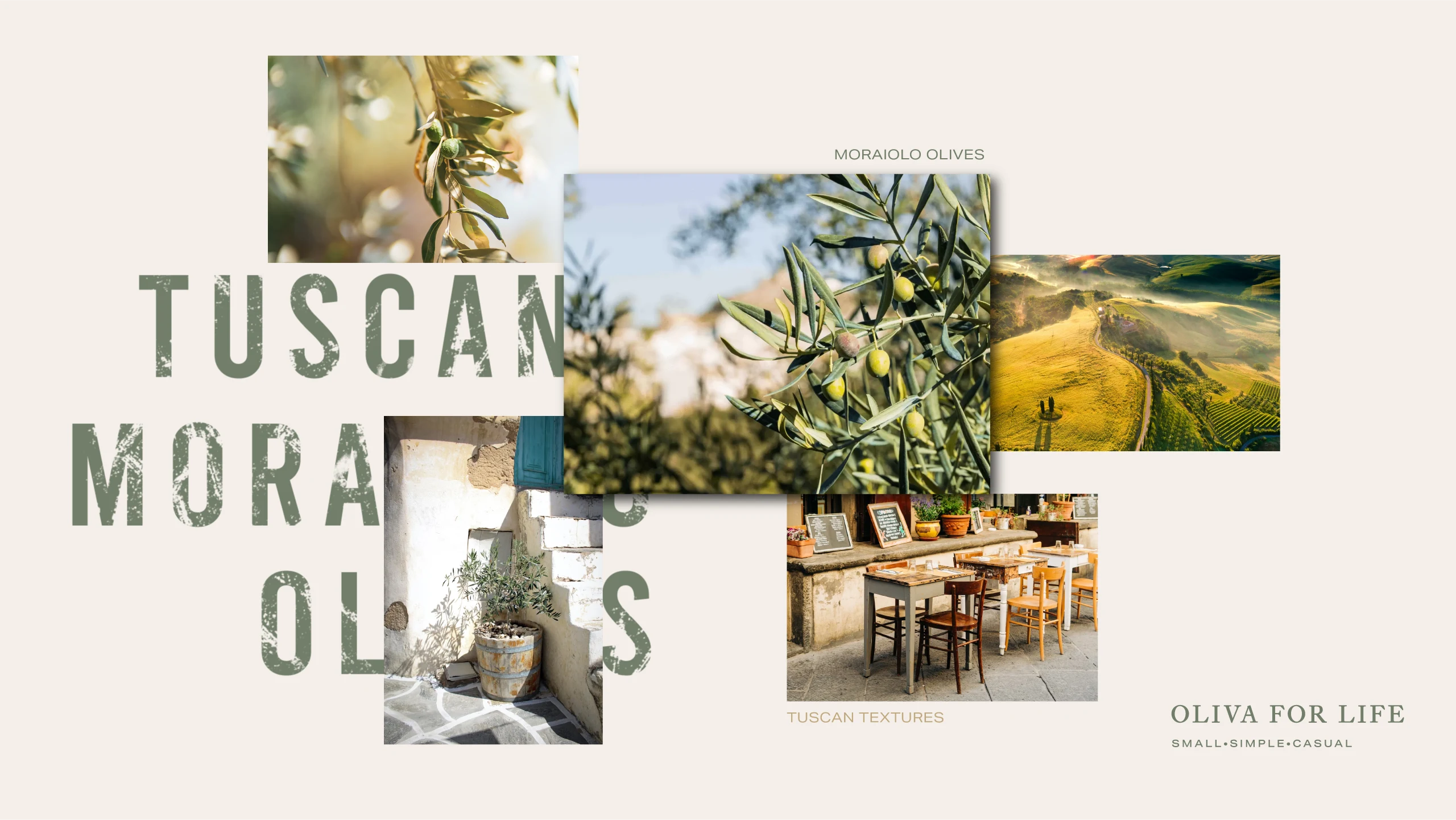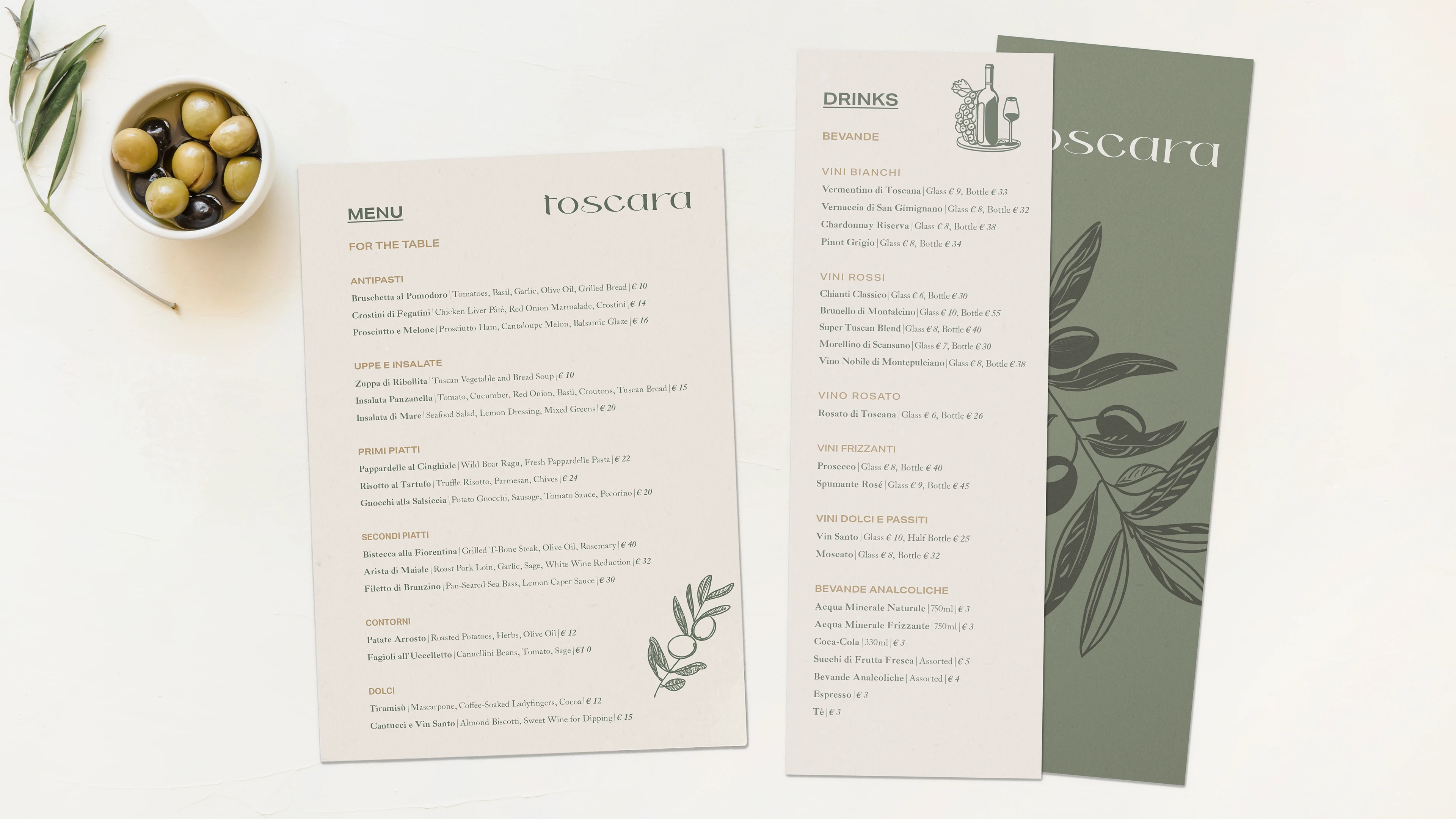 Branded Toscara to capture Tuscan culinary tradition, emphasizing olives and authentic flavors, reflecting Tuscany's heritage and serene ambiance.