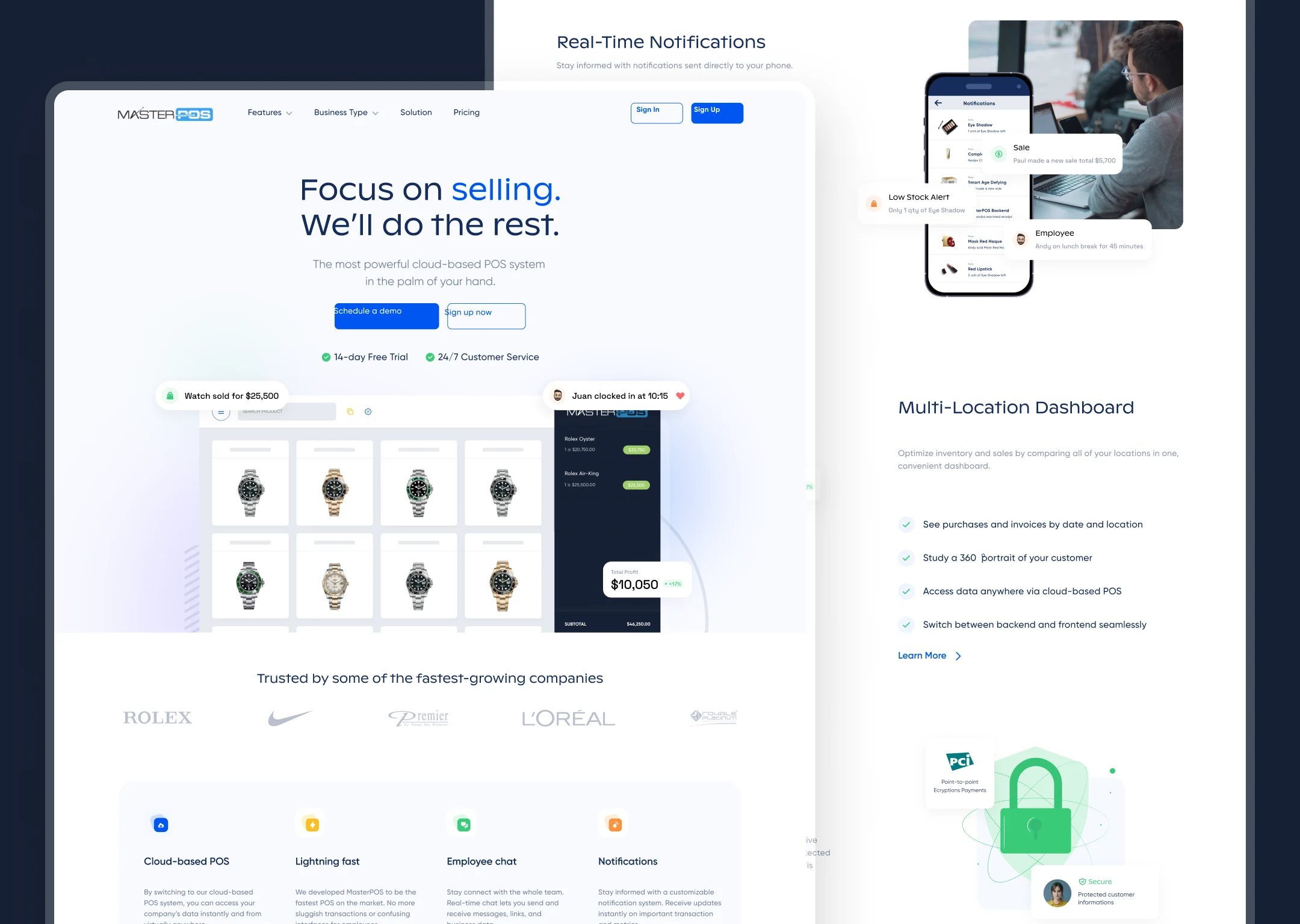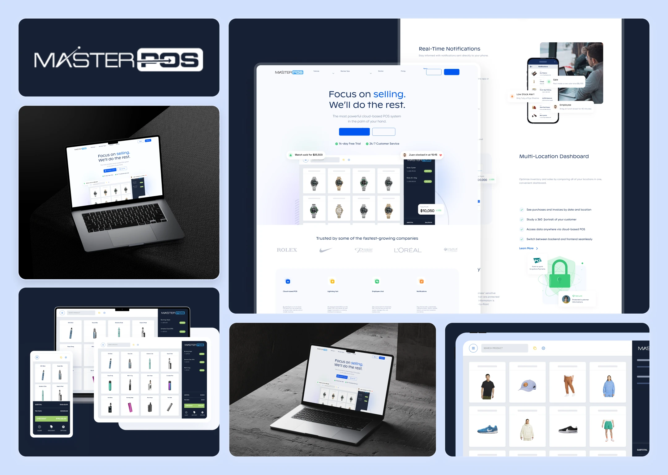 MasterPOS provides cloud-based point-of-sale systems for retailers of all sizes. The platform integrates CRM, accounting, inventory management, employee tracking, and mobile POS capabilities—serving 5,000+ customers across 9,000+ locations with 247M+ transactions processed.