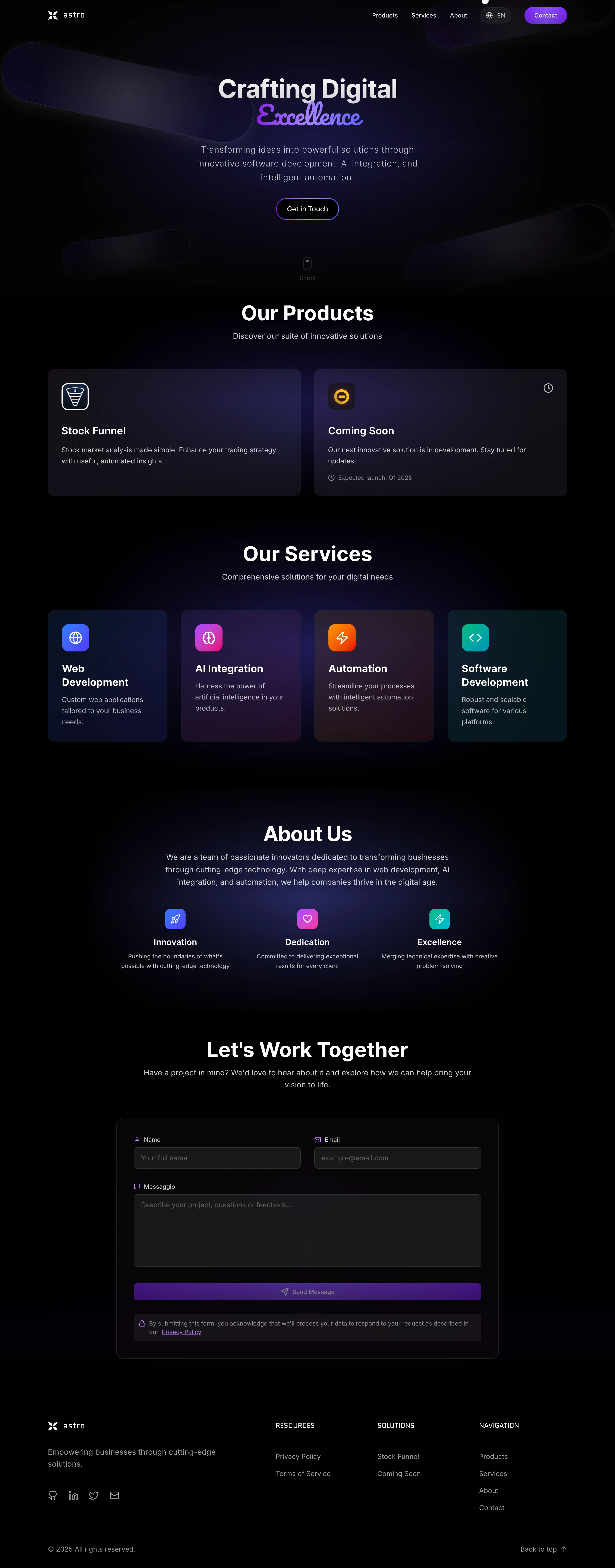This is a sleek, dark-themed landing page designed to showcase digital products and services. The goal was to guide visitors through a clear narrative path: