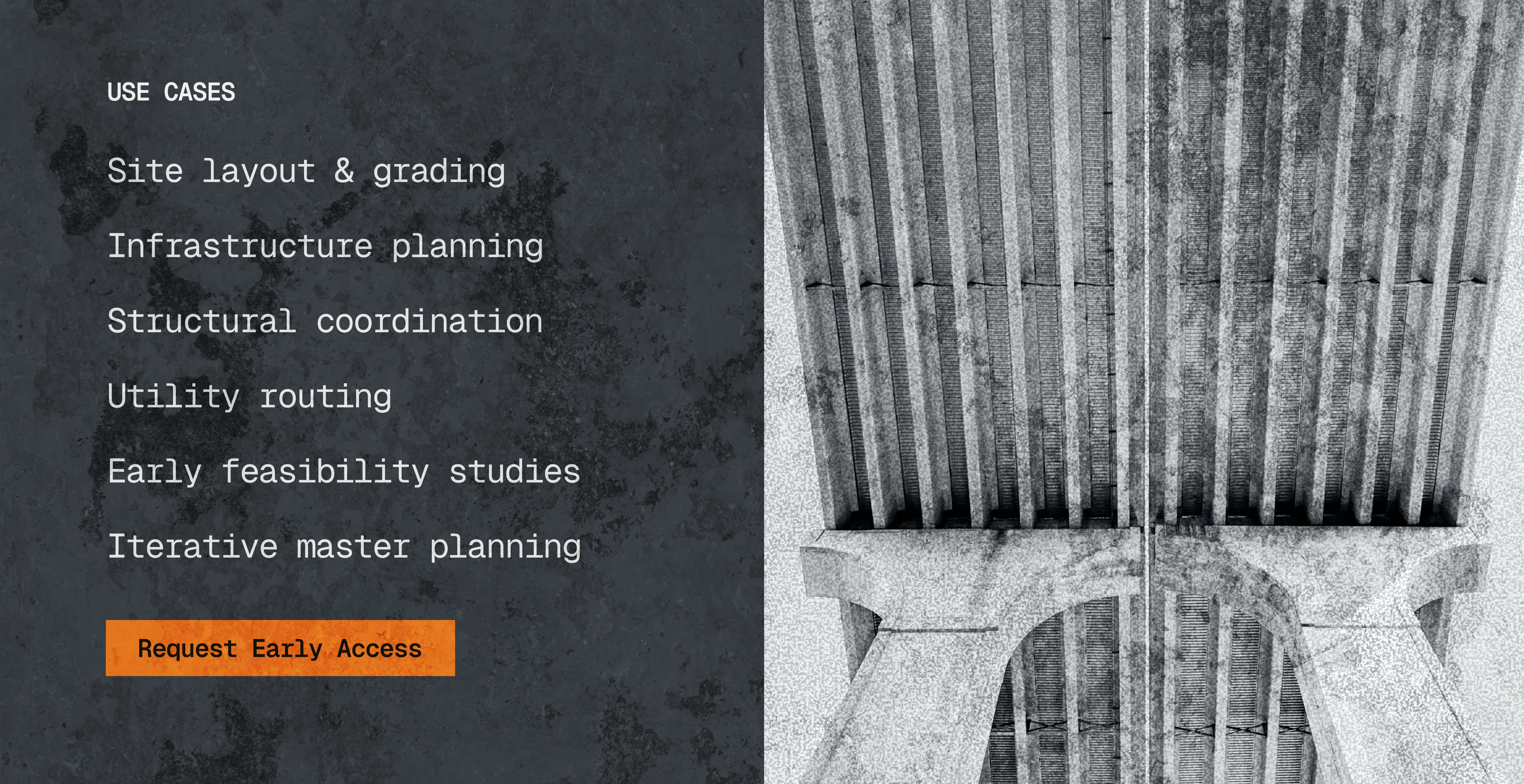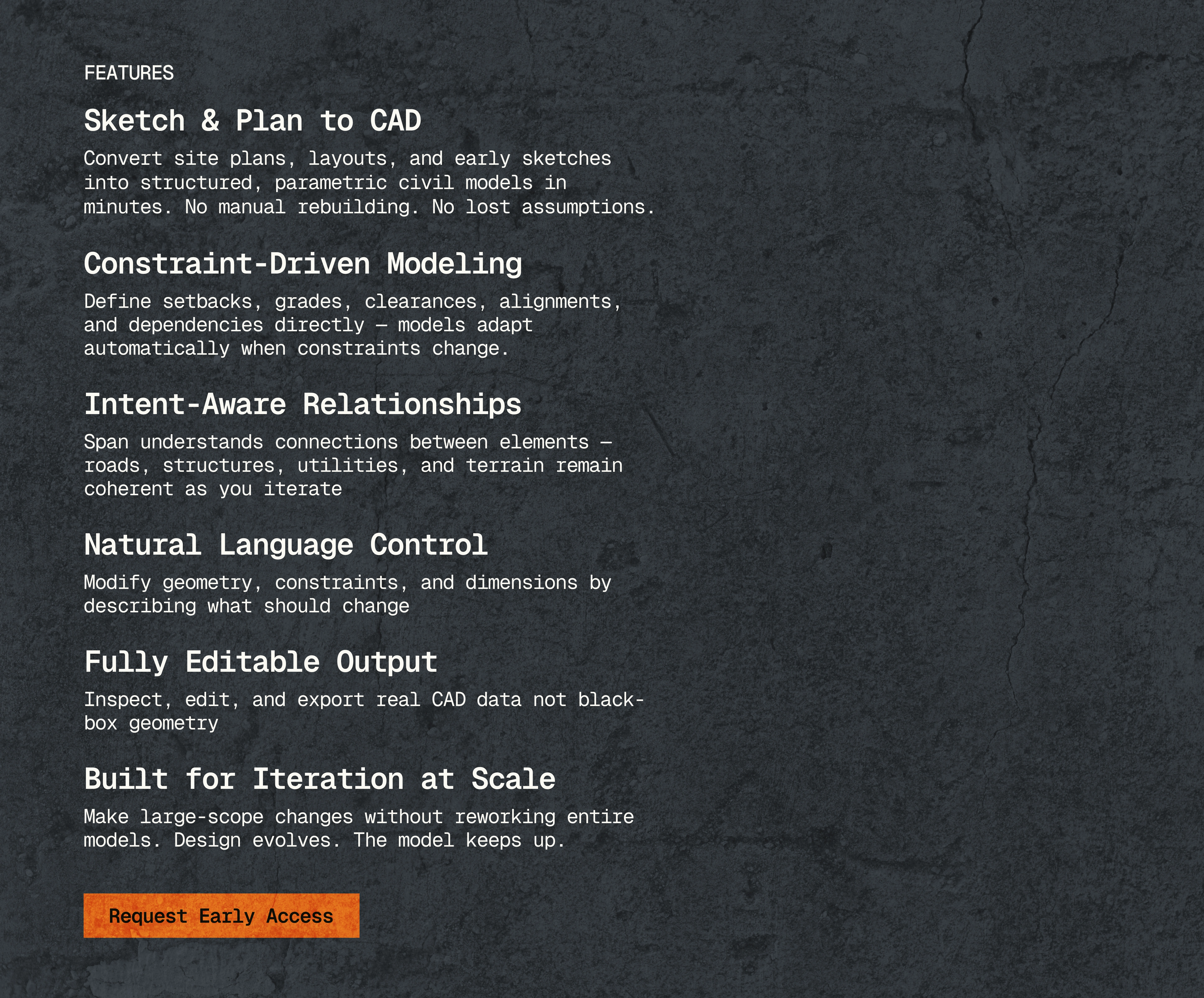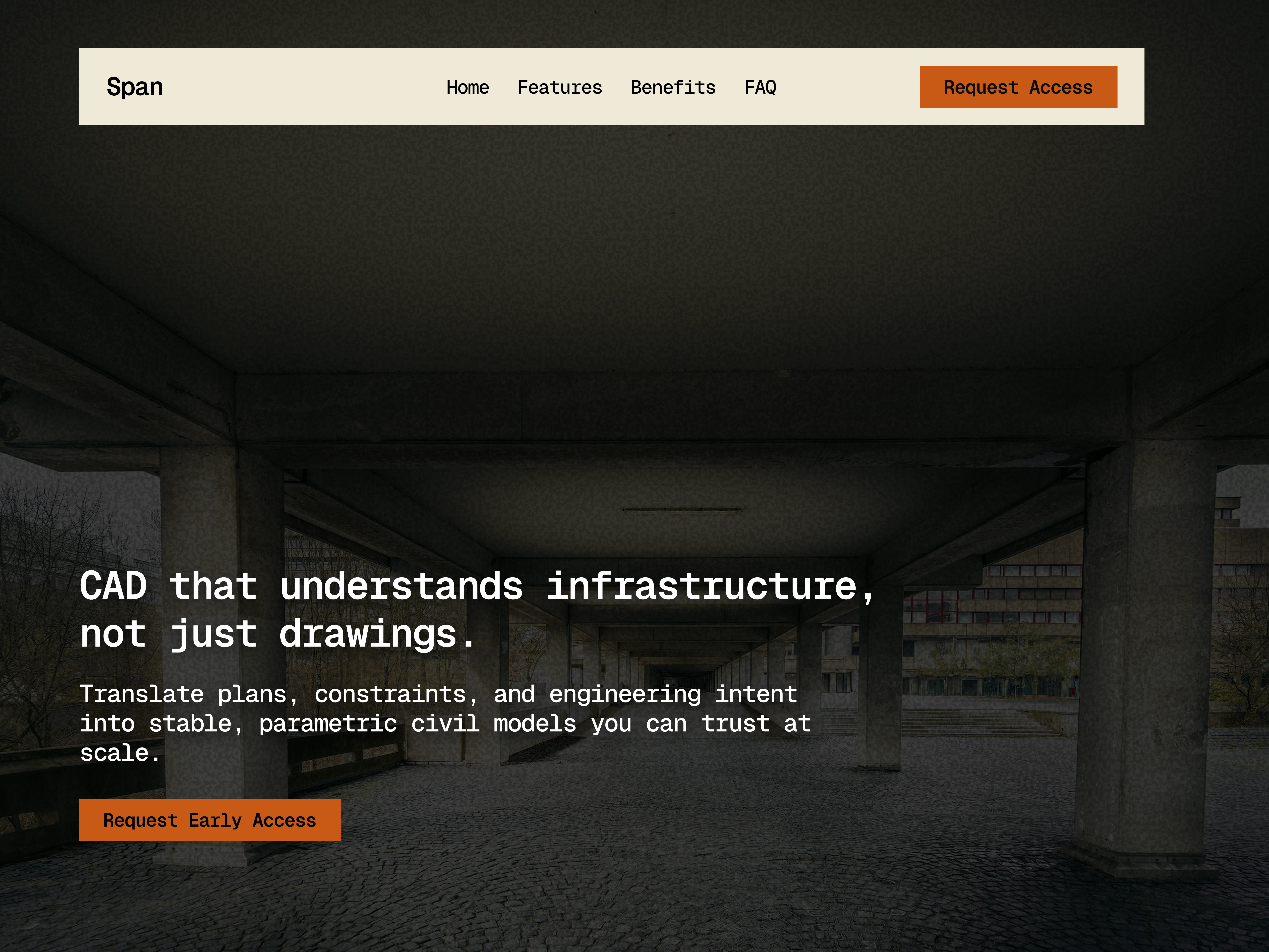 Span was designed with a material-first aesthetic. Leveraging concrete, washed textures and real imagery to ground the layout with the dynamism of engineering