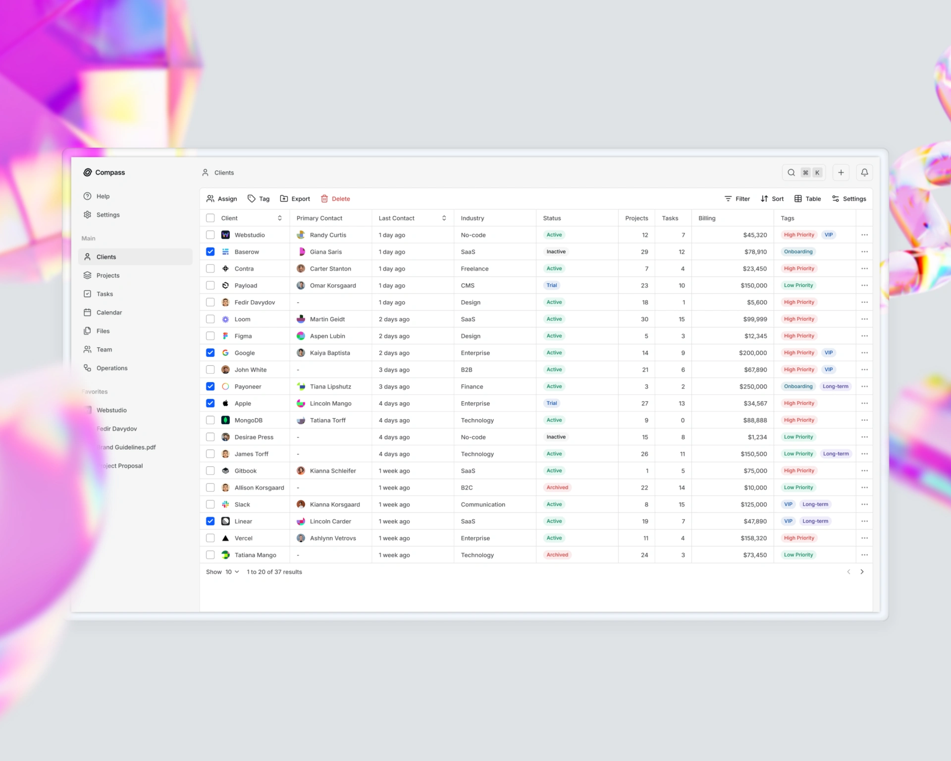 Compass is a carefully crafted CRM UI kit featuring a clean, modern interface designed to simplify the management of clients, projects, tasks, and operations.