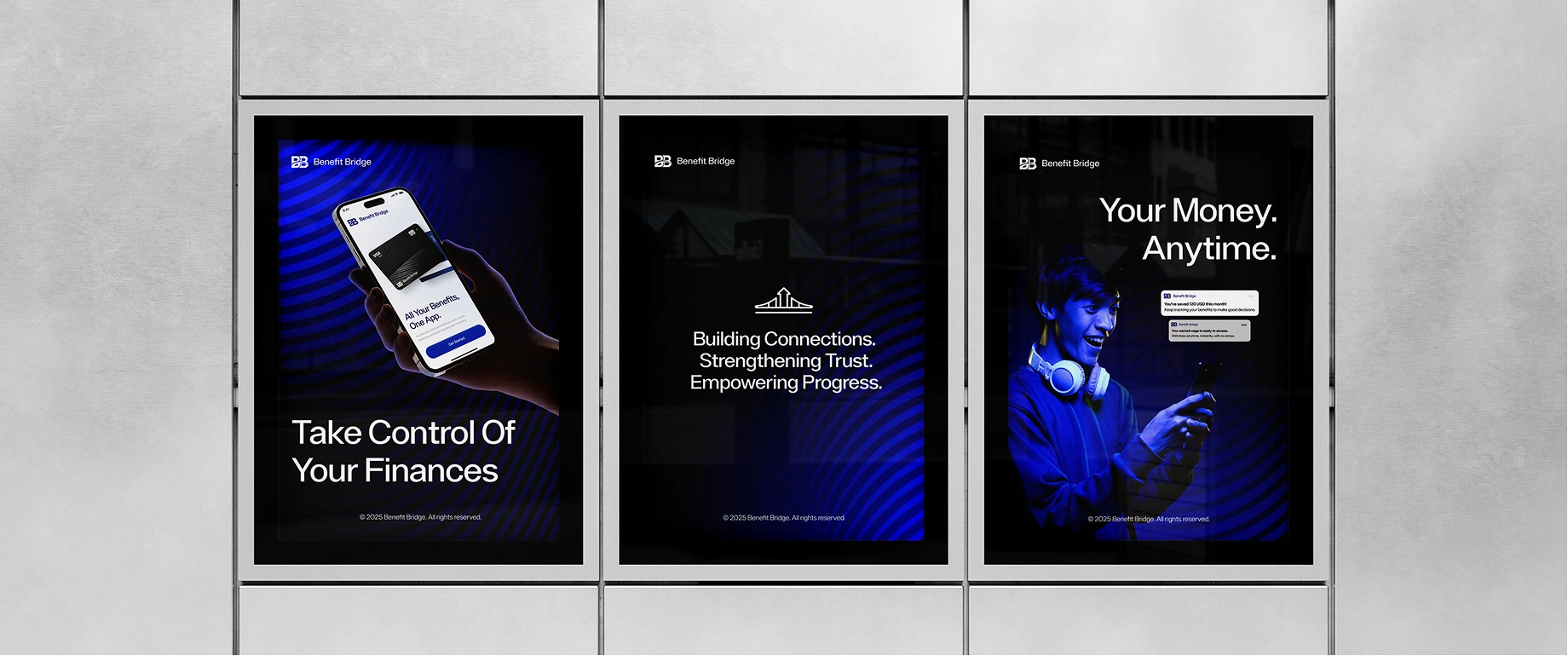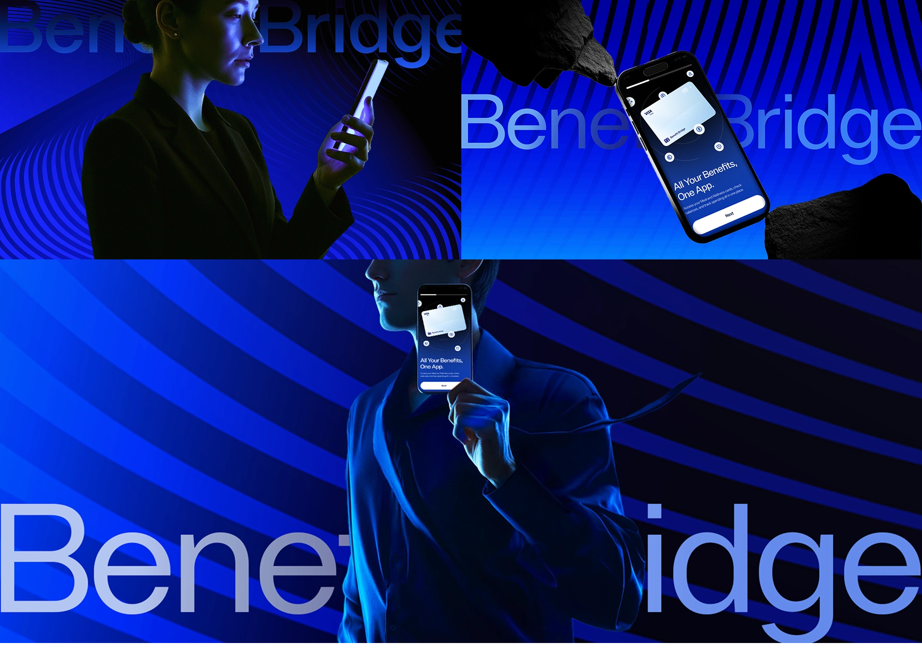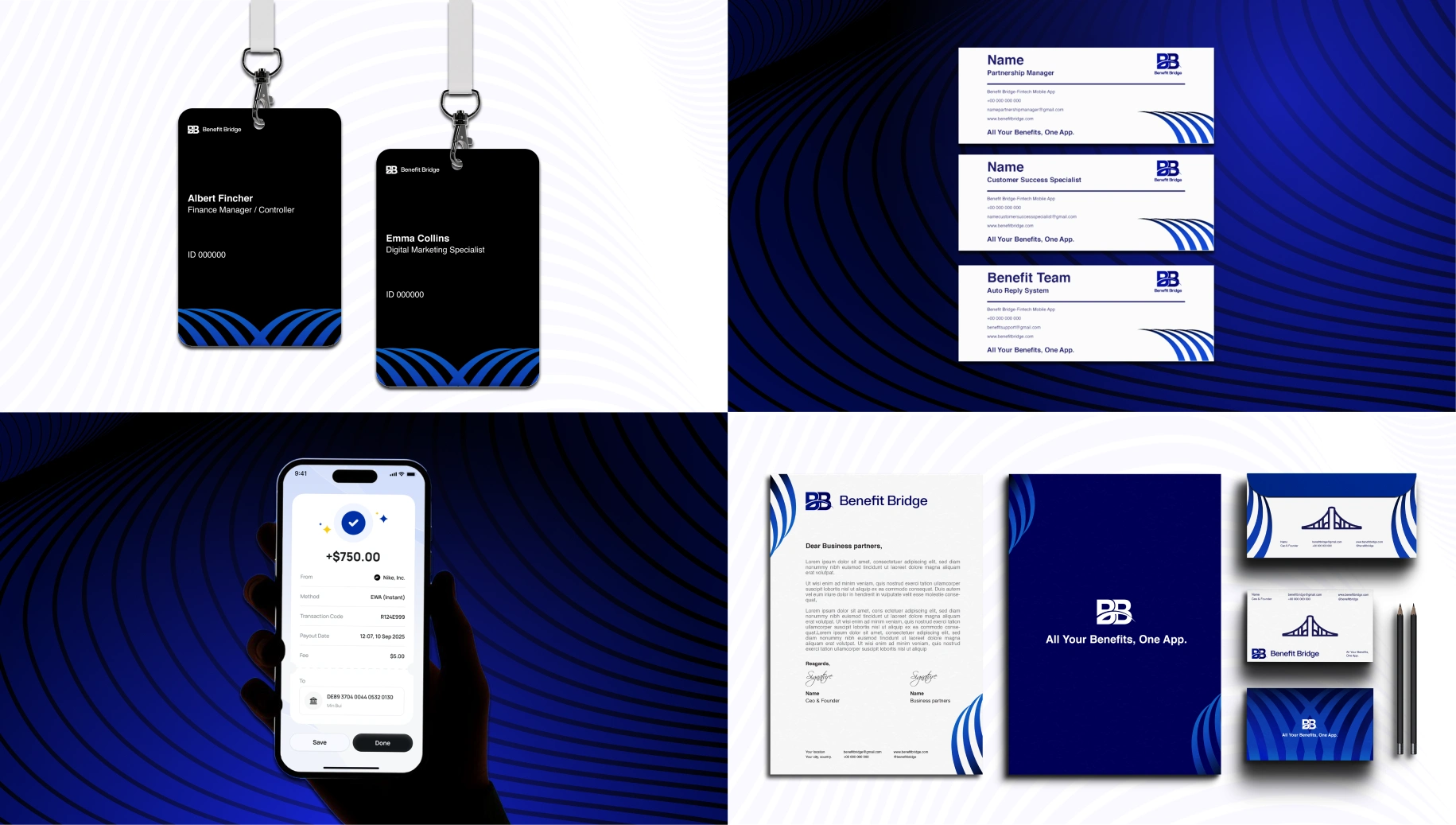 The updated identity system features a more defined logo structure, a balanced visual language, and a unified tone that positions Benefit Bridge as a supportive, modern, and forward-thinking fintech solution.