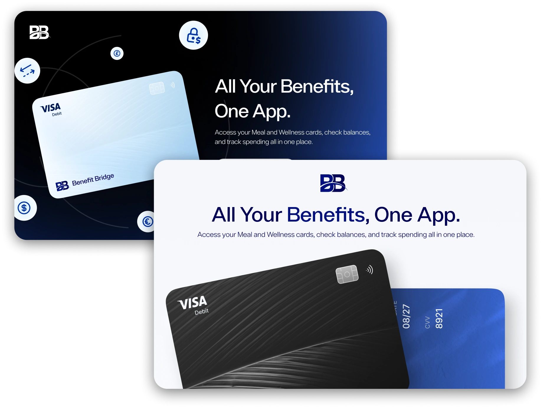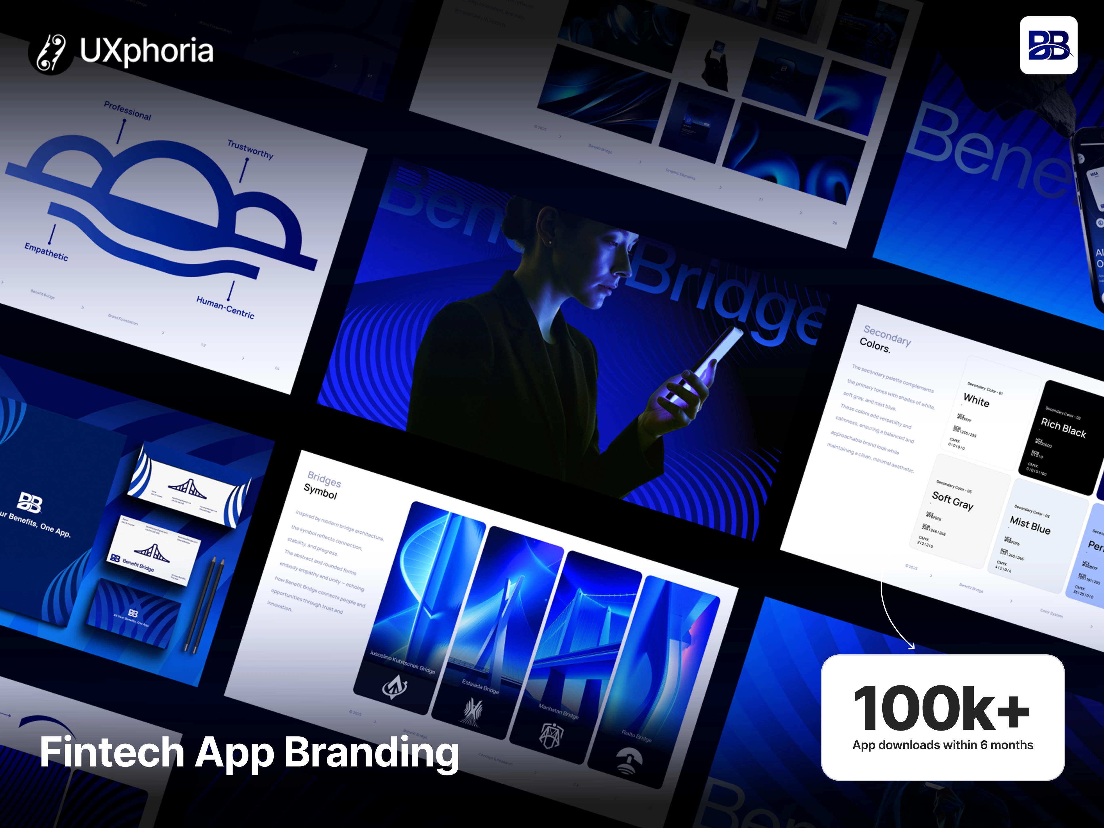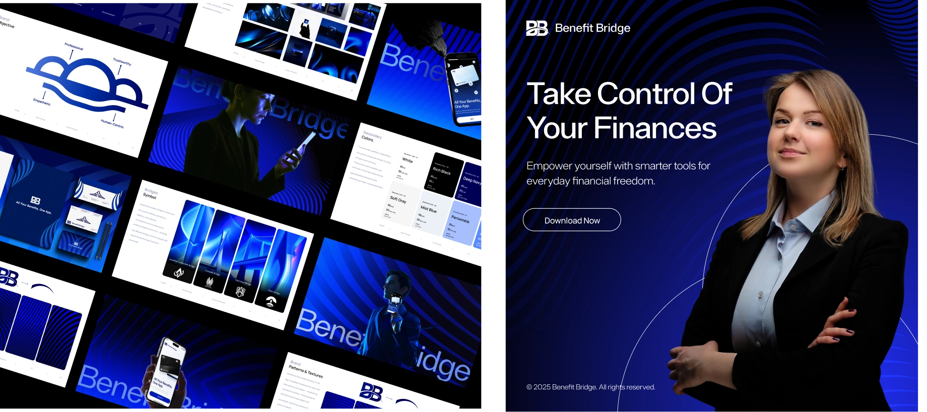 The updated identity system features a more defined logo structure, a balanced visual language, and a unified tone that positions Benefit Bridge as a supportive, modern, and forward-thinking fintech solution.